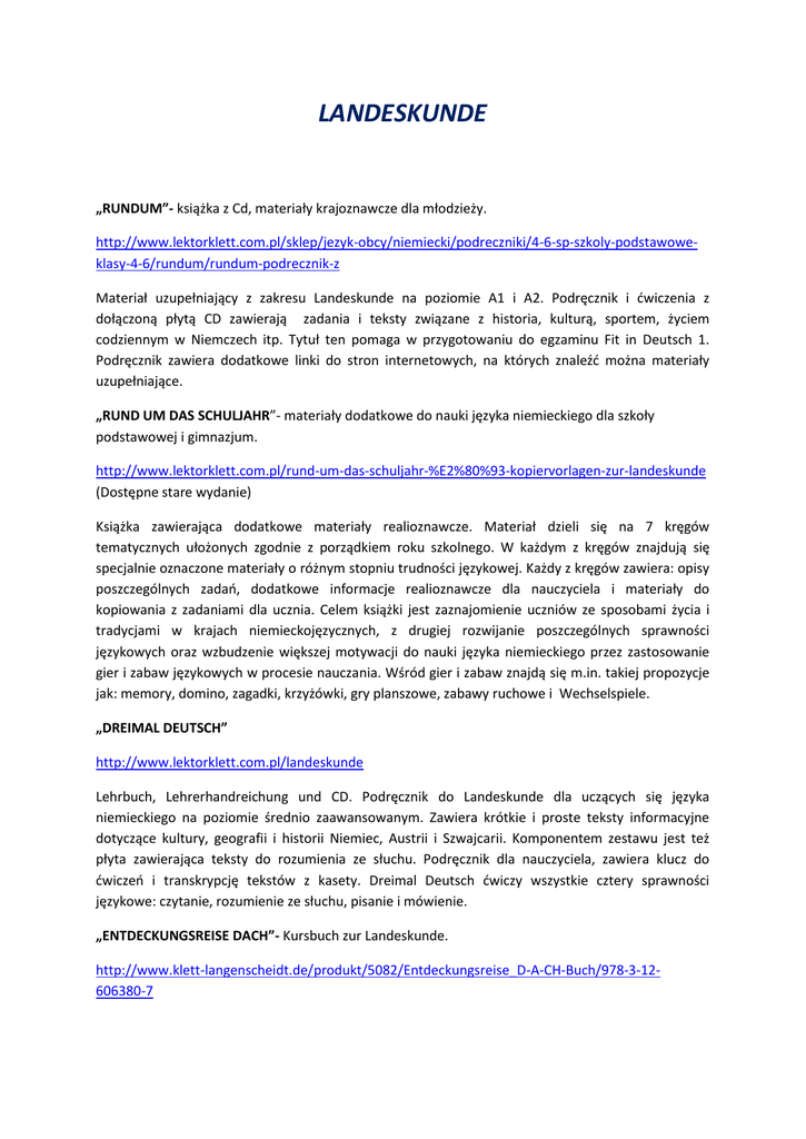 LANDESKUNDE „RUNDUM”- książka z Cd, materiały krajoznawcze dla młodzieży. http://www.lektorklett.com.pl/sklep/jezyk-obcy/niemiecki/podreczniki/4-6-sp-szkoly-podstawoweklasy-4-6/rundum/rundum-podrecznik-z Materiał uzupełniający z zakresu Landeskunde na poziomie A1 i A2. Podręcznik i ćwiczenia z dołączoną płytą CD zawierają zadania i teksty związane z historia, kulturą, sportem, życiem codziennym w Niemczech itp. Tytuł ten pomaga w przygotowaniu do egzaminu Fit in Deutsch 1. Podręcznik zawiera dodatkowe linki do stron internetowych, na których znaleźć można materiały uzupełniające. „RUND UM DAS SCHULJAHR”- materiały dodatkowe do nauki języka niemieckiego dla szkoły podstawowej i gimnazjum. http://www.lektorklett.com.pl/rund-um-das-schuljahr-%E2%80%93-kopiervorlagen-zur-landeskunde (Dostępne stare wydanie) Książka zawierająca dodatkowe materiały realioznawcze. Materiał dzieli się na 7 kręgów tematycznych ułożonych zgodnie z porządkiem roku szkolnego. W każdym z kręgów znajdują się specjalnie oznaczone materiały o różnym stopniu trudności językowej. Każdy z kręgów zawiera: opisy poszczególnych zadań, dodatkowe informacje realioznawcze dla nauczyciela i materiały do kopiowania z zadaniami dla ucznia. Celem książki jest zaznajomienie uczniów ze sposobami życia i tradycjami w krajach niemieckojęzycznych, z drugiej rozwijanie poszczególnych sprawności językowych oraz wzbudzenie większej motywacji do nauki języka niemieckiego przez zastosowanie gier i zabaw językowych w procesie nauczania. Wśród gier i zabaw znajdą się m.in. takiej propozycje jak: memory, domino, zagadki, krzyżówki, gry planszowe, zabawy ruchowe i Wechselspiele. „DREIMAL DEUTSCH” http://www.lektorklett.com.pl/landeskunde Lehrbuch, Lehrerhandreichung und CD. Podręcznik do Landeskunde dla uczących się języka niemieckiego na poziomie średnio zaawansowanym. Zawiera krótkie i proste teksty informacyjne dotyczące kultury, geografii i historii Niemiec, Austrii i Szwajcarii. Komponentem zestawu jest też płyta zawierająca teksty do rozumienia ze słuchu. Podręcznik dla nauczyciela, zawiera klucz do ćwiczeń i transkrypcję tekstów z kasety. Dreimal Deutsch ćwiczy wszystkie cztery sprawności językowe: czytanie, rozumienie ze słuchu, pisanie i mówienie. „ENTDECKUNGSREISE DACH”- Kursbuch zur Landeskunde. http://www.klett-langenscheidt.de/produkt/5082/Entdeckungsreise_D-A-CH-Buch/978-3-12606380-7 „BILDERBOGEN DACH”- (PŁYTA DVD)- Viedoreportagen zur Landeskunde. Seria reportaży na poziom A1/ A2 -zawiera 12 tematów krajoznawczych z państw niemieckojęzycznych. http://www.langenscheidt.pl/oferta/podreczniki/realioznawstwo/bilderbogen_d_a_ch.html Krótkie czterominutowe filmy przedstawiają miasta i krainy, wywiady i historyczne atrakcje Niemiec, Austrii i Szwajcarii. Do każdego tematu dołączono po 2-3 ćwiczenia na DVD, sprawdzające rozumienie. Wydawnictwo Hueber „ZUR ORIENTIERUNG”- materiały krajoznawcze. http://sklep.macmillan.pl/landeskunde/zur-orientierung,p-952-1315 www.hueber.de/orientierung Książka Zur Orientierung przeznaczona jest dla osób, które chcą przygotować się do życia w Niemczech, jako swojej nowej ojczyźnie. Pomaga w ciągu 30 godzin poznać w stopniu podstawowym m.in. kulturę, politykę, historię, prawo i religię. Materiał dźwiękowy znajduje się na dołączonej do podręcznika płycie CD. Dodatkowe materiały dla nauczyciela, przydatne w prowadzeniu kursu na podstawie Zur Orientirung dostępne są na stronie internetowej wydawnictwa. „ZWISCHENDURCH MAL … LANDESKUNDE”- Kristine Dahmen / Dieter Neidlinger / Silke Pasewalck / Franz Specht / Wiebke Heuer. http://sklep.macmillan.pl/component/ssshop/zwischendurch-mal-landeskunde,p-953-1313 Książka zawiera 45 tekstów o tematyce Landeskunde poruszających 15 różnorodnych zagadnień np. ludzie i miejsca, zdrowie, transport, polityka i historia. Każdy tekst wzbogacony interesującymi zdjęciami zawiera ćwiczenia sprawdzające jego rozumienie oraz listę najważniejszych słów. „DER GROSSE DEUTSCHLAND-ATLAS”. Materiały krajoznawcze Instytutu Goethego w formie atlasu.