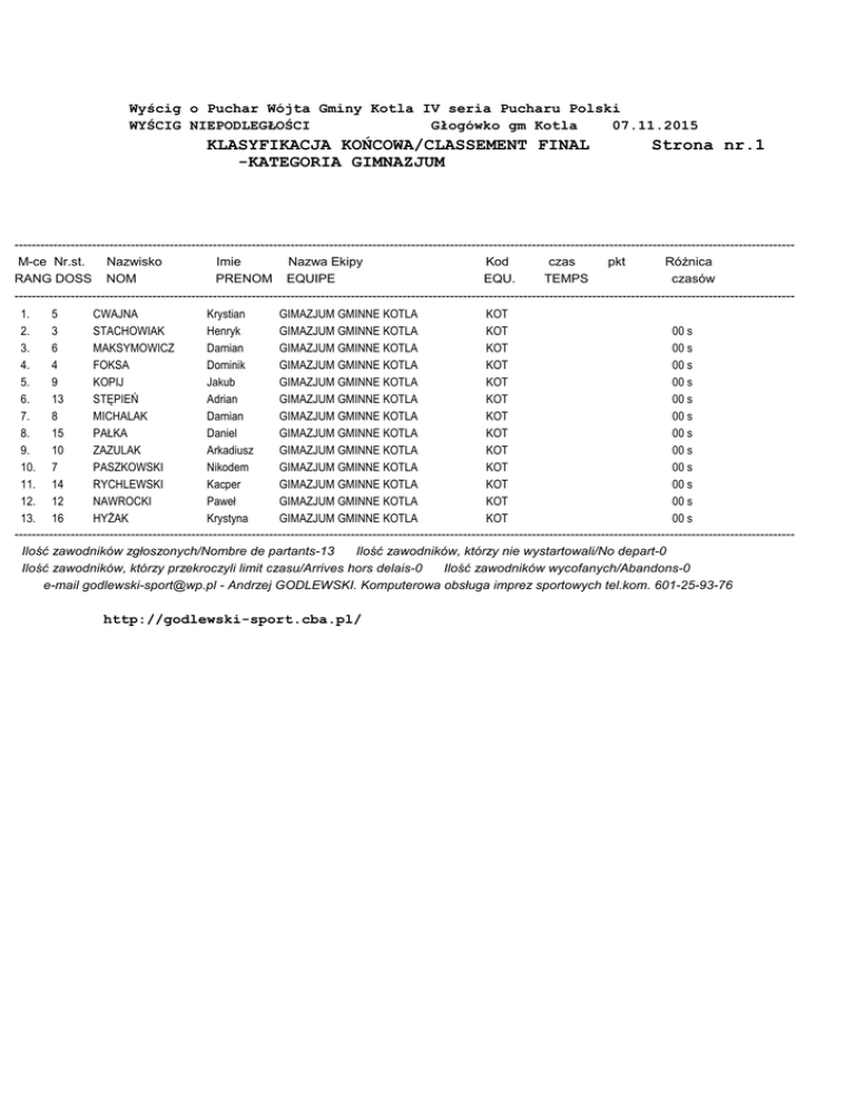 Wyścig o Puchar Wójta Gminy Kotla IV seria Pucharu Polski WYŚCIG NIEPODLEGŁOŚCI Głogówko gm Kotla 07.11.2015 KLASYFIKACJA KOŃCOWA/CLASSEMENT FINAL -KATEGORIA GIMNAZJUM Strona nr.1 ------------------------------------------------------------------------------------------------------------------------------------------------------------------------------------M-ce Nr.st. Nazwisko Imie Nazwa Ekipy Kod czas pkt Różnica RANG DOSS NOM PRENOM EQUIPE EQU. TEMPS czasów ------------------------------------------------------------------------------------------------------------------------------------------------------------------------------------1. 5 CWAJNA Krystian GIMAZJUM GMINNE KOTLA KOT 2. 3 STACHOWIAK Henryk GIMAZJUM GMINNE KOTLA KOT 00 s 3. 6 MAKSYMOWICZ Damian GIMAZJUM GMINNE KOTLA KOT 00 s 4. 4 FOKSA Dominik GIMAZJUM GMINNE KOTLA KOT 00 s 5. 9 KOPIJ Jakub GIMAZJUM GMINNE KOTLA KOT 00 s 6. 13 STĘPIEŃ Adrian GIMAZJUM GMINNE KOTLA KOT 00 s 7. 8 MICHALAK Damian GIMAZJUM GMINNE KOTLA KOT 00 s 8. 15 PAŁKA Daniel GIMAZJUM GMINNE KOTLA KOT 00 s 9. 10 ZAZULAK Arkadiusz GIMAZJUM GMINNE KOTLA KOT 00 s 10. 7 PASZKOWSKI Nikodem GIMAZJUM GMINNE KOTLA KOT 00 s 11. 14 RYCHLEWSKI Kacper GIMAZJUM GMINNE KOTLA KOT 00 s 12. 12 NAWROCKI Paweł GIMAZJUM GMINNE KOTLA KOT 00 s 13. 16 HYŻAK Krystyna GIMAZJUM GMINNE KOTLA KOT 00 s ------------------------------------------------------------------------------------------------------------------------------------------------------------------------------------Ilość zawodników zgłoszonych/Nombre de partants-13 Ilość zawodników, którzy nie wystartowali/No depart-0 Ilość zawodników, którzy przekroczyli limit czasu/Arrives hors delais-0 Ilość zawodników wycofanych/Abandons-0 e-mail [email protected] - Andrzej GODLEWSKI. Komputerowa obsługa imprez sportowych tel.kom. 601-25-93-76 http://godlewski-sport.cba.pl/