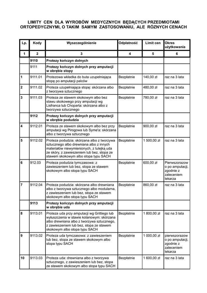 LIMITY CEN DLA WYROBÓW MEDYCZNYCH BĘDĄCYCH PRZEDMIOTAMI ORTOPEDYCZNYMI, O TAKIM SAMYM ZASTOSOWANIU, ALE RÓZNYCH CENACH Lp. Kody Wyszczególnienie 1 2 3 Odpłatność 4 Limit cen 5 Okres użytkowania 6 9110 Protezy kończyn dolnych 9111 Protezy kończyn dolnych przy amputacji w obrębie stopy 1 9111.01 Protezowa wkładka do buta uzupełniająca stopę po amputacji palców Bezpłatnie 140,00 zł raz na 3 lata 2 9111.02 Proteza uzupełniająca stopę: skórzana albo z tworzywa sztucznego Bezpłatnie 480,00 zł raz na 3 lata 3 9111.03 Proteza ze stawem skokowym albo bez stawu skokowego przy amputacji wg Lisfranca lub Choparta: skórzana albo z tworzywa sztucznego Bezpłatnie 780,00 zł raz na 3 lata 9112 Protezy kończyn dolnych przy amputacji w obrębie podudzia 4 9112.01 Proteza ze stawem skokowym albo bez przy Bezpłatnie amputacji wg Pirogowa lub Syme'a: skórzana albo z tworzywa sztucznego 900,00 zł raz na 3 lata 5 9112.02 Proteza podudzia: skórzana albo z tworzywa sztucznego albo drewniana albo z innych materiałów niewymienionych, z tulejką uda ze skóry, z zawieszeniem lub bez, stopa ze stawem skokowym albo stopa typu SACH Bezpłatnie 1 500,00 zł raz na 3 lata 6 912.03 Proteza podudzia tymczasowa: z zawieszeniem lub bez, stopa ze stawem skokowym albo stopa typu SACH Bezpłatnie 600,00 zł Pierwszorazow o po amputacji, zgodnie z zaleceniem lekarza 7 9112.04 Proteza podudzia: skórzana albo drewniana Bezpłatnie albo z tworzywa sztucznego albo modularna, z zawieszeniem lub bez, stopa ze stawem skokowym albo stopa typu SACH 860,00 zł raz na 3 lata 9113 Protezy kończyn dolnych przy amputacji w obrębie uda 8 9113.01 Proteza uda przy amputacji wg Grittiego lub Bezpłatnie wyłuszczenia w stawie kolanowym: skórzana albo drewniana albo z tworzywa sztucznego, z zawieszeniem lub bez, stopa ze stawem skokowym albo stopa typu SACH 1 800,00 zł raz na 3 lata 9 9113.02 Proteza uda tymczasowa: z zawieszeniem lub bez, stopa ze stawem skokowym albo stopa typu SACH Bezpłatnie 1 000,00 zł pierwszorazow o po amputacji, zgodnie z zaleceniem lekarza 10 9113.03 Proteza uda: drewniana albo z tworzywa Bezpłatnie sztucznego, z zawieszeniem lub bez, stopa ze stawem skokowym albo stopa typu SACH 1 600,00 zł raz na 3 lata 11 9113.04 Proteza uda z lejem kikutowym skórzanym: goleń i kolano drewniane albo goleń i kolano z tworzywa sztucznego albo goleń ze skóry albo z drewna albo z tworzywa, z zawieszeniem lub bez, stopa ze stawem skokowym albo stopa typu SACH Bezpłatnie 1 700,00 zł raz na 3 lata 12 9113.05 Proteza uda modularna: z miękkim Bezpłatnie pokryciem ciałopodobnym albo proteza wykonana z innych niewymienionych materiałów, z zawieszeniem lub bez, stopa ze stawem skokowym albo stopa typu SACH 2 800,00 zł raz na 3 lata 13 9113.06 Proteza uda szczudłowa Bezpłatnie 470,00 zł raz na 3 lata 9114 Protezy kończyn dolnych przy pełnej amputacji w obrębie uda (wyłuszczenie w stawie biodrowym) 14 9114.01 Proteza przy wyłuszczeniu w stawie biodrowym: typ kanadyjski albo konwencjonalny, stopa ze stawem skokowym albo stopa typu SACH Bezpłatnie 3 000,00 zł raz na 3 lata 15 9114.02 Proteza tymczasowa przy wyłuszczeniu w stawie biodrowym: stopa ze stawem skokowym albo stopa typu SACH Bezpłatnie 2 600,00 zł pierwszorazow o po amputacji, zgodnie z zaleceniem lekarz 16 9114.03 Kosz biodrowy przy obustronnym wyłuszczeniu w stawach biodrowych: skórzany albo z tworzywa sztucznego, z uchwytami dla kończyn górnych Bezpłatnie 1 100,00 zł raz na 3 lata 17 9114.04 Protezowe wyrównanie skrótu kończyny dolnej: stopa ze stawem skokowym albo stopa typu SACH, z zawieszeniem lub bez Bezpłatnie 1 200,00 zł raz na 3 lata 9115 Wyposażenie dodatkowe do protez kończyn dolnych 18 9115.01 Pończocha kikutowa - przy amputacji w obrębie stopy Bezpłatnie 12 sztuk na każdą kończynę 18,00 zł raz na 1 rok 19 9115.02 Pończocha kikutowa - przy amputacji podudzia Bezpłatnie 12 sztuk na każdą kończynę 18,00 zł raz na 1 rok 20 9115.03 Pończocha kikutowa - przy amputacji uda Bezpłatnie 12 17,00 zł sztuk na każdą kończynę raz na 1 rok 21 9115.04 Pończocha kikutowa albo majteczki przy Bezpłatnie jednostronnej pełnej amputacji kończyny 12 sztuk dolnej albo majteczki przy obustronnej pełnej amputacji kończyn dolnych 9120 Protezy kończyn górnych 22 9120.01 Proteza kosmetyczna części ręki 23 9120.02 Proteza kosmetyczna przedramienia: skórzana albo z tworzywa sztucznego, z dłonią protezową, z zawieszeniem lub bez 30,00 zł raz na 1 rok Bezpłatnie 370,00 zł raz na 3 lata Bezpłatnie 550,00 zł raz na 3 lata 24 9120.03 Proteza kosmetyczna przedramienia: z elementów modularnych, z miękkim pokryciem ciałopodobnym, z dłonią protezową, z zawieszeniem lub bez Bezpłatnie 650,00 zł raz na 3 lata 25 9120.04 Proteza kosmetyczna przedramienia: skórzana albo z tworzywa sztucznego, z tulejką ramienia, z dłonią protezową Bezpłatnie 650,00 zł raz na 3 lata 26 9120.05 Proteza kosmetyczna przedramienia: z elementów modularnych, z tulejką ramienia, z miękkim pokryciem ciałopodobnym, z dłonią protezową Bezpłatnie 850,00 zł raz na 3 lata 27 9120.06 Proteza kosmetyczna ramienia: z elementów Bezpłatnie modularnych, z miękkim pokryciem ciałopodobnym, z dłonią protezową, z zawieszeniem lub bez 1 100,00 zł raz na 3 lata 28 9120.07 Proteza kosmetyczna ramienia: skórzana albo z tworzywa sztucznego, lej ze skóry albo z tworzywa, z dłonią protezową, z zawieszeniem lub bez Bezpłatnie 950,00 zł raz na 3 lata 29 9120.08 Proteza kosmetyczna całej kończyny górnej: ze stawem barkowym albo bez stawu barkowego: skórzana albo z tworzywa sztucznego, z dłonią protezową, z zawieszeniem lub bez Bezpłatnie 1 000,00 zł raz na 3 lata 30 9120.09 Proteza kosmetyczna całej kończyny górnej: ze stawem barkowym albo bez stawu barkowego, z elementów modularnych, z miękkim pokryciem ciałopodobnym, z dłonią protezową, z zawieszeniem lub bez Bezpłatnie 1 600,00 zł raz na