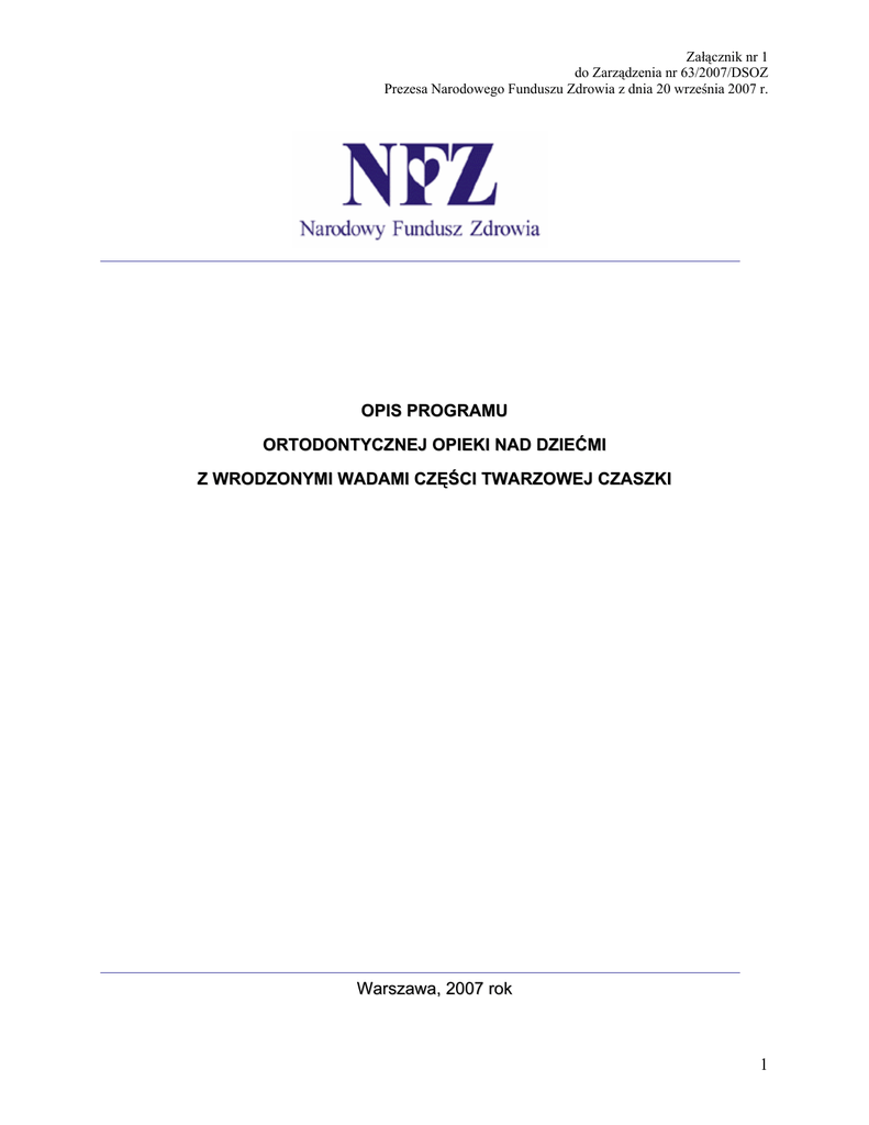 Załącznik nr 1 do Zarządzenia nr 63/2007/DSOZ Prezesa Narodowego Funduszu Zdrowia z dnia 20 września 2007 r. OPIS PROGRAMU ORTODONTYCZNEJ OPIEKI NAD DZIEĆMI Z WRODZONYMI WADAMI CZĘŚCI TWARZOWEJ CZASZKI Warszawa, 2007 rok 1 Załącznik nr 1 do Zarządzenia nr 63/2007/DSOZ Prezesa Narodowego Funduszu Zdrowia z dnia 20 września 2007 r. 1. Uzasadnienie celowości wdrożenia programu Opis problemu Częstość występowania rozszczepów w obrębie części twarzowej czaszki wg różnych źródeł wynosi od 1 do 2 na 1 000 żywo urodzonych noworodków. Według Europejskiego Rejestru Wad Rozwojowych (EUROCAT), w którym zebrane są dane z 20 państw europejskich wskaźnik występowania w/w rozszczepów wynosi 1,55 na 1 000. W Polsce przybywa rocznie na około 400 000 żywo urodzonych noworodków, 800 dzieci z rozszczepem (dane z roku 2000). Wśród nich 40% to dzieci z najbardziej nasiloną postacią wady – całkowitym jedno- i obustronnym rozszczepem podniebienia pierwotnego i wtórnego - Q 37. Wrodzone wady rozwojowe twarzowej części czaszki stanowią rosnący problem społeczny. Wśród wrodzonych wad rozwojowych twarzowej części czaszki izolowane rozszczepy podniebienia pierwotnego i wtórnego zaliczane są do najpoważniejszych i jednocześnie najczęściej występujących. Jest to wada uwarunkowana wieloczynnikowo, dobrze zdefiniowana i łatwo rozpoznawana już w chwili urodzenia na podstawie obecności szczeliny w obrębie wargi, wyrostka zębodołowego szczęki i/lub podniebienia. Bardzo często rozszczep podniebienia, niedorozwój kości twarzy, a zwłaszcza szczęki i żuchwy, gotyckie podniebienie, makrognacja i mikrognacja, makrogenia i mikrogenia, prognacja, asymetria twarzy, progenia, zgryz głęboki całkowity, nadzgryz (zgryz głęboki częściowy), zgryz krzyżowy, niedorozwój stawu skroniowo-żuchwowego, skośne wyrostki zębodołowe są cechami zespołów wad wrodzonych zlokalizowanymi w obszarze twarzowej części czaszki. W Międzynarodowej Klasyfikacji Wad Wrodzonych będącej częścią Międzynarodowej Klasyfikacji i Problemów Zdrowotnych wady wrodzone są oznaczone literą Q i liczbami (liczbami oznaczone są wyodrębnione grupy wad wrodzonych). Rozszczepy podniebienia oznaczone są następująco: Q-35 rozszczep podniebienia, Q-35 rozszczep wargi i Q-37 rozszczep wargi wraz z rozszczepem podniebienia. Literą Q i liczbami 89, oznaczone są inne wady lub zespoły wad wrodzonych a liczbami 90-99 abberacje chromosomowe. Waga problemu Zniekształcenia morfologiczno-czynnościowe w przypadku wad rozwojowych dotyczą odmiennej budowy czaszki, twarzy, szczęk i zębów oraz zaburzeń w czynności narządu 2 Załącznik nr 1 do Zarządzenia nr 63/2007/DSOZ Prezesa Narodowego Funduszu Zdrowia z dnia 20 września 2007 r. żucia. Szczelina w obrębie wargi i podniebienia prowadzi do zachwiania równowagi czynnościowej struktur części twarzowej czaszki i tworzenia deformacji rzutujących na wygląd twarzy, ustawienie zębów i mowę, które odbijają się niekorzystnie na rozwoju psychicznym i społecznym. Znacznie nasilone odchylenia w ustawieniu i w sposobie zwierania się zębów wymagają specjalistycznego ortodontycznego leczenia głównie z tego powodu, że konieczność leczenia wtórnych zniekształceń szczęk oceniana jest w Polsce na 40% leczonych. Znacznie nasilone zniekształcenia wymagają poważnych i kosztownych zabiegów korekcyjnych, które dla pacjentów są dodatkowym obciążeniem psychicznym. Dotychczasowe próby rozwiązania problemu Dotychczasowe Programy obejmujące leczeniem osoby w wadami wrodzonymi części twarzowej czaszki to: w latach 2000-2002 realizacja przez Ministerstwo Zdrowia – „Programu wielospecjalistycznej opieki nad dziećmi z całkowitym rozszczepem podniebienia pierwotnego i/lub wtórnego”. w 2004 roku realizacja przez Narodowy Fundusz Zdrowia „Programu ortodontycznej opieki nad dziećmi z całkowitym rozszczepem podniebienia pierwotnego i/lub wtórnego na rok 2004”, w 2005 roku realizacja przez Narodowy Fundusz Zdrowia „Programu ortodontycznej opieki nad dziećmi z wrodzonymi wadami części twarzowej czaszki na rok 2005”. w 2006-2007 roku realizacja przez Narodowy Fundusz Zdrowia „Programu ortodontycznej opieki nad dziećmi z wrodzonymi wadami części twarzowej czaszki”. 2. Cel Programu Celem Programu jest objęcie specjalistycznym leczeniem ortodontycznym populacji osób z wrodzonymi wadami rozwojowymi typu rozszczepu podniebienia pierwotnego i/ lub wtórnego oraz anomalii twarzy w zakresie zależnym od rozwoju I i II łuku skrzelowego i ograniczenie u nich zniekształceń morfologiczno-czynnościowych w tym zakresie. 3 Załącznik nr 1 do Zarządzenia nr 63/2007/DSOZ Prezesa Narodowego Funduszu Zdrowia z dnia 20 września 2007 r. Cele pośrednie: 1. Wprowadzenie zasad postępowania w leczeniu osób z wszystkimi typami rozszczepów podniebienia pierwotnego i/lub wtórnego. 2. Wprowadzenie zasad postępowania w leczeniu osób z wadami współwystępującymi z innymi wrodzonymi wadami w obszarze głowy i szyi. zgryzu 3. Podniesienie jakości oraz dostępności do specjalistycznej opieki ortodontycznej dla osób z wadami zgryzu współwystępującymi z innymi wrodzonymi wadami w obszarze głowy i szyi. 3. Sposób realizacji działań podejmowanych w ramach poszczególnych etapów Programu ortodontycznej opieki nad dziećmi z wrodzonymi wadami części twarzowej czaszki Opis populacji, którą należy objąć Programem: 1. Pacjenci z całkowitym jedno- i/ lub obustronnym rozszczepem podniebienia, zgodnie z następującymi kryteriami kwalifikacyjnymi: w okresie przedoperacyjnym: szeroka szczelina, znacznie wysunięta kość przysieczna, pacjenci w okresie pooperacyjnym: zgryz krzyżowy częściowy boczny łącznie ze zgryzem krzyżowym częściowym przednim lub niedorozwojem przedniego odcinka szczęki u pacjentów Q37,1 oraz obustronny zgryz krzyżowy częściowy boczny u pacjentów Q37,0, 2. Pacjenci z 