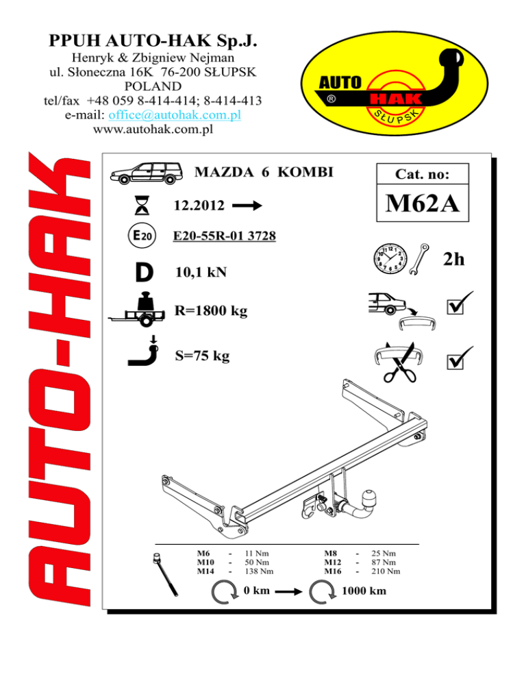 PPUH AUTO-HAK Sp.J. Henryk & Zbigniew Nejman ul. Słoneczna 16K 76-200 SŁUPSK POLAND tel/fax +48 059 8-414-414; 8-414-413 e-mail: [email protected] www.autohak.com.pl AUTO HAK ® MAZDA 6 KOMBI M62A 12.2012 E20 E20-55R-01 3728 D 10,1 kN 2h R=1800 kg S=75 kg M6 M10 M14 - 11 Nm 50 Nm 138 Nm 0 km M8 M12 M16 - 25 Nm 87 Nm 210 Nm 1000 km OD PRODUCENTA: PL Dziękujemy za wybór produkowanego przez naszą firmę zaczepu kulowego. Jego niezawodność została potwierdzona licznymi testami oraz opiniami zadowolonych klientów. Jednakże niezawodność zaczepów kulowych jest zależna również od prawidłowego montażu oraz prawidłowej eksploatacji. Z tego powodu prosimy Państwa o staranne przeczytanie niniejszej instrukcji montażu oraz przestrzeganie właściwych wskazówek. Zaczep należy zamontować w miejscach do tego celu przeznaczonych przez producenta samochodu. FROM MANUFACTURER: GB Thank you for buying our product. Their reliability has been confirmed in many tests. Reliability of towbar depends also on correct assembly and right operation. For this reasons we kindly ask to read carefully this instruction and apply to hints. The towbar should be install in points described by a car producer. VON DEM HERSTELLER: D Die Zuverlässigkeit der Anhängekupplung ist jedoch auch von der ordnungsgemäßen Montage und der richtigen Nutzung abhängig. Daher werden Sie gebeten, sorgfältig die folgende Montageanleitung zu lesen und sich an die entsprechenden Anweisungen zu halten. Die Anhängekupplung muss an den vom Fahrzeughersteller vorgeschriebenen Befestigungsstellen montiert werden. DE LA PART DU FABRICANT: F Merci d'avoir choisi le dispositif d'attelage à boule produit par notre société. Sa fiabilité a été confirmée par de nombreux tests et par les opinions positives des clients. Toutefois, la fiabilité des dispositifs d'attelage à boule dépend aussi de la bonne installation et d'une utilisation conforme. Pour cela, nous vous prions de lire attentivement les instructions de montage et de respecter les conseils prodigués. Le dispositif d'attelage à boule doit être monté dans les emplacements prévus à cet effet par le constructeur de votre voiture. FRA PRODUCENTEN: DK Tak fordi De har valgt vores anhængertræk. Dets pålidelighed er blevet bekræftet i mange undersøgelser samt af tilfredse kunder. Vores anhængertræks pålidelighed er også afhængig af korrekt montering og korrekt betjening. Af denne grund beder vi Dem at læse denne instruktion grundigt og overholde de korrekte anvisninger. DE PRODUCTOR: E Gracias por la elección del enganche de bola producido por nuestra empresa. Su fiabilidad fue confirmada por numerosos testos y opiniones de los clientes quienes estuvieron contentos. Sin embargo la fiabilidad de enganche de bola depende también de un montaje adecuado y su explotación adecuada. Por esa causa por favor leer atentamente la instrucción del montaje y observar adecuadas indicadoras. VAN DE FABRIKANT: NL Bedankt voor de aanschaf van onze kogeltrekhaak. Hoe betrouwbaar die is blijkt wel uit vele tests en meningen van tevreden klanten. Toch is de betrouwbaarheid van een kogeltrekhaak er mede van afhankelijk dat deze correct gemonteerd is en op de juiste manier wordt gebruikt. Daarom wordt u verzocht deze montagehandleiding zorgvuldig te lezen en de aanwijzingen te volgen. FRA PRODUSENTEN: N Takk for at dere har valgt kulefestet produsert av vårt firma. Driftssikkerheten på kulefestet har blitt bekreftet av flere tester og tilbakemeldinger fra fornøyde kunder. Allikevel er driftssikkerheten også avhengig av en korrekt montering og riktig bruk. Derfor ber vi dere om å lese denne monteringsinstruksen nøye og anbefaler at dere følger veiledningen. ETT BUDSKAP FRÅN TILLVERKAREN: S Vi skulle vilja tacka er för ert val och inköp. Våra dragkrokars pålitlighet har bevisats av olika tester samt referenser från nöjda kunder. Man får inte glömma att dragkrokars pålitlighet beror också på rätt installation och rätt bruk. Därför skulle vi vilja be att ni läser noga denna installationsanvisning och följer alla regler och tips som den anger. Dragkroken ska installeras i ett ställe som blivit påpekade av biltillverkaren. DAL FABBRICANTE: IT -2- Vi ringraziamo per aver scelto il gancio di traino a sfera prodotto dalla nostra azienda. La sua affidabilità è stata confermata da numerosi test e dalle opinioni positive dei clienti. Tuttavia, il perfetto funzionamento dei ganci di traino a sfera dipende anche dalla correttezza del montaggio e dall'utilizzo appropriato. Per questo motivo, Vi preghiamo di leggere attentamente le presenti istruzioni di montaggio e di attenervi alle indicazioni in esse contenute. Il gancio di traino deve essere montato nei punti predisposti a tal fine dal fabbricante del veicolo. PL GB D F A-A DK E NL The clearance specified in appendix VII, diagram 25a/b of Regulation No. 55.01 UN EU must be guaranteed at laden weight of the vehicle. Der Freiraum nach Anhang VII, Abbildung 25a/b der Vorschriften 55.01 EG ist zu gewährleistenbei zulässigem Gesamtgewichtdes Fahrzeuges. Le débattement doit être conforme à l'annexe VII, illustration 25a/b de lamääräykset 55.01 CE pour le poids total en charge autorisé de votre véhicule. I overensstemmelse med bilag VII, figur 25a/b til forordninger 55.01 EF for køretøjets tilladte totalvægt skal der garanteres en friplads. Hay que garantizar un espacio suelto según archivo adjunto VII, ilustración 25a/b regulaciones 55.01 UN EU de peso admisible y total del vehículo. De in bijlage VII afbeelding 25a/b vanreglement 55.01 UN EU gespecificeerde vrije ruimte moet bij een maximale gewichtsbelasting van het voertuig gegarandeerd zijn. N Det skal sørges for fritt rom ifølge vedlegget VII, illustrasjon 25a/b forskrifter 55.01 UN EU ved den tillatte totale vekten av fartøyet. S Man ska garantera ett fritt tillgängligt utrymme - se bilaga VII, diagram 25a/b enligt föreskrifter 55.0