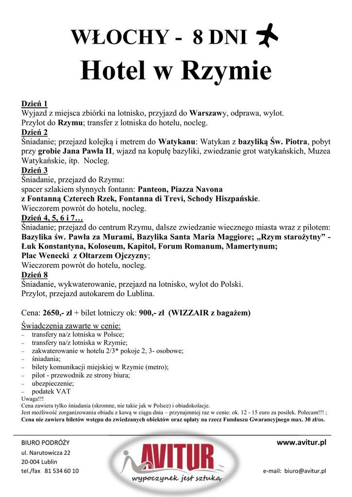 WŁOCHY - 8 DNI Hotel w Rzymie Dzień 1 Wyjazd z miejsca zbiórki na lotnisko, przyjazd do Warszawy, odprawa, wylot. Przylot do Rzymu; transfer z lotniska do hotelu, nocleg. Dzień 2 Śniadanie; przejazd kolejką i metrem do Watykanu: Watykan z bazyliką Św. Piotra, pobyt przy grobie Jana Pawła II, wjazd na kopułę bazyliki, zwiedzanie grot watykańskich, Muzea Watykańskie, itp. Nocleg. Dzień 3 Śniadanie, przejazd do Rzymu: spacer szlakiem słynnych fontann: Panteon, Piazza Navona z Fontanną Czterech Rzek, Fontanna di Trevi, Schody Hiszpańskie. Wieczorem powrót do hotelu, nocleg. Dzień 4, 5, 6 i 7… Śniadanie; przejazd do centrum Rzymu, dalsze zwiedzanie wiecznego miasta wraz z pilotem: Bazylika św. Pawła za Murami, Bazylika Santa Maria Maggiore; „Rzym starożytny” Łuk Konstantyna, Koloseum, Kapitol, Forum Romanum, Mamertynum; Plac Wenecki z Ołtarzem Ojczyzny; Wieczorem powrót do hotelu, nocleg. Dzień 8 Śniadanie, wykwaterowanie, przejazd na lotnisko, wylot do Polski. Przylot, przejazd autokarem do Lublina. Cena: 2650,- zł + bilet lotniczy ok: 900,- zł (WIZZAIR z bagażem) Świadczenia zawarte w cenie: transfery na/z lotniska w Polsce; transfery na/z lotniska w Rzymie; zakwaterowanie w hotelu 2/3* pokoje 2, 3- osobowe; śniadania; bilety komunikacji miejskiej w Rzymie (metro); pilot - przewodnik ze strony biura; ubezpieczenie; podatek VAT Uwaga!!! Cena zawiera tylko śniadania (skromne, nie takie jak w Polsce) i obiadokolacje. Jest możliwość zorganizowania obiadu z kawą w ciągu dnia – przynajmniej raz w cenie: ok. 12 - 15 euro za posiłek. Polecam!!! ; Cena nie zawiera biletów wstępu do zwiedzanych obiektów oraz opłaty na rzecz Funduszu Gwarancyjnego max. 30 zł/os. BIURO PODRÓŻY ul. Narutowicza 22 20-004 Lublin tel./fax 81 534 60 10 www.avitur.pl e-mail: [email protected]