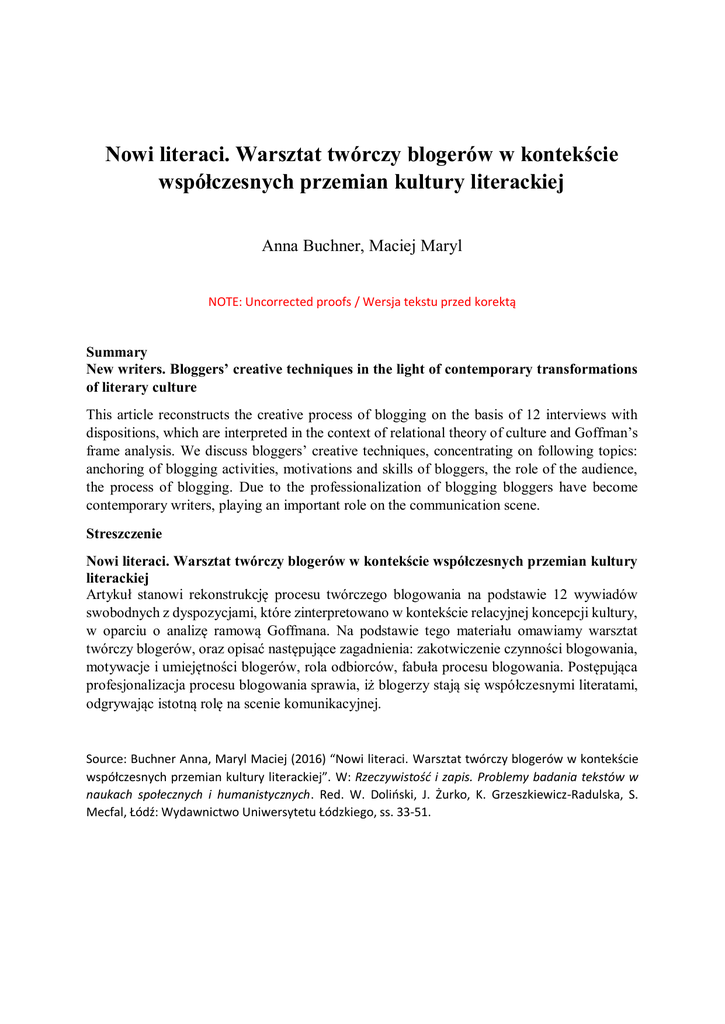 Nowi literaci. Warsztat twórczy blogerów w kontekście współczesnych przemian kultury literackiej Anna Buchner, Maciej Maryl NOTE: Uncorrected proofs / Wersja tekstu przed korektą Summary New writers. Bloggers’ creative techniques in the light of contemporary transformations of literary culture This article reconstructs the creative process of blogging on the basis of 12 interviews with dispositions, which are interpreted in the context of relational theory of culture and Goffman’s frame analysis. We discuss bloggers’ creative techniques, concentrating on following topics: anchoring of blogging activities, motivations and skills of bloggers, the role of the audience, the process of blogging. Due to the professionalization of blogging bloggers have become contemporary writers, playing an important role on the communication scene. Streszczenie Nowi literaci. Warsztat twórczy blogerów w kontekście współczesnych przemian kultury literackiej Artykuł stanowi rekonstrukcję procesu twórczego blogowania na podstawie 12 wywiadów swobodnych z dyspozycjami, które zinterpretowano w kontekście relacyjnej koncepcji kultury, w oparciu o analizę ramową Goffmana. Na podstawie tego materiału omawiamy warsztat twórczy blogerów, oraz opisać następujące zagadnienia: zakotwiczenie czynności blogowania, motywacje i umiejętności blogerów, rola odbiorców, fabuła procesu blogowania. Postępująca profesjonalizacja procesu blogowania sprawia, iż blogerzy stają się współczesnymi literatami, odgrywając istotną rolę na scenie komunikacyjnej. Source: Buchner Anna, Maryl Maciej (2016) “Nowi literaci. Warsztat twórczy blogerów w kontekście współczesnych przemian kultury literackiej”. W: Rzeczywistość i zapis. Problemy badania tekstów w naukach społecznych i humanistycznych. Red. W. Doliński, J. Żurko, K. Grzeszkiewicz-Radulska, S. Mecfal, Łódź: Wydawnictwo Uniwersytetu Łódzkiego, ss. 33-51. Anna Buchner, Maciej Maryl* Nowi literaci. Warsztat twórczy blogerów w kontekście współczesnych przemian kultury literackiej1 Wstęp Blogerzy są współczesnymi literatami, ludźmi pióra, źródłem informacji i opinii. Literat, to ktoś, kto utrzymuje się z pisania utworów literackich lub publicystycznych. Paradoksalnie wielu blogerów może być „w większym stopniu” literatami niż niektórzy pisarze skazani na „podwójne życie” twórców, zarabiających na życie w innych zawodach (Lahire 2010). Ta zmiana statusu blogerów jest konsekwencją rekonfiguracji sceny komunikacyjnej (Hopfinger 2009) i przemiany modelu komunikacji literackiej, polegającej w tym wypadku na powrocie do relacji mniej zinstytucjonalizowanych niż w czasach literatury masowej. Jill Walker Rettberg (2008), autorka jednej z pierwszych naukowych monografii blogowania, zauważa, iż blogów nie należy rozpatrywać wyłącznie w opozycji do mass mediów, lecz w szerszym kontekście przemian komunikacyjnych ostatnich stuleci. Badaczka wskazuje na antecedencje komunikacyjne zarówno w kulturze oralnej (dialog z publicznością), jak i w wynalazku druku (dopuszczenie rzeszy autorów do publikowania) (2008: 31–45). Przyjmując założenie, że nowe media i gatunki nie pojawiają się w próżni, tylko są efektem procesu remediacji, tj. wypadkową znanych środków komunikacji, nowych technologii oraz zapotrzebowania społecznego (Bolter i Grusin 2000), uznajemy blogowanie za nową formę komunikacji literackiej, mocno zakorzenioną w dotychczasowych praktykach komunikacyjnych. W efekcie remediacji „stare” gatunki zostają uzupełnione o własności nowego medium. * Doktor Anna Buchner, doktor Maciej Maryl, Centrum Humanistyki Cyfrowej Instytutu Badań Literackich Polskiej Akademii Nauk w Warszawie; [email protected], Maciej.Maryl@ ibl.waw.pl. 1 Artykuł powstał w ramach projektu Blog jako nowa forma piśmiennictwa multimedialnego, sfinansowanego ze środków Narodowego Centrum Nauki przyznanych na podstawie decyzji numer DEC-2011/03/N/HS2/06232. 33 34 Anna Buchner, Maciej Maryl Opisując model komunikacji literackiej w czasach druku masowego, Stefan Żółkiewski (1980) – prócz zaprezentowania najszerzej chyba znanej koncepcji „obiegów” – zdefiniował dość statycznie role partnerów komunikacji literackiej. Badacz wyróżnił przy tym nadawcę w wąskim i szerokim znaczeniu, czyli z jednej strony autora utworu, a z drugiej ogół instytucji biorących udział w jego wytworzeniu i upowszechnieniu (redakcja, cenzura, wydawnictwa, biblioteki) (Żółkiewski 1980: 104, 138; por. Maryl 2012: 85). Współczesna kultura literacka, zwłaszcza za sprawą narzędzi elektronicznych, zaciera ten podział. W niniejszym tekście patrzymy na twórcę jako na nadawcę w szerszym znaczeniu. Nie traktujemy go tu jako trybika, pełniącego określoną funkcję w statycznym, jednokierunkowym modelu nadawca–pośrednik–odbiorca. Głównym celem takiego modelu jest bowiem dyfuzja utworu do społeczeństwa, a wraz z nim, doniosłych dla wspólnoty idei. Takie podejście okazuje się niewystarczające do opisu zjawisk cyfrowych, których natura jest odmienna od wskazanego modelu. Unaocznia to choćby problem „wreadera” (z ang. writerreader: pisarz-czytelnik), czyli zjawiska daleko posuniętej płynności ról komunikacyjnych (Landow 1997). Odchodząc od antysymetrycznych problematyzacji, przyjmujemy relacyjną koncepcję kultury zaproponowaną przez Krajewskiego (2013) przynajmniej z dwóch względów: po pierwsze pozwala ona odwrócić uwagę od głównych aktorów życia społecznego i skupić się na zjawiskach marginalizowanych, jak „przedmioty, wytwory popkultury, mody i sieciowe wariactwa (crazes), niszowe snobizmy, działania pojedynczych jednostek” (Krajewski 2013: 38). Pozwala nam to z powodzeniem zająć się blogerami jako współczesnymi literatami, nie bacząc na to, że pozostają oni poza nawiasem bardziej konserwatywnych definicji pola literackiego. Po drugie kon