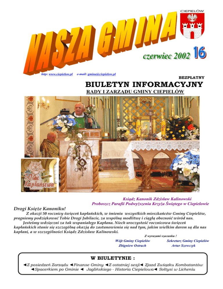 http: www.ciepielow.pl e-mail: [email protected] BEZPŁATNY BIULETYN INFORMACYJNY RADY I ZARZĄDU GMINY CIEPIELÓW Ksiądz Kanonik Zdzisław Kalinowski Proboszcz Parafii Podwyższenia Krzyża Świętego w Ciepielowie Drogi Księże Kanoniku! Z okazji 50 rocznicy święceń kapłańskich, w imieniu wszystkich mieszkańców Gminy Ciepielów, pragniemy podziękować Tobie Drogi Jubilacie, za wspólną modlitwę i ciągłą obecność wśród nas. Jesteśmy wdzięczni za tak wspaniałego Kapłana. Niech uroczystość rocznicowa święceń kapłańskich stanie się szczególną okazją do zastanowienia się nad tym, jakim wielkim darem są dla nas kapłani, a w szczególności Ksiądz Zdzisław Kalinowski. Z wyrazami szacunku ! Wójt Gminy Ciepielów Zbigniew Ostrach Sekretarz Gminy Ciepielów Artur Szewczyk W BIULETYNIE : ◄Z posiedzeń Zarządu ◄Finanse Gminy ◄Z ostatniej sesji◄ Zjazd Związku Kombatantów ◄Spacerkiem po Gminie ◄ Jaglińskiego - Historia Ciepielowa◄ Sołtysi w Licheniu Z POSIEDZEŃ ZARZĄDU 11 marca -na czwartym w tym roku posiedzeniu Zarząd pod przewodnictwem Wójta Gminy Zbigniewa Ostarcha przyjął sprawozdanie z realizacji budżetu za 2001 rok. 27 marca – przyjęto uchwałę w sprawie określenia harmonogramu dochodów i wydatków w II kwartale. Ustalono również materiały na następną sesję. 27 kwietnia - ogłoszono przetargi nieograniczone na : naukę języka angielskiego w latach 2002 – 2005 (rozstrzygnięcie 20 czerwca), dowozy szkolne w roku 2002-2003 ( rozstrzygnięcie 1 lipca), bankową obsługę budżetu gminy w latach 2002 – 2005 (obecnie przygotowywana jest specyfikacja), na inspektora nadzoru przy robotach budowlanych , inwestycyjnych i remontach gimnazjum w latach 2002 – 2005 (rozstrzygnięcie14 maja). Zarząd przeanalizował koszty nauki języka angielskiego na terenie gminy a także koszty dowozów szkolnych. W stosunku do roku poprzedniego różnica na korzyść oszczędności gminnych jest bardzo duża. W dalszej części posiedzenia Sekretarz Gminy zapoznał Zarząd z problemem godzin nadliczbowych w szkołach. Aby temu zaradzić postanowiono wprowadzić nowe zasady przy tworzeniu arkuszy organizacyjnych szkół, dokonać zmian związanych z liczbą godzin obowiązkowego wymiaru godzin osób pełniących stanowiska kierownicze w szkołach. 29 maja – przygotowano materiały na XXXII sesję Rady Gminy (czyt. z ostatniej sesji) , ostatecznie zaopiniowano arkusze organizacyjne szkół. 14 czerwca – opracowano regulamin na stanowisko dyrektora placówki oświatowej w gminie i trybu pracy komisji konkursowej, powołano komisję konkursową do przeprowadzenia konkursu na stanowisko dyrektora gimnazjum. ● W dniu 15 czerwca br. swoje 10 -lecie powstania świętowała firma ROL – MOT z Ciepielowa. Z tej jakże wspaniałej okazji firma zorganizowała festyn, na którym bawiła się cała gmina i zaproszeni goście. FINANSA GMINNE -rozstrzygnięto przetarg nieograniczony na pełnienie funkcji inspektora nadzoru przy robotach budowlanych inwestycyjnych i remontach Publicznego Gimnazjum w Ciepielowie w latach 2002 – 2005, w branżach : -budowlanej, elektrycznej,- instalacyjnej. Do przetargu przystąpiło 6 oferentów : 1. P.P.H.U. „ PROJEKT” S.A. 26-600 Radom, ul. ks. Sedlaka 4/6 w cenie 0,8 % inwestycji netto, 2. PRZEDSIĘBIORSTWO „EMBI INWEST” Biwojno Marek 26-600 Radom, ul. Paryska 46 m 1 w cenie 0,65 % inwestycji netto. 3. EKOSZT – Elżbieta Bartkow 26-600 Radom, ul. Królowej Jadwigi 8/22 w cenie 0,5 % inwestycji netto 4. ADAMS ZAKŁAD USŁUG INWESTYCYJNYCH BUDOWLANO - INST inż. Adam Sztal Chałubińskiego 15B m2 26-600 Radom, w cenie 1,85 –2 % inwestycji netto. 5. ZAKŁAD USŁUG INWE3STYCYJNYCH I NADZORÓW ROBÓT BUDOWLANYCH Jan Skoczylas, 27-310 Lipsko, ul. Słoneczna 23A/3 w cenie 1,47 % inwestycji netto. 6. CREOPLANE Sp. z o.o. 00-684 Warszawa, ul. Wspólna 62 w cenie 2,5 % inwestycji netto. Komisja przetargowa wybrała najniższą cenę zaoferowaną przez EKOSZT – Elżbieta Bartkow 26-600 Radom, ul. Królowej Jadwigi 8/22 w cenie 0,5 % inwestycji netto -rozstrzygnięto przetarg nieograniczony na modernizację drogi gminnej dojazdowej do pól, przez wieś Chotyze na odcinku 1010 mb, o szerokości 3,5 mb z wykorzystaniem istniejącej podbudowy z chudego betonu. Do przetargu przystąpiło 2 oferentów : 1.Przedsiębiorstwo Robót Drogowych Puławy Spółka Akcyjna, 24-100 Puławy, ul. Składowa 1 w cenie : 122.781,60,-zł, 2.Przedsiębiorstwo Robot Drogowych Sp. z o. o, 26-700 Zwoleń, ul. Perzyny 86.w cenie : 115.985,86,-zł Komisja przetargowa wybrała najniższą cenę zaoferowaną przez : Przedsiębiorstwo Robot Drogowych Sp. z o. o, 26-700 Zwoleń, ul. Perzyny 86 w cenie : 115.985,86,-zł. ŚWIĘTO PIECZONEGO PLACKA W dniach 24-26 maja na terenie szkoły podstawowej w Ciepielowie, odbyło się tradycyjne święto harcerskie „Pieczonego Placka”. Udział wzięły drużyny harcerskie i zuchów z gminy Ciepielów i Lipska. Każda drużyna przygotowały specjalny na tą okazję placek, który po degustacji oceniany był przez komisję. Wszystkie smakowały znakomicie. Na otwarcie święta do stopnia podharcmistrza awansował druh Piotr Nowakowski. Coroczne święto zakończyło się ogniskiem harcerskim i kiełbaskami ufundowanymi przez sponsora imprezy Marka Wesołowskiego. przygotowano wiele atrakcji dla dzieci Część artystyczną otworzyła znana wszystkim gospodyni z Napierstkowa Genowefa Pigwa. Następnym wykonawcą, który rozgrzał przede wszystkim męską część widowni była Shazza. Gwiazdą sobotniego wieczoru był niekwestionowany król polskiej muzyki Krzysztof Krawczyk. W czasie występów nastąpiła część oficjalna uroczystości : wystąpienie gospodarza : Prezesa firmy ROL – MOT Henryka Maziarka. Pan Prezes podziękował wszystkim zarówno pracownikom jak i klientom firmy za dotychczasowe osiągnięcia. Następnie odebrał listy gratulacyjne od : Prezydenta RP Aleksandra Kwaśniews