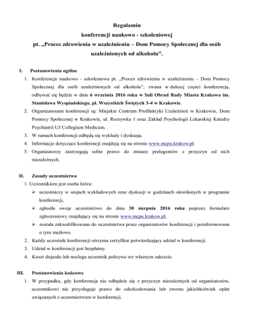 Regulamin konferencji naukowo - szkoleniowej pt. „Proces zdrowienia w uzależnieniu – Dom Pomocy Społecznej dla osób uzależnionych od alkoholu”. I. Postanowienia ogólne 1. Konferencja naukowo - szkoleniowa pt. „Proces zdrowienia w uzależnieniu – Dom Pomocy Społecznej dla osób uzależnionych od alkoholu”, zwana w dalszej części konferencją, odbywać się będzie w dniu 6 września 2016 roku w Sali Obrad Rady Miasta Krakowa im. Stanisława Wyspiańskiego, pl. Wszystkich Świętych 3-4 w Krakowie. 2. Organizatorami konferencji są: Miejskie Centrum Profilaktyki Uzależnień w Krakowie, Dom Pomocy Społecznej w Krakowie, ul. Rozrywka 1 oraz Zakład Psychologii Lekarskiej Katedry Psychiatrii UJ Collegium Medicum. 3. W ramach konferencji odbędą się wykłady i dyskusja. 4. Informacje dotyczące konferencji znajdują się na stronie www.mcpu.krakow.pl. 5. Organizatorzy zastrzegają sobie prawo do zmiany prelegentów z przyczyn od nich niezależnych. II. Zasady uczestnictwa 1. Uczestnikiem jest osoba która: uczestniczy w sesjach wykładowych oraz dyskusji w godzinach określonych w programie konferencji, zgłosiła swoje uczestnictwo do dnia 30 sierpnia 2016 roku poprzez formularz zgłoszeniowy znajdujący się na stronie www.mcpu.krakow.pl, została zakwalifikowana do uczestnictwa przez organizatorów konferencji i poinformowana o tym mailowo. 2. Każdy uczestnik konferencji otrzyma certyfikat potwierdzający udział w konferencji. 3. Udział w konferencji jest bezpłatny. 4. Koszt dojazdu lub noclegu uczestnik pokrywa we własnym zakresie. III. Postanowienia końcowe 1. W przypadku, gdy konferencja nie odbędzie się z przyczyn niezależnych od organizatorów, uczestnikowi nie przysługuje prawo do odszkodowania lub zwrotu jakichkolwiek opłat związanych z uczestnictwem w konferencji. 2. Wysłanie zgłoszenia poprzez wypełnienie aktywnego formularza oznacza akceptację postanowień niniejszego regulaminu. 3. Zgodnie z Ustawą z dnia 29 sierpnia 1997 r. o ochronie danych osobowych (tj. Dz. U. z 2015 r. poz.2135 z późn. zm.) organizatorzy konferencji nie przekazują, nie sprzedają i nie użyczają zgromadzonych danych osobowych uczestników innym osobom lub instytucjom. Dane osobowe podane przez uczestnika służą wyłącznie do celów konferencji. 4. Uczestnik wyraża zgodę na utrwalenie wizerunku jego osoby na zdjęciach wykonywanych przez organizatorów podczas konferencji oraz na ich publikację na stronie internetowej organizatorów oraz w innych publikacjach organizatorów. 5. Organizatorzy nie ponoszą odpowiedzialności za rzeczy uczestników, które mogą zostać zgubione, zniszczone lub skradzione podczas konferencji. Zatwierdzam, 29.07.2016 r. Adam Chrapisiński Dyrektor Miejskiego Centrum Profilaktyki Uzależnień w Krakowie