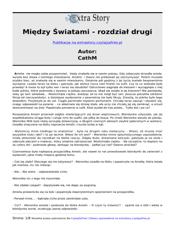 Między Światami - rozdział drugi Publikacja na extrastory.czytajzafree.pl Autor: CathM Amelia nie mogła sobie przypomnieć, kiedy znalazła się w swoim pokoju. Gdy zobaczyła skrzydła anioła, wyszła bez słowa z tamtego mieszkania. Ametin i Daara nie próbowali jej zatrzymywać. Potem musiała szybko biec, aż znalazła się w swoim mieszkaniu. Ostatnie pół godziny z jej życia zostało bezpowrotnie wyrwane. Leżała teraz na łóżku i patrzyła, jak słońce rzuca cień firanki na sufit. Czy to co widziała było prawdą? A może to był tylko sen i teraz się obudziła? Odruchowo sięgnęła do kieszeni i wyciągnęła z niej białe piórko, które podniosła z dywanu w pokoju porywacza. Skąd się wzięło w jej kieszeni? Nie pamiętała, żeby go tam wkładała... Westchnęła ciężko, wiedząc że to nie mógł być sen. Jeszcze potrafiła odróżnić fikcję od rzeczywistości, a dzisiejsze wydarzenie z pewnością nie było fikcją. Zresztą, to piórko było tego dowodem. Przyłożyła je do ust. Ciągle pachniało męskimi perfumami. Chciała teraz zasnąć i obudzić się, znając odpowiedź na pytanie - co właściwie się dzisiaj stało, ale oczy nie chciały jej się zamknąć, a umysł skoncentrować na śnie. Popatrzyła ponownie w sufit. Ktoś wysłał do niej anioła... Tylko kto i po co? Rozważania Amelii przerwał odgłos otwierających się drzwi wejściowych. Blondynka usłyszała, jak jej współlokatorka ściąga buty i celuje nimi do szafki, jak piłką do kosza. Po chwili Weronika weszła do pokoju. Weronika Wilk była niską szczupłą dziewczyną, o długich czarnych włosach zwykle splecionych w warkocz. Usiadła zmęczona na łóżku naprzeciw Amelii i rzuciła torbę w kąt. - Wykończy mnie niedługo ta anatomia! - była na drugim roku medycyny. - Wiesz, że muszę znać wszystkie kości ręki? I to po łacinie. Wiesz ile ich jest? - Weronika mimo optymistycznego usposobienia, miała skłonność do narzekań na błahe rzeczy. Zdjęła duże, drewniane kolczyki, położyła je na stole i uderzyła plecami o materac, który smętnie zatrzeszczał. Westchnęła ciężko. - Na szczęście, to dopiero na za cztery dni - podniosła głowę, zerkając na blondynkę. - Jadłaś już coś? Dawno wróciłaś? Czarnowłosa była najlepszą przyjaciółką Amelii, ale nawet to nie prowokowało blondynki do zwierzeń z wydarzeń, jakie miały miejsce godzinę temu. - Coś się stało? Dlaczego się nie odzywasz? - Weronika usiadła na łóżku i popatrzyła na Amelię, która leżała jak martwa, nic nie mówiąc. - Nie... Nie wiem. - odpowiedziała cicho. Weronika nic z tego nie rozumiała. - Nie zdałaś czegoś? - dopytywała się, nie dając za wygraną. Amelia przewróciła się na bok i popatrzyła nieprzytomnym spojrzeniem na przyjaciółkę. - Porwali mnie... - bąknęła cicho przez zamknięte usta. - Co!? - Weronika wstała i podeszła do łóżka Amelii. - O czym ty mówisz!? - oparła się o stół i wbiła w blondynkę wzrok, oczekując jasnej odpowiedzi. Strona: 1/8 Wszelkie prawa zastrzeżone dla CzytajZaFree | Zobacz opowiadanie na extrastory.czytajzafree.pl Amelia usiadła i niepewnie popatrzyła na współlokatorkę. Wiedziała, że Weronika zawsze ją wysłucha i nie będzie jej wyśmiewać. Jednakże zależało jej na tym, żeby przyjaciółka jej uwierzyła, a o to mogło być trudno. Zresztą do niej samej jeszcze nie do końca docierało to co się stało, więc jak mogła tego wymagać od Weroniki? - Obiecaj, że nie będziesz się śmiać - poprosiła. - To co powiem to prawda, choć mnie też trudno w to uwierzyć... - No dobra. Obiecuję. Przecież wiesz, że nigdy się z ciebie nie śmieję - odpowiedziała ze zniecierpliwieniem. Weronika już nie raz wysłuchiwała od Amelii historii o dziwacznych ludziach, których mijała na ulicy. Nie brała tych opowieści na poważnie, mimo że Amelia opowiadała te historie z dużą powagą na twarzy. Wzięła ciastko z talerzyka, leżącego na stoliku i usiadła na łóżku czekając na zwierzenia blondynki. Amelia kiwnęła głową. Musiała komuś się zwierzyć, bo myśli nie dawały jej spokoju. Zaryzykowała i opowiedziała ze szczegółami historię, cały czas uważnie obserwując reakcję Weroniki. Szatynka przełknęła powoli ciastko, które mieliła w ustach od czasu gdy usłyszała o skrzydłach anioła. Nie wiedziała co ma myśleć o absurdalnej opowieści, którą przed chwilą usłyszała. Widziała przejęcie na twarzy Amelii, która nie był w nastroju do opowiadania bajek. Blondynka zacisnęła zęby i popatrzyła z nadzieją na przyjaciółkę. - Wierzysz mi? - zapytała ściszonym głosem. Weronika westchnęła. Znalazła na półce pomiędzy książkami w miarę czystą szklankę i nalała sobie do niej soku pomarańczowego. Zastanawiała się co właściwie ma odpowiedzieć. - Trudno w to uwierzyć.. Rozumiesz? - odparła dyplomatycznie. Amelia spodziewała się takiej odpowiedzi, bo była ona oczywista. Weronika, mówiąc, że wierzy Amelii skłamałaby. W tą opowieść nie dało się ot tak uwierzyć. Weronika była osobą racjonalną i mówiącą wprost to co myśli. Nie byłoby w jej stylu, zapewnić Amelię, że to co mówi jest dla niej wiarygodne. - Wiem, ale to prawda! - blondynka broniła tego, czego była pewna. - Ja też nie wierzyłam dopóki nie zobaczyłam skrzydeł… To wariactwo, wiem.. - zacisnęła ręce na kolanach. Weronika widziała zmartwienie przyjaciółki, ale znalazła się w sytuacji, w której musiała dobrze wyważyć każde słowo. Odstawiła szklankę po soku na stół i usiadła obok Amelii. - Najlepiej będzie jak zapomnisz o tym wydarzeniu - powiedziała, kładąc jej rękę na ramieniu. To nie było wcale takie proste. Amelia cały czas miała przed oczami obrazy z mieszkania na Grodzkiej. Widziała jednak, że dalsze przekonywanie Weroniki o autentyczności wydarzeń sprzed godziny mija się z celem. Tak jak poradziła jej szat