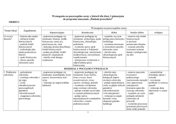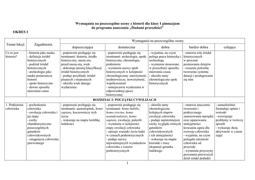 Wymagania na poszczególne oceny z historii dla klasy I gimnazjum do programu nauczania „Śladami przeszłości” OKRES I Wymagania na poszczególne oceny Temat lekcji Co to jest historia? 1. Prahistoria człowieka Zagadnienia - historia jako nauka - definicja źródeł historycznych - podział źródeł historycznych - archeologia jako nauka pomocnicza historii - epoki historyczne - dawne sposoby mierzenia czasu dopuszczająca - poprawnie posługuje się terminami: historia, źródło historyczne, nasza era, przed naszą erą, wiek - dokonuje prostej klasyfikacji źródeł historycznych - podaje przykłady źródeł pisanych i niepisanych - określa wiek danego wydarzenia dostateczna dobra bardzo dobra - poprawnie posługuje się terminami: archeologia, epoki historyczne, chronologia, prahistoria - wymienia nazwy epok historycznych w kolejności chronologicznej: starożytność, średniowiecze, nowożytność, współczesność - umiejscawia wydarzenia w odpowiedniej epoce historycznej - wyjaśnia, na czym polega praca historyka i archeologa - wymienia stosowane w przeszłości sposoby mierzenia czasu - określa ramy chronologiczne epok historycznych - omawia rolę źródeł historycznych w procesie poznawania dziejów - rozumie potrzebę tworzenia systemu datacji i posługiwania się nim ROZDZIAŁ I: POCZĄTKI CYWILIZACJI - pochodzenie - poprawnie posługuje się - poprawnie posługuje się - określa ramy człowieka terminami: australopitek, homo terminami: homo habilis, chronologiczne - ewolucja człowieka i sapiens, koczowniczy tryb homo erectus, homo kolejnych etapów jej etapy życia neandertalensis, homo ewolucji człowieka - cechy - wskazuje na mapie kolebkę sapiens, ewolucja, paleolit - podaje najistotniejsze charakterystyczne ludzkości - wymienia w kolejności cechy wyglądu różnych poszczególnych etapy ewolucji człowieka gatunków gatunków - opisuje warunki życia ludzi człowiekowatych człowiekowatych w czasach prahistorycznych i ich umiejętności - osiągnięcia człowieka - podaje nazwy - wskazuje na mapie pierwotnego najważniejszych wynalazków kierunki i trasy człowieka z czasów ekspansji gatunku prahistorycznych ludzkiego 1 - omawia znaczenie tworzenia i praktycznego zastosowania narzędzi oraz opanowania umiejętności krzesania ognia dla rozwoju człowieka - wyjaśnia, na czym polegała zależność człowieka od przyrody - wymienia przyczyny powstania pierwszych dzieł sztuki praludzi celująca - samodzielnie formułuje opinie i wnioski - rozwiązuje problemy w twórczy sposób - wykazuje dużą aktywność w czasie zajęć Tajemnice sprzed wieków – Jak zbadano pochodzenie człowieka? 2. Czas wielkich przemian - teorie dotyczące powstania człowieka - Karol Darwin i jego odkrycie - zadania antropologii - wpływ zmian klimatu na życie człowieka - rewolucja neolityczna - początki rolnictwa i hodowli - pierwsze osady - budowle megalityczne - początek metalurgii - przedstawia główne założenia teorii Karola Darwina - wymienia teorie dotyczące powstania człowieka - poprawnie posługuje się terminami: rewolucja neolityczna, osiadły tryb życia, osada, epoka brązu, epoka żelaza - przedstawia zmiany, które zaszły w życiu człowieka w okresie neolitu - podaje nazwy metali wykorzystywanych przez praludzi do wytopu broni, narzędzi, ozdób - poprawnie posługuje się terminami: ewolucjonizm, antropologia - opisuje, czym zajmuje się antropolog - omawia sposoby ustalania wieku znalezisk - omawia teorię ewolucji Karola Darwina - wyjaśnia różnice między teorią kreacjonizmu a ewolucjonizmu - przedstawia znaczenie badań naukowych oraz wykorzystania różnych technologii dla poznania historii człowieka - poprawnie posługuje się terminami: neolit, megalit - określa ramy chronologiczne rewolucji neolitycznej - opisuje życie codzienne ludzi przed rewolucją neolityczną - omawia sposób wytopu brązu i żelaza - przedstawia wpływ zmian klimatycznych na tryb życia człowieka pierwotnego - omawia tryb życia i zajęcia ludzi epoki neolitu - nazywa i lokalizuje na mapie pozostałości najstarszej znanej osady ludzkiej - wskazuje na mapie miejsce położenia najbardziej znanej budowli megalitycznej - wyjaśnia, jakie zmiany nastąpiły w życiu człowieka dzięki opanowaniu umiejętności wytopu - omawia tryb życia i zajęcia ludzi epoki neolitu - charakteryzuje wygląd osad neolitycznych - opisuje wygląd i funkcje budowli megalitycznych 2 - prezentuje argumenty zwolenników i przeciwników ewolucjonizmu Ponadto: - samodzielnie formułuje opinie i wnioski - rozwiązuje problemy w twórczy sposób - wykazuje dużą aktywność w czasie zajęć - uzasadnia słuszność określenia rewolucja dla zmian, które zaszły w życiu człowieka w okresie neolitu Ponadto: - samodzielnie formułuje opinie i wnioski - rozwiązuje problemy w twórczy sposób - wykazuje dużą aktywność w czasie zajęć metali 3. W kraju Sumerów 4. Babilonia i Asyria - położenie geograficzne i warunki naturalne Mezopotamii - powstanie pierwszych państw - organizacja państwa Sumerów - osiągnięcia cywilizacji sumeryjskiej - poprawnie posługuje się terminami: cywilizacja, Mezopotamia, system irygacyjny, Sumerowie, miastopaństwo - lokalizuje na mapie Mezopotamię - omawia położenie geograficzne i warunki naturalne panujące w Mezopotamii - wymienia osiągnięcia Sumerów - podaje ramy chronologiczne istnienia cywilizacji sumeryjskiej - poprawnie posługuje się terminami: Żyzny Półksiężyc, król-kapłan, zikkurat - określa rolę rzek w starożytnej Mezopotamii - opisuje wygląd miast sumeryjskich - charakteryzuje oddziaływanie warunków naturalnych na życie mieszkańców Mezopotamii - państwo babilońskie - Hammurabi i jego kodeks prawny - Babilon - państwo asyryjskie - organizacja armii asyryjskiej - poprawnie posługuje się terminami: Babilon, Kodeks Hammurabiego, politeizm - określa, kim był i czym zasłynął Hammurabi - lokalizuje na mapie pań