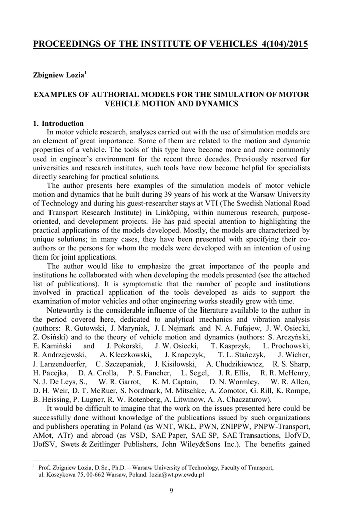 PROCEEDINGS OF THE INSTITUTE OF VEHICLES 4(104)/2015 Zbigniew Lozia1 EXAMPLES OF AUTHORIAL MODELS FOR THE SIMULATION OF MOTOR VEHICLE MOTION AND DYNAMICS 1. Introduction In motor vehicle research, analyses carried out with the use of simulation models are an element of great importance. Some of them are related to the motion and dynamic properties of a vehicle. The tools of this type have become more and more commonly used in engineer’s environment for the recent three decades. Previously reserved for universities and research institutes, such tools have now become helpful for specialists directly searching for practical solutions. The author presents here examples of the simulation models of motor vehicle motion and dynamics that he built during 39 years of his work at the Warsaw University of Technology and during his guest-researcher stays at VTI (The Swedish National Road and Transport Research Institute) in Linköping, within numerous research, purposeoriented, and development projects. He has paid special attention to highlighting the practical applications of the models developed. Mostly, the models are characterized by unique solutions; in many cases, they have been presented with specifying their coauthors or the persons for whom the models were developed with an intention of using them for joint applications. The author would like to emphasize the great importance of the people and institutions he collaborated with when developing the models presented (see the attached list of publications). It is symptomatic that the number of people and institutions involved in practical application of the tools developed as aids to support the examination of motor vehicles and other engineering works steadily grew with time. Noteworthy is the considerable influence of the literature available to the author in the period covered here, dedicated to analytical mechanics and vibration analysis (authors: R. Gutowski, J. Maryniak, J. I. Nejmark and N. A. Fufajew, J. W. Osiecki, Z. Osiński) and to the theory of vehicle motion and dynamics (authors: S. Arczyński, E. Kamiński and J. Pokorski, J. W. Osiecki, T. Kasprzyk, L. Prochowski, R. Andrzejewski, A. Kleczkowski, J. Knapczyk, T. L. Stańczyk, J. Wicher, J. Lanzendoerfer, C. Szczepaniak, J. Kisilowski, A. Chudzikiewicz, R. S. Sharp, H. Pacejka, D. A. Crolla, P. S. Fancher, L. Segel, J. R. Ellis, R. R. McHenry, N. J. De Leys, S., W. R. Garrot, K. M. Captain, D. N. Wormley, W. R. Allen, D. H. Weir, D. T. McRuer, S. Nordmark, M. Mitschke, A. Zomotor, G. Rill, K. Rompe, B. Heissing, P. Lugner, R. W. Rotenberg, A. Litwinow, A. A. Chaczaturow). It would be difficult to imagine that the work on the issues presented here could be successfully done without knowledge of the publications issued by such organizations and publishers operating in Poland (as WNT, WKŁ, PWN, ZNIPPW, PNPW-Transport, AMot, ATr) and abroad (as VSD, SAE Paper, SAE SP, SAE Transactions, IJofVD, IJofSV, Swets & Zeitlinger Publishers, John Wiley&Sons Inc.). The benefits gained 1 Prof. Zbigniew Lozia, D.Sc., Ph.D. – Warsaw University of Technology, Faculty of Transport, ul. Koszykowa 75, 00-662 Warsaw, Poland. [email protected] 9 from the participation in seminars and conferences held in Poland (BwPS Warszawa, BwPS Kielce, BSwTS Kazimierz Dolny, AUTOPROGRES, KONMOT Kraków, KHiB Łódź, IES Kraków) and abroad (SAE, IAVSD, DSC) cannot be ignored, either. Very much inspiration was also drawn from collaboration with colleagues working on similar issues, who in many cases were also co-authors of publications or implementations (P. Zagrodzki, G. Marcinkowski, M. Guzek, I. Stegienka, W. Mackiewicz, P. Zdanowicz, W. Pieniążek, J. Pokorski, T. L. Stańczyk, D. Żardecki, L. Prochowski, W. Luty, J. Jackowski, G. Ślaski, J. Unarski, W. Wach, A. Gajek, A. Reński, J. Wicher, D. Więckowski, S. Nordmark, O. Nordström). 2. Models for the research on low-velocity vehicle motion Such models are used for the assessment of vehicle agility. The simplest of them are based on the principles of plane motion (Figs. 1 and 2). When building them, the author (together with co-authors of the models) used the known patterns, e.g. those presented in [1, 6], describing the vehicle motion, in most cases with ignoring the tyre sideslip angles, i.e. built with using the Ackermann model [1]. In [33] (Fig. 1), the agility of two-axle and three-axle city buses operated in Warsaw was assessed. Based on analyses carried out, the values of turning radii and swept path widths were determined. These calculations provided grounds for evaluating the method of dimensioning various transport infrastructure elements. Dimensional incompatibility between street intersections in towns and city buses was shown to be quite frequent. This incompatibility may pose a hazard to the road traffic safety. In [35] (Fig. 2), calculations were carried out for model data corresponding to specifications of the Mercedes Benz Actros 4148 AK truck. The most favourable and unfavourable configurations of the steered and non-steered wheels were indicated. The vehicle agility was also assessed with the use of models where tyre sideslip was taken into account as well. Fig. 3 shows a model of motion of a two-axle motor vehicle with 10 degrees of freedom (DoF): coordinates xO1, yO1, zO1 of point O1 (centre of vehicle mass) in inertial coordinate system Oxyz, vehicle body yaw (heading) angle ψ 1, pitch angle φ1, and roll angle 1, and steering angles φ5, φ6, φ7, φ8 [22]. An authorial simulation program named ZL_FL_3D determines them with rough methods but with high accuracy of calculations. A model of the steering system has been presented in Fig. 4, with solutions typical for motor trucks being used as an example. In this model, the geometric and spring characteristics of the system are taken into account. Within works reported in [39, 40], a model of a two-axle motor truck was tested to find out how strong effect on the turning radius valu