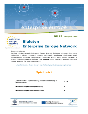 NR 13 listopad 2010 Biuletyn Enterprise Europe Network Szanowni Państwo! Każdego miesiąca projekt Enterprise Europe Network dostarcza najnowsze informacje regionalne z zakresu innowacji, nowych technologii, współpracy międzyregionalnej, innowacyjnych projektów regionalnych, zagadnień B+R i wielu innych tematów. Z przyjemnością oddajemy w Państwa ręce kolejny numer Biuletynu projektu Enterprise Europe Network. Życzymy miłej lektury! Zespół Enterprise Europe Network przy Podlaskiej Fundacji Rozwoju Regionalnego Spis treści „InnoBoost” - szybki rozwój poziomu innowacji w sektorze MSP 2-4 Oferty współpracy kooperacyjnej 5 Oferty współpracy technologicznej 6 1 „InnoBoost” - szybki rozwój poziomu innowacji w sektorze MSP Cytując Steve’a Jobbs’a można powiedzieć, że wdrażanie innowacyjnych rozwiązań rozróżnia liderów od naśladowców. Nie chodzi tutaj tylko i wyłącznie o innowacyjne rozwiązania technologiczne prowadzane w przedsiębiorstwach, ale również o nowe rozwiązania związane z zarządzaniem, wdrażaniem, realizacją projektów w instytucjach niekomercyjnych, organizacjach czy urzędach. Każda zmiana, która prowadzi do oszczędności czasu, zasobów ludzkich czy kapitałowych jest zmianą korzystną z punktu widzenia instytucji, która ją wdraża oraz jej klientów czy beneficjentów. W teorii powyższe stwierdzenia są motywujące i optymistycznie nastrajają każdego kto widzi konieczność wprowadzania zmian. Rzeczywistość jednak wygląda zupełnie inaczej. Analizując północno-wschodnie regiony Polski możemy jednoznacznie stwierdzić, że pod względem szeroko rozumianej innowacyjności, nie wypadamy zbyt dobrze na tle regionów wiodących jak np. woj. mazowieckie. Dane statystyczne są niestety dla nas nieubłagane i dają wyraźny sygnał do podjęcia konkretnych działań mających na celu redukcję tej olbrzymiej luki dzielącej nas od pozostałej części Polski. Głównymi wskaźnikami doskonale obrazującymi sytuację polskiej, północno-wschodniej innowacyjności będą przede wszystkim nakłady na działalność B+R liczone jako odsetek całości PKB. W woj. mazowieckim wynosi on 1,10% co na tle przeciętnego poziomu w kraju – 0,57% wypada całkiem nieźle. Porównując do niego wyniki z województw lubelskiego, podlaskiego i warmińsko-mazurskiego – odpowiednio: 0,48%, 0,27% i 0,24%, możemy zauważyć, że różnica jest co najmniej 4-krotna. Nie wspominając o wysokości budżetów w poszczególnych regionach. Kolejnym nurtującym czynnikiem będą wydatki na działalność badawczo-rozwojową finansowane z kieszeni samych przedsiębiorców: mazowieckie – 0,34%, lubelskie – 0,10%, podlaskie – 0,08%, warmińsko-mazurskie – 0,03%. Średni wynik w kraju to 0,18%. Uzasadnieniem takiego stanu rzeczy jest przede wszystkim niski poziom uprzemysłowienia regionów północno-wschodniej Polski. Nie oznacza to jednak, że turystyka, rolnictwo czy przemysł włókienniczy nie należą do gałęzi, które nie mogą zostać zrestrukturyzowane poprzez wprowadzanie innowacyjnych rozwiązań. Pocieszającym wskaźnikiem może być ilość wdrożonych innowacji w MSP. Tutaj „Polska B” nie odstaje aż tak bardzo od czołówki, ale głównym wytłumaczeniem takiego stanu rzeczy jest niski stopień rozwoju funkcjonujących tu podmiotów gospodarczych, a co za tym idzie, szerokie pole do popisu przy wdrażaniu nowych rozwiązań. Średnio w kraju 25,9% całości MSP wdraża innowacje, w mazowieckiem jest to 23,8%, w lubelskim 27,8%, w podlaskim 22,4%, a na Warmii i Mazurach – 28,5%. Zawyżamy również średnią jeżeli chodzi o wydatkowanie funduszy na innowacje w porównaniu ich wysokości do całości obrotów finansowych MSP. W kraju współczynnik ten plasuje się na poziomie 2,10%, w woj. mazowieckim – 2,20%, lubelskim – 3,00%, podlaskim — 3,40%, warmińsko-mazurskim – 1,70%. 2 Doskonałym odzwierciedleniem stopnia uprzemysłowienia regionów w północno-wschodniej Polsce oraz stopnia zaawansowania technologicznego jest wskaźnik zatrudnienia przy nowych technologiach liczony w ogóle liczby zatrudnionych. I tak odpowiednio: Polska – 2,38% i woj. mazowieckie – aż 4,28%. Lubelszczyzna – 1,61%, Podlasie – 1,76%, Warmia i Mazury – 1,86%. Powyższe wskaźniki pokazują, że wdrażanie nowych technologii w północno-wschodniej Polsce jest jeszcze przed nami. Tendencje jakie obecnie panują i plany odnośnie przyszłości technologicznej regionu zobrazować może ilość wniosków patentowych na 1 mln mieszkańców. Średnio w Polsce – 1,8765, a w woj. mazowieckim 3,4810, woj. lubelskie – 1,3325, podlaskie – 1,7810, warmińsko-mazurskie – 0,7529. Na podstawie tych danych wyraźnie widać, że w chwili obecnej tendencje też nie są optymistyczne i upłynie trochę czasu zanim przedsiębiorcy z tych regionów uzmysłowią sobie konieczność walki o egzystencję nie tylko między sobą ale również z gigantami z Polski i Europy. Ogólny poziom innowacyjności poszczególnych regionów Polski obrazuje poniższy schemat, na którym wyraźnie widać liderów, poziom średni oraz województwa, na których spoczywa presja podążania za innymi. Rys. 1: Ogólny poziom innowacyjności Źródło: European Innovation Scoreboard Analysis. 3 Dość dobrym pozostających na rozwiązaniem służącym poprawie końcu stawki jest podnoszenie poziomu innowacyjności w świadomości przedsiębiorców oraz regionach instytucji wspierających innowacyjność w zakresie faktycznego stanu oraz szczegółowych potrzeb sektora MSP. Niestety działanie samo w sobie wygląda dość trywialnie. Aby jednak zrobić to precyzyjnie należy zbadać stan faktyczny bardzo dokładnie, a nie jest to takie proste jeżeli wokół nas panuje chaos informacyjny. W sieci można znaleźć informacje sprzeczne, nieprawdziwe i nieaktualne, jeżeli chodzi o wsparcie działań innowacyjnych z zewnętrznych źródeł finansowania. 