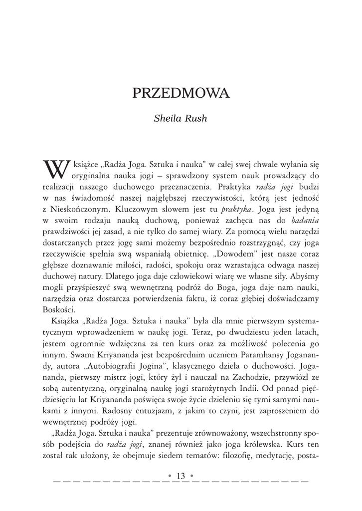 SPIS TREŚCI PRZEDMOWA Sheila Rush W książce „Radża Joga. Sztuka i nauka” w całej swej chwale wyłania się oryginalna nauka jogi – sprawdzony system nauk prowadzący do realizacji naszego duchowego przeznaczenia. Praktyka radża jogi budzi w nas świadomość naszej najgłębszej rzeczywistości, którą jest jedność z Nieskończonym. Kluczowym słowem jest tu praktyka. Joga jest jedyną w swoim rodzaju nauką duchową, ponieważ zachęca nas do badania prawdziwości jej zasad, a nie tylko do samej wiary. Za pomocą wielu narzędzi dostarczanych przez jogę sami możemy bezpośrednio rozstrzygnąć, czy joga rzeczywiście spełnia swą wspaniałą obietnicę. „Dowodem” jest nasze coraz głębsze doznawanie miłości, radości, spokoju oraz wzrastająca odwaga naszej duchowej natury. Dlatego joga daje człowiekowi wiarę we własne siły. Abyśmy mogli przyśpieszyć swą wewnętrzną podróż do Boga, joga daje nam nauki, narzędzia oraz dostarcza potwierdzenia faktu, iż coraz głębiej doświadczamy Boskości. Książka „Radża Joga. Sztuka i nauka” była dla mnie pierwszym systematycznym wprowadzeniem w naukę jogi. Teraz, po dwudziestu jeden latach, jestem ogromnie wdzięczna za ten kurs oraz za możliwość polecenia go innym. Swami Kriyananda jest bezpośrednim uczniem Paramhansy Joganandy, autora „Autobiografii Jogina”, klasycznego dzieła o duchowości. Jogananda, pierwszy mistrz jogi, który żył i nauczał na Zachodzie, przywiózł ze sobą autentyczną, oryginalną naukę jogi starożytnych Indii. Od ponad pięćdziesięciu lat Kriyananda poświęca swoje życie dzieleniu się tymi samymi naukami z innymi. Radosny entuzjazm, z jakim to czyni, jest zaproszeniem do wewnętrznej podróży jogi. „Radża Joga. Sztuka i nauka” prezentuje zrównoważony, wszechstronny sposób podejścia do radża jogi, znanej również jako joga królewska. Kurs ten został tak ułożony, że obejmuje siedem tematów: filozofię, medytację, posta• 13 • RADŻA JOGA – SZTUKA I NAUKA wy jogi, oddychanie, praktykę, zdrowie i dietę. Ponadto zawiera szczegółowe omówienie ścieżek karma, bhakti i gjana jogi. Kriyananda dobitnie pokazuje współzależność tych z pozoru oddzielnych dziedzin i opisuje, jak wszystkie one mogą przyspieszyć nasz postęp duchowy, o ile podejdziemy do nich właściwie. Na przykład głównym celem postaw jogi, o których nieraz się sądzi, że dają korzyści wyłącznie fizyczne, jest przygotowanie ciała i umysłu do medytacji. Afirmacje, wizualizacje, ćwiczenia oddechowe, techniki uzdrawiania, różne ścieżki jogi oraz do pewnego stopnia również dieta są w podobny sposób pomocne. Tym, co jednoczy te różne dziedziny, jest nacisk, jaki radża joga kładzie na sferę wnętrza i duchowość, co znajduje swój najgłębszy wyraz w praktyce medytacji. Medytacja, której uczy „Radża Joga. Sztuka i nauka”, daje nam bezpośredni dostęp do wewnętrznego świata Ducha. W najprawdziwszym tego słowa znaczeniu, medytacja jest laboratorium jogi oraz podstawowym środkiem, za pomocą którego możemy zbadać prawdziwość nauk jogi. Jako przygotowanie do praktyki medytacji kurs ten prezentuje wiele wstępnych ćwiczeń, które pomagają nam przejść z zewnętrznego świata działań do wewnętrznego świata wyciszenia. Uczymy się, jak pozbyć się zmartwień, fizycznego i psychicznego napięcia oraz jak osiągnąć skupienie umysłu. Poznajemy zatem umiejętności przydatne nie tylko w medytacji, ale również w zwykłym codziennym życiu. Przedstawione przez Kriyanandę szczegółowo krok po kroku techniki medytacyjne starożytnych Indii okazują się nieodzowne do wyciszenia umysłu, zwrócenia go do wewnątrz i skierowania naszej świadomości do ośrodków duchowego przebudzenia w mózgu. Wkrótce człowiek odkrywa, że prawdziwa medytacja nie jest ani mechaniczna, ani pasywna, lecz wymaga głębokiej koncentracji i ciągłej, dynamicznej energii. Medytacja wymaga ponadto tego, co Kriyananda nazywa „zupełną rewolucją” w „tym, co jest powszechnie uznawane za zwykłe ludzkie zachowania”. Wyjaśnia: „Na przykład duch rywalizacji pociąga za sobą założenie, że sukces musi być zawsze wyłączny – nawet do tego stopnia, że osiąga się go dzięki porażce innych. (...) Taka postawa pokrzyżuje nawet najgłębsze wysiłki postępu w medytacji, ponieważ wystawia człowieka do walki z wszechświatem, zamiast go z nim zharmonizować. Właściwe nastawienie jest podstawową rzeczą umożliwiającą prawidłową medytację”. • 14 • PRZEDMOWA „Właściwe nastawienie”, o którym mówi Kriyananda, to uniwersalne zasady moralne jogi: jamy (zakazy) i nijamy (nakazy). Jedną z najbardziej znanych pośród nich jest ahimsa, czyli powstrzymanie się od wyrządzania krzywdy, spopularyzowane przez ruchy protestacyjne Gandhiego i Martina Luthera Kinga juniora. Zakazy ahimsy nie dotyczą wyłącznie działań powodujących faktyczne krzywdy, ale i krzywd wyrządzonych przez negatywne myśli. Powody dotykają sedna ducha jogi. Kriyananda pisze: „Pierwszym krokiem do wykształcenia właściwego nastawienia jest nauczenie się tego, by postrzegać innych nie jak rywali, lecz jak przyjaciół. (...) Celem jogi jest uświadomienie sobie jedności wszelkiego życia. Jeśli skłonny jestem zranić życie w sobie, które przejawia się w innym człowieku, to przyzwalam na błąd, który jest diametralnie różny od celu, do którego dążę. Jeżeli prawdziwie zależy mi na uświadomieniu sobie jedności wszystkich rzeczy, niezbędne jest także, bym żył w taki sposób, abym stale potwierdzał swoją postawą tę jedność – poprzez moją życzliwość wobec wszystkich istot, przez współczucie czy uniwersalną miłość”. Aby doświadczać głębszych stanów medytacyjnych, w których można znaleźć Ducha, musimy najpierw się z Nim zestroić. Kriyananda radzi, byśmy na początku każdej medytacji wysłali z ser