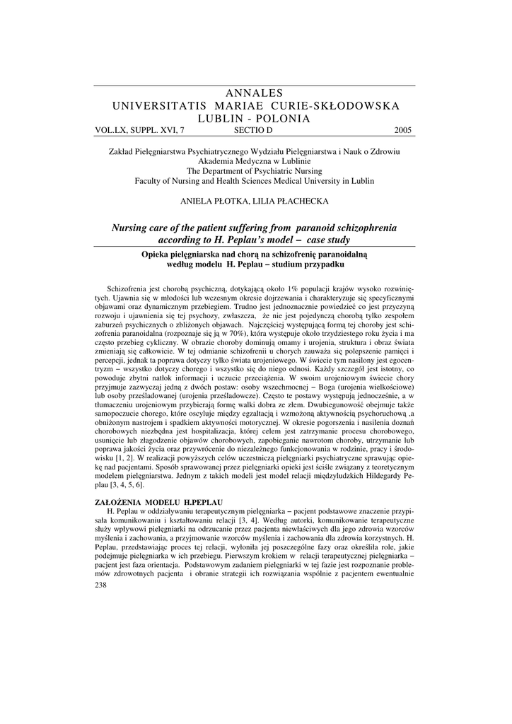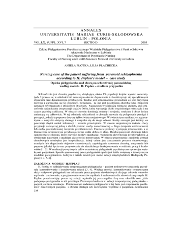 ANNALES UNIVERSITATIS MARIAE CURIE-SKŁODOWSKA LUBLIN - POLONIA VOL.LX, SUPPL. XVI, 7 SECTIO D 2005 Zakład Pielęgniarstwa Psychiatrycznego Wydziału Pielęgniarstwa i Nauk o Zdrowiu Akademia Medyczna w Lublinie The Department of Psychiatric Nursing Faculty of Nursing and Health Sciences Medical University in Lublin ANIELA PŁOTKA, LILIA PŁACHECKA Nursing care of the patient suffering from paranoid schizophrenia according to H. Peplau’s model − case study Opieka pielęgniarska nad chorą na schizofrenię paranoidalną według modelu H. Peplau − studium przypadku Schizofrenia jest chorobą psychiczną, dotykającą około 1% populacji krajów wysoko rozwiniętych. Ujawnia się w młodości lub wczesnym okresie dojrzewania i charakteryzuje się specyficznymi objawami oraz dynamicznym przebiegiem. Trudno jest jednoznacznie powiedzieć co jest przyczyną rozwoju i ujawnienia się tej psychozy, zwłaszcza, że nie jest pojedynczą chorobą tylko zespołem zaburzeń psychicznych o zbliżonych objawach. Najczęściej występującą formą tej choroby jest schizofrenia paranoidalna (rozpoznaje się ją w 70%), która występuje około trzydziestego roku życia i ma często przebieg cykliczny. W obrazie choroby dominują omamy i urojenia, struktura i obraz świata zmieniają się całkowicie. W tej odmianie schizofrenii u chorych zauważa się polepszenie pamięci i percepcji, jednak ta poprawa dotyczy tylko świata urojeniowego. W świecie tym nasilony jest egocentryzm − wszystko dotyczy chorego i wszystko się do niego odnosi. Każdy szczegół jest istotny, co powoduje zbytni natłok informacji i uczucie przeciążenia. W swoim urojeniowym świecie chory przyjmuje zazwyczaj jedną z dwóch postaw: osoby wszechmocnej − Boga (urojenia wielkościowe) lub osoby prześladowanej (urojenia prześladowcze). Często te postawy występują jednocześnie, a w tłumaczeniu urojeniowym przybierają formę walki dobra ze złem. Dwubiegunowość obejmuje także samopoczucie chorego, które oscyluje między egzaltacją i wzmożoną aktywnością psychoruchową ,a obniżonym nastrojem i spadkiem aktywności motorycznej. W okresie pogorszenia i nasilenia doznań chorobowych niezbędna jest hospitalizacja, której celem jest zatrzymanie procesu chorobowego, usunięcie lub złagodzenie objawów chorobowych, zapobieganie nawrotom choroby, utrzymanie lub poprawa jakości życia oraz przywrócenie do niezależnego funkcjonowania w rodzinie, pracy i środowisku [1, 2]. W realizacji powyższych celów uczestniczą pielęgniarki psychiatryczne sprawując opiekę nad pacjentami. Sposób sprawowanej przez pielęgniarki opieki jest ściśle związany z teoretycznym modelem pielęgniarstwa. Jednym z takich modeli jest model relacji międzyludzkich Hildegardy Peplau [3, 4, 5, 6]. ZAŁOŻENIA MODELU H.PEPLAU H. Peplau w oddziaływaniu terapeutycznym pielęgniarka − pacjent podstawowe znaczenie przypisała komunikowaniu i kształtowaniu relacji [3, 4]. Według autorki, komunikowanie terapeutyczne służy wpływowi pielęgniarki na odrzucanie przez pacjenta niewłaściwych dla jego zdrowia wzorców myślenia i zachowania, a przyjmowanie wzorców myślenia i zachowania dla zdrowia korzystnych. H. Peplau, przedstawiając proces tej relacji, wyłoniła jej poszczególne fazy oraz określiła role, jakie podejmuje pielęgniarka w ich przebiegu. Pierwszym krokiem w relacji terapeutycznej pielęgniarka − pacjent jest faza orientacja. Podstawowym zadaniem pielęgniarki w tej fazie jest rozpoznanie problemów zdrowotnych pacjenta i obranie strategii ich rozwiązania wspólnie z pacjentem ewentualnie 238 także z jego rodziną. Dużą rolę w tej fazie odgrywa umiejętność słuchania pacjenta, zachęcanie go do wyrażania uczuć, a także obserwacja jego zachowań. Kolejną fazą procesu kształtowania relacji terapeutycznej pielęgniarka − pacjent jest faza identyfikacji. W tej fazie pacjent osiąga możliwość obchodzenia się bez pomocy pielęgniarki i „pomaga sobie sam" w dalszym zaspokajaniu swoich potrzeb oraz w dokonywaniu wyboru tych, na których pomoc będzie liczył w przyszłości. Osiąganie tego stanu rzeczy jest możliwe przez eliminowanie uczuć bezsilności i bezradności, a zastępowanie ich uczuciami spontaniczności, twórczości i produktywności. Etap, w którym pacjent osiąga zdolność do korzystania w pełni z pomocy, jaką oferuje mu opieka nad zdrowiem, a także możliwość kontrolowania różnych sytuacji H.Peplau określiła jako fazę eksploatacji. W fazie eksploatacji pacjenci wykazują coraz większe zainteresowanie rozszerzeniem samoopieki, podejmują różne samodzielne inicjatywy i aktywności, wykazują zwiększenie się poczucia odpowiedzialności za własne zachowania. W tej fazie następuje pełne zaspokojenie potrzeb pacjenta, związanych z jego problemami zdrowotnymi i zaczyna się także określenie nowych celów, które pacjent formułuje w sposób niezależny. Zasadniczo kończy się więc czas zależności powiązań z pielęgniarką i rozpoczyna się faza rozwiązania relacji terapeutycznej z pacjentem H. Peplau wyróżnia sześć ról, jakie może przyjmować pielęgniarka w relacji z podopiecznym i określiła podstawowe zasady, jakimi winna się kierować w sytuacji ich podejmowania wobec pacjenta. Są to: rola obcego, źródła informacji, nauczyciela, przywódcy, konsultanta, zastępcy. Podstawowymi zasadami, jakimi pielęgniarka powinna się kierować występując w roli obcego są: akceptowanie pacjenta takim, jakim jest i wyraźne tego okazywanie. Mówiąc o roli pielęgniarki jako źródła informacji autorka ostrzega, że nie zawsze najkorzystniejsze dla pacjenta jest otrzymywanie gotowych odpowiedzi lub uzyskiwanie pełnej porady, bowiem takie postępowanie ogranicza możliwość konstruktywnego uczenia się. Ideą przewodnią w podejmowaniu roli nauczyciela, zdaniem H. Peplau, jest zapewnianie pomocy w konstruktywnym uczeniu się. Najważniejszą metodą 