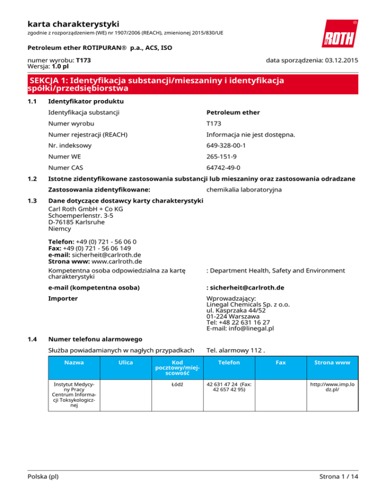 karta charakterystyki zgodnie z rozporządzeniem (WE) nr 1907/2006 (REACH), zmienionej 2015/830/UE Petroleum ether ROTIPURAN® p.a., ACS, ISO numer wyrobu: T173 Wersja: 1.0 pl data sporządzenia: 03.12.2015 SEKCJA 1: Identyfikacja substancji/mieszaniny i identyfikacja spółki/przedsiębiorstwa 1.1 1.2 Identyfikator produktu Identyfikacja substancji Petroleum ether Numer wyrobu T173 Numer rejestracji (REACH) Informacja nie jest dostępna. Nr. indeksowy 649-328-00-1 Numer WE 265-151-9 Numer CAS 64742-49-0 Istotne zidentyfikowane zastosowania substancji lub mieszaniny oraz zastosowania odradzane Zastosowania zidentyfikowane: 1.3 chemikalia laboratoryjna Dane dotyczące dostawcy karty charakterystyki Carl Roth GmbH + Co KG Schoemperlenstr. 3-5 D-76185 Karlsruhe Niemcy Telefon: +49 (0) 721 - 56 06 0 Fax: +49 (0) 721 - 56 06 149 e-mail: [email protected] Strona www: www.carlroth.de 1.4 Kompetentna osoba odpowiedzialna za kartę charakterystyki : Department Health, Safety and Environment e-mail (kompetentna osoba) : [email protected] Importer Wprowadzający: Linegal Chemicals Sp. z o.o. ul. Kasprzaka 44/52 01-224 Warszawa Tel: +48 22 631 16 27 E-mail: [email protected] Numer telefonu alarmowego Służba powiadamianych w nagłych przypadkach Nazwa Instytut Medycyny Pracy Centrum Informacji Toksykologicznej Polska (pl) Ulica Tel. alarmowy 112 . Kod pocztowy/miejscowość Telefon Łódź 42 631 47 24 (Fax: 42 657 42 95) Fax Strona www http://www.imp.lo dz.pl/ Strona 1 / 14 karta charakterystyki zgodnie z rozporządzeniem (WE) nr 1907/2006 (REACH), zmienionej 2015/830/UE Petroleum ether ROTIPURAN® p.a., ACS, ISO numer wyrobu: T173 SEKCJA 2: Identyfikacja zagrożeń 2.1 Klasyfikacja substancji lub mieszaniny Klasyfikacja zgodnie z rozporządzeniem (WE) nr 1272/2008 (CLP) Klasyfikacja zg. z GHS Sekcja Klasa zagrożenia Klasa i kategoria zagrożenia Zwrot wskazujący rodzaj zagrożenia 2.6 substancja ciekła łatwopalna (Flam. Liq. 2) H225 3.2 działanie żrące/podrażniające na skórę (Skin Irrit. 2) H315 3.8D działanie toksyczne na narządy docelowe – narażenie jednorazowe (działania narkotyczne, senność) (STOT SE 3) H336 3.10 zagrożenie spowodowane aspiracją (Asp. Tox. 1) H304 4.1C stwarzające zagrożenie dla środowiska wodnego - zagrożenie przewlekłe (Aquatic Chronic 2) H411 Uwagi Pełny tekst zwrotów wskazujących rodzaj zagrożenia i zwrotów EUH: zob. SEKCJA 16. Klasyfikacja substancji jako rakotwórczej lub mutagennej nie jest wymagana. Substancja zawiera mniej niż 0,1% w/w benzenu (EINECS nr 200-753-7). Najważniejsze szkodliwe skutki działania na zdrowie człowieka i środowisko oraz związane z właściwościami fizykochemicznymi Działania narkotyczne. 2.2 Elementy oznakowania Oznakowania zgodnie z rozporządzeniem (WE) nr 1272/2008 (CLP) Hasło ostrzegawcze Niebezpieczeństwo Piktogramy Zwroty wskazujące rodzaj zagrożenia H225 H304 H315 H336 H411 Polska (pl) Wysoce łatwopalna ciecz i pary. Połknięcie i dostanie się przez drogi oddechowe może grozić śmiercią. Działa drażniąco na skórę. Może wywoływać uczucie senności lub zawroty głowy. Działa toksycznie na organizmy wodne, powodując długotrwałe skutki. Strona 2 / 14 karta charakterystyki zgodnie z rozporządzeniem (WE) nr 1907/2006 (REACH), zmienionej 2015/830/UE Petroleum ether ROTIPURAN® p.a., ACS, ISO numer wyrobu: T173 Zwroty wskazujące środki ostrożności Zwroty wskazujące środki ostrożności - zapobieganie P210 Przechowywać z dala od źródeł ciepła, gorących powierzchni, źródeł iskrzenia, otwartego ognia. Nie palić. Uziemić/połączyć pojemnik i sprzęt odbiorczy. Unikać uwolnienia do środowiska. P240 P273 Zwroty wskazujące środki ostrożności - reagowanie P301+P310 W PRZYPADKU POŁKNIĘCIA: natychmiast skontaktować się z OŚRODKIEM ZATRUĆ lub z lekarzem. NIE wywoływać wymiotów. P331 Zwroty wskazujące środki ostrożności - przechowywanie P403+P235 Przechowywać w dobrze wentylowanym miejscu. Przechowywać w chłodnym miejscu. Oznakowanie opakowań, których zawartość nie przekracza 125 ml Hasło ostrzegawcze: Niebezpieczeństwo Symbol(-e) 2.3 H304 Połknięcie i dostanie się przez drogi oddechowe może grozić śmiercią. P301+P310 P331 W PRZYPADKU POŁKNIĘCIA: natychmiast skontaktować się z OŚRODKIEM ZATRUĆ lub z lekarzem. NIE wywoływać wymiotów. Inne zagrożenia Nie ma dodatkowych informacji. SEKCJA 3: Skład/informacja o składnikach 3.1 Substancje Nazwa substancji Nafta (ropa naftowa) lekka hydrorafinowana Nr. indeksowy 649-328-00-1 Numer WE 265-151-9 Numer CAS 64742-49-0 SEKCJA 4: Środki pierwszej pomocy 4.1 Opis środków pierwszej pomocy Uwagi ogólne Zdjąć zanieczyszczoną odzież. Polska (pl) Strona 3 / 14 karta charakterystyki zgodnie z rozporządzeniem (WE) nr 1907/2006 (REACH), zmienionej 2015/830/UE Petroleum ether ROTIPURAN® p.a., ACS, ISO numer wyrobu: T173 Po narażeniu przez drogi oddechowe Zapewnić dostęp do świeżego powietrza. Zasięgnąć porady lekarza w przypadku pojawienia się jakichkolwiek wątpliwości, lub jeżeli objawy nie ustępują. Po kontakcie ze skórą Spłukać skórę pod strumieniem wody/prysznicem. Należy udać się do dermatologa. Po kontakcie z oczami Ostrożnie płukać wodą przez kilka minut. Zasięgnąć porady lekarza w przypadku pojawienia się jakichkolwiek wątpliwości, lub jeżeli objawy nie ustępują. Po narażeniu przez przewód pokarmowy Wypłukać usta. Nie wywoływać wymiotów. Obserwować zagrożenie spowodowane aspiracją w przypadku wystąpienia wymiotów. Natychmiast wezwać lekarza. 4.2 Najważniejsze ostre i opóźnione objawy oraz skutki narażenia Zagrożenie spowodowane aspiracją, Zawroty głowy, Nieświadomość, Ból głowy, Zawroty głowy, Działanie drażniące, Kurcze 4.3 Wskazania dotyczące wszelkiej natychmiastowej pomocy lekarskiej i szczególnego postępowania z poszkodowanym żadne SEKCJA 5: Postępowanie w przypadku pożaru 5.1 Środki gaśnicze Odpowiednie ś