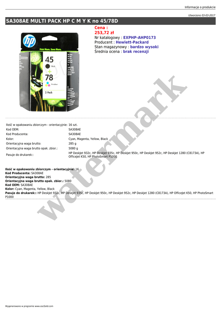 Informacje o produkcie Utworzono 03-03-2017 SA308AE MULTI PACK HP C M Y K no 45/78D Cena : 253,72 zł er m ar k Nr katalogowy : EXPHP-AHP0173 Producent : Hewlett-Packard Stan magazynowy : bardzo wysoki Średnia ocena : brak recenzji Ilość w opakowaniu zbiorczym - orientacyjnie: 16 szt. Kod OEM: SA308AE Kod Producenta: SA308AE Kolor: Cyan, Magenta, Yellow, Black Orientacyjna waga brutto: Orientacyjna waga brutto opak. zbior.: 285 g 5080 g HP DeskJet 932c, HP DeskJet 935c, HP DeskJet 950c, HP DeskJet 952c, HP DeskJet 1280 (C8173A), HP OfficeJet K50, HP PhotoSmart P1000 Pasuje do drukarek:: w at Ilość w opakowaniu zbiorczym - orientacyjnie: 16 Kod Producenta: SA308AE Orientacyjna waga brutto: 285 Orientacyjna waga brutto opak. zbior.: 5080 Kod OEM: SA308AE Kolor: Cyan, Magenta, Yellow, Black Pasuje do drukarek:: HP DeskJet 932c, HP DeskJet 935c, HP DeskJet 950c, HP DeskJet 952c, HP DeskJet 1280 (C8173A), HP OfficeJet K50, HP PhotoSmart P1000 Wygenerowano w programie www.oscGold.com