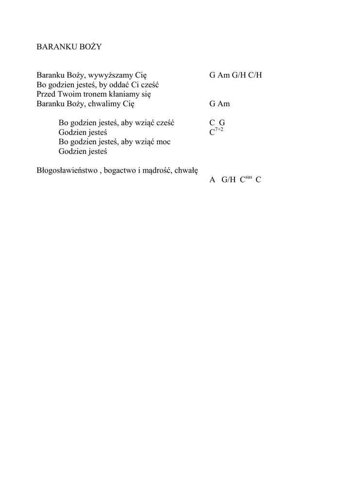 BARANKU BOŻY Baranku Boży, wywyższamy Cię Bo godzien jesteś, by oddać Ci cześć Przed Twoim tronem kłaniamy się Baranku Boży, chwalimy Cię Bo godzien jesteś, aby wziąć cześć Godzien jesteś Bo godzien jesteś, aby wziąć moc Godzien jesteś G Am G/H C/H G Am C G C7+2 Błogosławieństwo , bogactwo i mądrość, chwałę A G/H Csus C