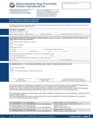 Nazwa imprezy / Name of the event: MIĘDZYNARODOWE TARGI POZNAŃSKIE sp. z o. o. POZNAŃ INTERNATIONAL FAIR Ltd. ul. Głogowska 14, 60-734 Poznań, Poland tel. +48/61/ 869 2000, fax: +48 /61/ 869 2999 Konto / Bank account: Bank Handlowy w Warszawie S.A. o/Poznań Nr konta: 37 103012470000000055861201 IBAN: PL 66103012470000000055861358, SWIFT: CITIPLPX Płatnik VAT czynny / Active VAT Payer, NIP / Tax ID: 777-00-00-488 Sąd Rejonowy Poznań - Nowe Miasto i Wilda w Poznaniu, VIII Wydział Gospodarczy Krajowego Rejestru Sądowego / Poznan District Court, 8th Division of National Court Register KRS / National Court Register number: 0000202703 Kapitał zakładowy / Share capital: 42 310 200,00 PLN ZGŁOSZENIE WYKONAWCY ZABUDOWY STAND CONSTRUCTOR DECLARATION Niniejszego formularza nie wypełniają wystawcy, którzy budowę i wyposażenie stoiska zlecili MTP. / Participants who order a stand construction and equipment by PIF do not fill in this form. WYSTAWCA / EXHIBITOR: Firma wystawcy / Exhibitor`s company:........................................................................................................................................................................................................ Pawilon - Sector / Pavilion No. - Outdoor sector:..........................Nr stoiska / Stand No.:................................ Powierzchnia stoiska w m² / Space in m²........................... ZABUDOWA NASZEGO STOISKA ZOSTANIE WYKONANA PRZEZ (właściwe zaznaczyć) / CONSTRUCTION OF OUR STAND WILL BE EFFECTED BY: (mark where applicable) Personel własny / Exhibitor`s own personnel Firma / Company: Pełna nazwa / Full name:.............................................................................................................................................................................................................................. Ulica / Street: ......................................................................................... Kod i miejscowość / Postal code and city:..................................................................................... Kraj / Country:............................................. Telefon / Phone:.................................. Fax:......................................... E-mail:......................................................................... Osoba upoważniona do reprezentowania firmy / Person authorised to represent the company:................................................................................................................. Tel. komórkowy / Mobile phone no:.............................................................................. E-mail:...................................................................................................................... Numer wpisu do KRS (ewidencji działalności gospodarczej) / Company registration No.:........................................................................................................................... Miejsce / Place: .............................................................................................................................................NIP / VAT identification:.......................................................... PŁATNIKIEM OPŁATY Z TYTUŁU WYWOZU ODPADÓW JEST / PAYER FOR THE WASTE DISPOSAL FEE IS: Wystawca / Exhibitor Firma wymieniona powyżej / Company mentioned above Miejsce i data / Place and date of signing Pieczęć firmy Wystawcy / Exhibitor’s stamp Podpis osoby uprawnionej do reprezentowania firmy / Signature of person authorised to company’s representation Wykonawca stoiska jest zobowiązany, nie później niż 10 dni przed rozpoczęciem budowy stoiska, przedstawić do uzgodnienia Kierownikowi Rejonu w 2 egzemplarzach projekt zabudowy wynajętej przez uczestnika targów powierzchni. / No later than 10 days before the commencement of stand construction, the contractor shall submit for review to Area Manager (MTP Facilities Management Department) duplicate copies of construction plans for the leased exhibition area. MTP pobierają od wykonawców stoisk opłatę z tytułu wywozu odpadów, według stawek i zasad określonych w “Warunkach uczestnictwa” danych targów. / MTP shall charge stand constructors a waste removal fee at a rate as specified in the Terms of Participation for a given fair, which is to be paid before the stand assembly. Koordynator Rejonu I /1st Area Manager tel. +48/61/869 2271, fax: +48/61/869 2588, e-mail: [email protected] Koordynator Rejonu II /2nd Area Manager tel. +48/61/869 2228, fax: +48/61/869 2082, e-mail: [email protected] Koordynator Rejonu III /3rd Area Manager tel. +48/61/869 2663, fax: +48/61/869 2601, e-mail: [email protected] 01.2012 (pawilon/ hall: 1, 2, 7, 7a, 8, 8a, 9, 12, sektor / outdoor sector: 01, 02, 08, 09, 10, 15) (pawilon/ hall: 3, 3a, sektor / outdoor sector: 03) (pawilon / hall: 4, 5, 6, 6a, 11, sektor / outdoor sector: 04, 05, 06) tel. +48/61/869 2134, fax: +48/61/869 2226, e-mail: [email protected] FORMULARZ / FORM C