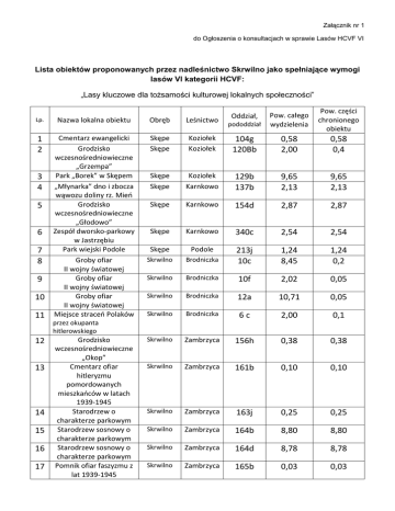 Załącznik nr 1 do Ogłoszenia o konsultacjach w sprawie Lasów HCVF VI Lista obiektów proponowanych przez nadleśnictwo Skrwilno jako spełniające wymogi lasów VI kategorii HCVF: „Lasy kluczowe dla tożsamości kulturowej lokalnych społeczności” pododdział Pow. całego wydzielenia Pow. części chronionego obiektu Oddział, Lp. Nazwa lokalna obiektu Obręb Leśnictwo 1 2 Cmentarz ewangelicki Grodzisko wczesnośredniowieczne „Grzempa” Park „Borek” w Skępem „Młynarka” dno i zbocza wąwozu doliny rz. Mień Grodzisko wczesnośredniowieczne „Głodowo” Zespół dworsko-parkowy w Jastrzębiu Park wiejski Podole Groby ofiar II wojny światowej Groby ofiar II wojny światowej Groby ofiar II wojny światowej Miejsce straceń Polaków Skępe Skępe Koziołek Koziołek 104g 120Bb 0,58 2,00 0,58 0,4 Skępe Skępe Koziołek Karnkowo 129b 137b 9,65 2,13 9,65 2,13 Skępe Karnkowo 154d 2,87 2,87 Skępe Karnkowo 340c 2,54 2,54 Skępe Podole Skrwilno Brodniczka 213j 10c 1,24 8,45 1,24 0,2 Skrwilno Brodniczka 10f 2,02 0,05 Skrwilno Brodniczka 12a 10,71 0,05 Skrwilno Brodniczka 6c 2,00 0,1 Skrwilno Zambrzyca 156h 0,38 0,38 Skrwilno Zambrzyca 161b 0,10 0,10 Skrwilno Zambrzyca 163j 0,25 0,25 Skrwilno Zambrzyca 164b 8,80 8,80 Skrwilno Zambrzyca 164d 8,78 8,78 Skrwilno Zambrzyca 165b 0,03 0,03 3 4 5 6 7 8 9 10 11 przez okupanta hitlerowskiego 12 13 14 15 16 17 Grodzisko wczesnośredniowieczne „Okop” Cmentarz ofiar hitleryzmu pomordowanych mieszkańców w latach 1939-1945 Starodrzew o charakterze parkowym Starodrzew sosnowy o charakterze parkowym Starodrzew sosnowy o charakterze parkowym Pomnik ofiar faszyzmu z lat 1939-1945 18 19 20 21 22 Zadrzewienie-park ogólnodostępny Grodzisko wczesnośredniowieczne „Somsiory” Miejsce rekreacjiogólnodostępne Miejsce rekreacjiogólnodostępne Groby ofiar II wojny światowej Urszulewo Ugoszcz 133Ad 1,46 1,46 Urszulewo Ugoszcz 138c 1,26 1,26 Urszulewo Urszulewo 41a 0,14 0,14 Urszulewo Urszulewo 41b 6,78 4,64 Urszulewo Urszulewo 59k 8,42 0,15