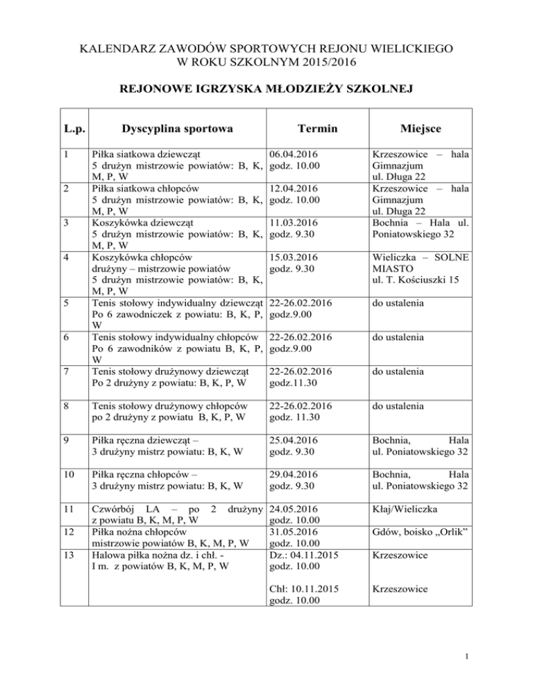 KALENDARZ ZAWODÓW SPORTOWYCH REJONU WIELICKIEGO W ROKU SZKOLNYM 2015/2016 REJONOWE IGRZYSKA MŁODZIEŻY SZKOLNEJ L.p. Dyscyplina sportowa Termin Piłka siatkowa dziewcząt 5 drużyn mistrzowie powiatów: B, K, M, P, W Piłka siatkowa chłopców 5 drużyn mistrzowie powiatów: B, K, M, P, W Koszykówka dziewcząt 5 drużyn mistrzowie powiatów: B, K, M, P, W Koszykówka chłopców drużyny – mistrzowie powiatów 5 drużyn mistrzowie powiatów: B, K, M, P, W Tenis stołowy indywidualny dziewcząt Po 6 zawodniczek z powiatu: B, K, P, W Tenis stołowy indywidualny chłopców Po 6 zawodników z powiatu B, K, P, W Tenis stołowy drużynowy dziewcząt Po 2 drużyny z powiatu: B, K, P, W 06.04.2016 godz. 10.00 8 1 2 3 12.04.2016 godz. 10.00 11.03.2016 godz. 9.30 Miejsce Krzeszowice – hala Gimnazjum ul. Długa 22 Krzeszowice – hala Gimnazjum ul. Długa 22 Bochnia – Hala ul. Poniatowskiego 32 15.03.2016 godz. 9.30 Wieliczka – SOLNE MIASTO ul. T. Kościuszki 15 22-26.02.2016 godz.9.00 do ustalenia 22-26.02.2016 godz.9.00 do ustalenia 22-26.02.2016 godz.11.30 do ustalenia Tenis stołowy drużynowy chłopców po 2 drużyny z powiatu B, K, P, W 22-26.02.2016 godz. 11.30 do ustalenia 9 Piłka ręczna dziewcząt – 3 drużyny mistrz powiatu: B, K, W 25.04.2016 godz. 9.30 Bochnia, Hala ul. Poniatowskiego 32 10 Piłka ręczna chłopców – 3 drużyny mistrz powiatu: B, K, W 29.04.2016 godz. 9.30 Bochnia, Hala ul. Poniatowskiego 32 11 Czwórbój LA – po 2 drużyny z powiatu B, K, M, P, W Piłka nożna chłopców mistrzowie powiatów B, K, M, P, W Halowa piłka nożna dz. i chł. I m. z powiatów B, K, M, P, W 24.05.2016 godz. 10.00 31.05.2016 godz. 10.00 Dz.: 04.11.2015 godz. 10.00 Kłaj/Wieliczka Chł: 10.11.2015 godz. 10.00 Krzeszowice 4 5 6 7 12 13 Gdów, boisko „Orlik” Krzeszowice 1 REJONOWA GIMNAZJADA MŁODZIEŻY SZKOLNEJ 1 Koszykówka dziewcząt – mistrzowie 22.04.2016 powiatu B, K, M, P, W, godz. 9.30 Bochnia – Hala ul. Poniatowskiego 32 2 Koszykówka chłopców – mistrzowie 27.04.2016 powiatu B, K, M, P, W, godz. 9.30 3 Piłka siatkowa dziewcząt - mistrzowie 13.04.2016 powiatu B, K, M, P, W godz. 10.00 4 Piłka siatkowa chłopców - mistrzowie 26.04.2016 powiatu B, K, M, P, W godz. 10.00 5 Piłka ręczna dziewcząt - mistrzowie 04.04.2016 powiatu B, K, W, M godz. 9.30 Wieliczka SOLNE MIASTO ul. T. Kościuszki 15 Krzeszowice – hala Gimnazjum ul. Długa 22 Krzeszowice – hala Gimnazjum ul. Długa 22 Bochnia – Hala ul. Poniatowskiego 32 6 Piłka ręczna chłopców - mistrzowie 08.04.2016 powiatu B, K, W, M godz. 9.30 Bochnia – Hala ul. Poniatowskiego 32 7 Piłka nożna chłopców 6-tki - mistrzowie powiatu B, K, M, P, W 02.06.2016 godz. 9.30 8 Tenis stołowy indywidualny dziewcząt – po 6 zawodniczek z powiatów: B, K, M, P, W Tenis stołowy indywidualny chłopców – po 6 zawodników z powiatów: B, K, M, P, W Tenis stołowy drużynowy dziewcząt – po 2 drużyny z powiatów B, K, M, P, W Tenis stołowy drużynowy chłopców – po 2 drużyny z powiatów: B, K, M, P, W Halowa piłka nożna dz. i chł. – mistrzowie powiatów B, K, M, P, W 14-18.03.2016 godz. 9.00 Krzeszowice-boisko „Orlik” obok KS „Świt” do ustalenia 9 10 11 12 14-18.03.2016 godz. 9.00 do ustalenia 14-18.03.2016 godz. 11.30 do ustalenia 14-18.03.2016 godz. 11.30 do ustalenia Dz. – 20.10.2015 godz. 10.00 Chł. – 28.10.2015 godz. 10.00 Krzeszowice – hala Gimnazjum ul. Długa 22 2 REJONOWA LICEALIADA MŁODZIEŻY SZKOLNEJ 1 Piłka siatkowa dziewcząt - mistrzowie 01.03.2016 powiatu B, K, M, P, W godz. 10.00 2 Piłka siatkowa chłopców - mistrzowie 09.03.2016 powiatu B, K, M, P, W godz. 10.00 3 Koszykówka dziewcząt - mistrzowie 12.02.2016 powiatu B, K, W godz. 9.30 4 Koszykówka chłopców - mistrzowie 09.02.2016 powiatu B, K, W godz. 9.30 Kampus Wielicki 5 Tenis stołowy drużynowy dziewcząt – w zależności od po 2 drużyny z powiatu B, K, P, W środków finansowych 07.04.2016 godz. 10.00 Tenis stołowy drużynowy chłopców – w zależności od po 2 drużyny z powiatu B, K, P, W środków finansowych 07.04.2016 godz. 10.00 Piłka ręczna dziewcząt i chłopców – Dz.–04.03.2016 I miejsce z powiatów B, W godz.9.30 Chł - 07.03.2016 godz. 11.00 do uzgodnienia 6 7. Krzeszowice – hala Gimnazjum ul. Długa 22 Krzeszowice – hala Gimnazjum ul. Długa 22 Bochnia – Hala ul. Poniatowskiego 32 do uzgodnienia Bochnia – Hala ul. Poniatowskiego 32 TELEFONY KONTAKTOWE ORGANIZATORÓW ZAWODÓW: Rejonowy Organizator Sportu – Andrzej Nowak – kom.: 608-609-086 [email protected] Skawina – Tomasz Kutek – praca: (12) 276-40-56, kom.: 608-505-736 [email protected] Wieliczka - Grzegorz Siemieniec – praca: tel/fax (12) 288-19-29, kom.: 509 519 628, [email protected] ZS Kłaj – Czesław Zaręba – (12) 284 – 11 – 76, kom.: 607 635 524 [email protected] Miechów – Ewa Pituch – praca: (41) 383-16-33, dom: (41) 383-18-28, kom. 602 537 535 [email protected] Proszowice – Wojciech Marzec – fax (12) 386-80-70, kom: 501 160 924 [email protected] Bochnia – Beata Wszołek – tel.: 14 648 08 33, kom. 691 194 587 [email protected] 3 Kraków powiat – Tomasz Piechota – tel.: (12) 282 14 65 wew. 23, kom.: 501 603 459 [email protected] Tenis stołowy - SZ Szczytniki – Wojciech Biernat – tel.: kom. 501 269 593 [email protected] [email protected] Piłka nożna IMS – Dariusz Mulik – Gdów – Tel.: 604 635 276 [email protected] UWAGA! - Przewodniczący Powiatowych SZS (B, K, M, P, W) na 3 dni przed terminem zawodów rejonowych mają obowiązek przesłania do organizatorów zawodów rejonowych zgłoszeń nazwy szkół, które reprezentują poszczególne powiaty. - Szkoły, przystępujące do współzawodnictwa muszą się zarejestrować przez System Rejestracji Szkół (www.srs.szs.pl), zgodnie z Kalendarzem wojewódzkim, nie później niż do 20 września 2015 r. oraz zgłaszać się do poszczególnych zawodów za pomocą w/w systemu. NIE MA INNEJ MOŻLIWOŚCI ZGŁOSZEN