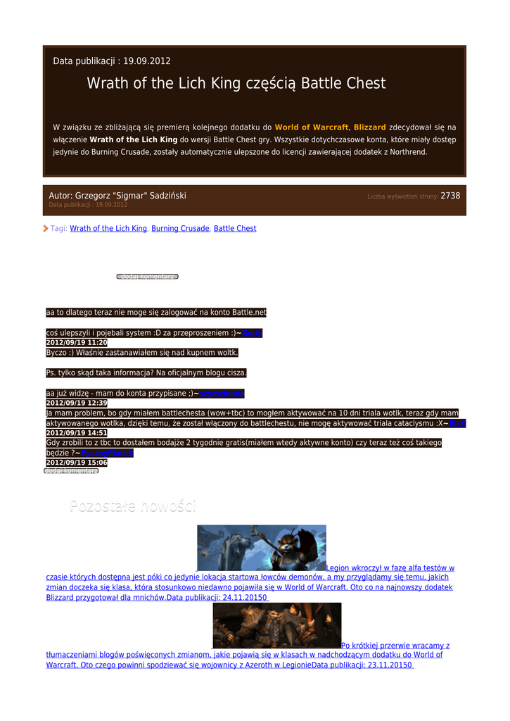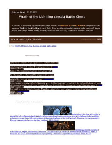Data publikacji : 19.09.2012 Wrath of the Lich King częścią Battle Chest W związku ze zbliżającą się premierą kolejnego dodatku do World of Warcraft, Blizzard zdecydował się na włączenie Wrath of the Lich King do wersji Battle Chest gry. Wszystkie dotychczasowe konta, które miały dostęp jedynie do Burning Crusade, zostały automatycznie ulepszone do licencji zawierającej dodatek z Northrend. Autor: Grzegorz "Sigmar" Sadziński Liczba wyświetleń strony: 2738 Data publikacji : 19.09.2012 Tagi: Wrath of the Lich King, Burning Crusade, Battle Chest Komentarz (4) dodaj komentarz aa to dlatego teraz nie moge się zalogować na konto Battle.net coś ulepszyli i pojebali system :D za przeproszeniem :)~Gorki 2012/09/19 11:20 Byczo :) Właśnie zastanawiałem się nad kupnem woltk. Ps. tylko skąd taka informacja? Na oficjalnym blogu cisza. aa już widzę - mam do konta przypisane ;)~szymcioooo 2012/09/19 12:39 Ja mam problem, bo gdy miałem battlechesta (wow+tbc) to mogłem aktywować na 10 dni triala wotlk, teraz gdy mam aktywowanego wotlka, dzięki temu, że został włączony do battlechestu, nie mogę aktywować triala cataclysmu :X~BicK 2012/09/19 14:51 Gdy zrobili to z tbc to dostałem bodajże 2 tygodnie gratis(miałem wtedy aktywne konto) czy teraz też coś takiego będzie ?~PysznyPlacek 2012/09/19 15:06 dodaj komentarz Pozostałe nowości Zapowiedź zmian w klasach - Mnich Legion wkroczył w fazę alfa testów w czasie których dostępna jest póki co jedynie lokacja startowa łowców demonów, a my przyglądamy się temu, jakich zmian doczeka się klasa, która stosunkowo niedawno pojawiła się w World of Warcraft. Oto co na najnowszy dodatek Blizzard przygotował dla mnichów.Data publikacji: 24.11.20150 Zapowiedź zmian w klasach - Wojownik Po krótkiej przerwie wracamy z tłumaczeniami blogów poświęconych zmianom, jakie pojawią się w klasach w nadchodzącym dodatku do World of Warcraft. Oto czego powinni spodziewać się wojownicy z Azeroth w LegionieData publikacji: 23.11.20150 Zapowiedź zmian w klasach - Szaman Kolejna zapowiedzieć, która pojawiła się jakiś czas temu na łamach oficjalnej strony społecznościowej dotyczy szamana. Największe zmiany w przypadku tej klasy dotknęły totemy oraz system zasobów specjalizacji Elemental oraz EnhancementData publikacji: 16.11.20150 11 urodziny World of Warcraft World of Warcraft obchodzi już swoje 11 urodziny. Z tej okazji Blizzard przygotował kilka zabawek, które powinny wszystkim przypomnieć sam początek przygody w świecie Azeroth - w rolach głównych Edwin VanCleef, Hogger, murlok oraz Windfury (w wersji nadmuchiwanej).Data publikacji: 16.11.20150 Zapowiedź zmian w klasach - Rycerz śmierci Kolejna zapowiedź opublikowana na łamach oficjalnej strony społecznościowej World of Warcraft poświęcona jest klasie rycerzy śmierci. Poniżej znajdziecie informacje między innymi o ujednoliceniu wszystkich run oraz nowej umiejętności specjalizacji Blood, która została zainspirowana Lordem Marrowgarem z Icecrown Citadel.Data publikacji: 15.11.20150 Wszystkie nowości