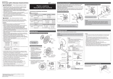 SI-2YH0A-006-03 Informacje ogólne dotyczące bezpieczeństwa OSTRZEŻENIE SI-2YH0A-006 – Aby uniknąć poważnych urazów: • Jeżeli piasta z dynamem 1,5 W - jest zaprojektowana wyłącznie do lamp diodowych (LED) - zostanie podłączona do lampy z żarówką, nie będzie można uzyskać wystarczającej intensywności oświetlenia. • Przed zamontowaniem części należy uważnie przeczytać niniejszą instrukcję. Luźne, zużyte lub uszkodzone części mogą spowodować poważne obrażenia jadącego rowerem. Zalecamy stosowanie jedynie oryginalnych części zamiennych Shimano. • Przed jazdą na rowerze należy sprawdzić, czy koła są prawidłowo zamocowane. Jeżeli koła są w jakikolwiek sposób poluzowane, mogą wypaść z roweru, powodując w konsekwencji poważne zranienie. • Należy sprawdzić, czy lampa świeci normalnie podczas jazdy nocą. • Należy dokładnie przeczytać niniejszą techniczną instrukcję serwisową i zachować ją na przyszłość. Piasta z prądnicą (Specyfikacja tarcz hamulca) Techniczna instrukcja serwisowa Model nr • Należy koniecznie zapoznać się z niniejszą instrukcją serwisową oraz instrukcją serwisową układu hamulców tarczowych. • Zgodnie z przepisami niemieckimi (StVZO) piasta z dynamem na obszarze Niemiec wymaga zabezpieczenia przeciwprzepięciowego. Ta piasta z dynamem (3,0 W) nie ma zabezpieczenia przeciwprzepięciowego wewnątrz samej piasty. Należy użyć zewnętrznego zabezpieczenia przeciwprzepięciowego oznaczonego symbolem gwarantującym zgodność z niemieckimi przepisami (zabezpieczenia przeciwprzepięciowego Shimano SM-DH10 lub analogicznego produktu). • Piasta z dynamem (1,5 W) nie jest zgodna z przepisami niemieckimi (StVZO). Zawsze należy zapoznać się z przepisami obowiązującymi w kraju, w którym będzie ona używana. • Sprawdzić czy golenie widelca przedniego, nie są skrzywione. Jeśli końce widelca nie są nierównoległe, deformacja osi piasty może powodować hałas powstający wskutek napięć mechanicznych wewnątrz piasty. • Należy pamiętać o zamontowaniu piasty z dynamem na widelcu tak, aby strona z zaciskiem znajdowała się z prawej strony, patrząc w kierunku przodu roweru. Jeśli strona z zaciskiem jest skierowana w lewo, piasta może niepoprawnie obracać się podczas jazdy. • Przed użyciem piasty należy sprawdzić, czy wtyczka z przewodem jest prawidłowo podłączona. • Odpowiednie żarówki <Piasta z dynamem 3,0 W> Lampa przednia 6,0 V / 2,4 W 6,0 V / 3,0 W 9,6 V / 5,0 W* Lampa tylna 6,0 V / 0,6 W ----------- *: Wyłącznie do użytku z lampą diodową (LED) LP-R600 (zgodna ze sportową piastą z prądnicą) <Piasta z dynamem 2,4 W> Lampa przednia 6,0 V / 2,4 W DH-S501 DH-T785 DH-T665 646 - 716 mm Napięcie/moc 6 V / 3,0 W Model nr DH-3D80* DH-3D72* DH-3D35 DH-2D35 646 - 716 mm 400 – 716 mm 26 - 28 cali 16 – 28 inch Napięcie/moc 6 V / 3,0 W 6 V/2.4 W DH-3D30 Uwaga: W przypadku wprowadzenia ulepszeń dane techniczne mogą ulec zmianie bez powiadomienia. (Polish) Przedni widelec Przedni widelec DH-2D30 DH-S700 DH-1D70 Kompatybilny Zewnętrzna średnica opony rozmiar Koło 400 - 716 mm 492 - 716 mm 16 - 28 cali 20 - 28 cali Napięcie/moc 6 V / 3,0 W 6 V / 2,4 W Mocowanie błotnika Mocowanie koszyka Podkładka Moment dokręcania: 20 - 25 Nm Nakrętka kołpakowa (M9) Mocowanie błotnika Uwaga: Dźwignia zacisku Podczas dokręcania nakrętek kołpakowych należy naprzemiennie dokręcać nakrętki z obu stron i nie koncentrować całej siły na dokręcaniu i odkręcaniu nakrętki kołpakowej tylko z jednej strony koła. W przeciwnym przypadku oś piasty może się obracać, powodując nadmierne dokręcenie lub poluzowanie nakrętek blokujących. Dźwignia zacisku Uwaga: • Wraz z zaciskami nie należy używać zębatej podkładki osi. • Podłączyć dwa kable, sprawdzając prawidłowy przepływ prądu. 6 V / 1,5 W * : Sportowa piasta z prądnicą Podłączanie kabli Montaż tarczy Podłączyć kable w sposób pokazany na poniższym rysunku. Tarcze mocowane w systemie Center Lock For center lock type Tarcza Uwaga: Uwaga: Podczas podłączania przewodów należy zdrapać farbę z terminali podłączeniowych dla przewodów. • Przewody należy tak opleść wokół widelca przedniego lub mocowania koszyka, aby nie dostały się one między szprychy lub jakiekolwiek inne części podczas jazdy. Jeśli położenie piasty może się podczas jazdy zmieniać w stosunku do lampy, na przykład w przypadku używania widelcy amortyzowanych, należy się upewnić, że przewód jest podłączony tak, aby nie był zbyt luźny ani zbyt naprężony w żadnym punkcie zakresu ruchu. • Należy ją podłączyć tak, aby prąd z dynama przepływał przez przewód od terminala zasilającego piasty do terminala masy. • Aby odłączyć lampę od dynama, należy zdjąć osłonę wtyczki. • Nie wolno jeździć na rowerze ze zdjętą Osłoną wtyczki, gdyż może to spowodować wciągnięcie kabla przez koło roweru. • Podczas zdejmowania koła roweru należy najpierw zdjąć wtyczkę. Silne pociągnięcie za kable może spowodować ich zerwanie lub brak styku. Ponadto podczas montażu koła należy najpierw zamocować je do widelca, a następnie założyć wtyczkę. Terminal masy Uwaga: Pierścień mocujący tarczę • Należy uważać, aby nie pomylić kabla masy z kablem zasilania. Jeśli kable zostaną niepoprawnie podłączone, lampa nie będzie świecić. • Przed połączeniem należy skręcić kable, aby trzymały się razem. • Zalecane dane techniczne przewodów. TL-LR15 Moment dokręcania: 40 - 50 Nm Izolacja Kabel Tarcze mocowane na 6 śrub 1. 2. Zamontować tarczę oraz podkładkę dociskającą, a następnie prowizorycznie dokręcić śruby mocowania tarczy, jak pokazano na rysunku 1. W rękawicach ochronnych chwycić mocno tarczę i obrócić ją zgodnie z ruchem wskazówek zegara, jak pokazano na rysunku 2. Jednocześnie dokręcać śruby mocujące tarczę w kolejno