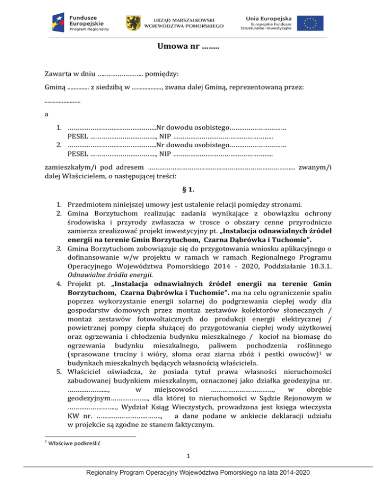 Umowa nr …….. Zawarta w dniu …..……………….. pomiędzy: Gminą .............. z siedzibą w ..................., zwana dalej Gminą, reprezentowaną przez: ....................... a 1. ………………………………………..Nr dowodu osobistego………………………… PESEL …………………………….., NIP …………………………………………….. 2. ………………………………………..Nr dowodu osobistego………………………… PESEL …………………………….., NIP …………………………………………….. zamieszkałym/i pod adresem …………………………………………………………………... zwanym/i dalej Właścicielem, o następującej treści: § 1. 1. Przedmiotem niniejszej umowy jest ustalenie relacji pomiędzy stronami. 2. Gmina Borzytuchom realizując zadania wynikające z obowiązku ochrony środowiska i przyrody zwłaszcza w trosce o obszary cenne przyrodniczo zamierza zrealizować projekt inwestycyjny pt. „Instalacja odnawialnych źródeł energii na terenie Gmin Borzytuchom, Czarna Dąbrówka i Tuchomie”. 3. Gmina Borzytuchom zobowiązuje się do przygotowania wniosku aplikacyjnego o dofinansowanie w/w projektu w ramach w ramach Regionalnego Programu Operacyjnego Województwa Pomorskiego 2014 - 2020, Poddziałanie 10.3.1. Odnawialne źródła energii. 4. Projekt pt. „Instalacja odnawialnych źródeł energii na terenie Gmin Borzytuchom, Czarna Dąbrówka i Tuchomie”. ma na celu ograniczenie spalin poprzez wykorzystanie energii solarnej do podgrzewania ciepłej wody dla gospodarstw domowych przez montaż zestawów kolektorów słonecznych / montaż zestawów fotowoltaicznych do produkcji energii elektrycznej / powietrznej pompy ciepła służącej do przygotowania ciepłej wody użytkowej oraz ogrzewania i chłodzenia budynku mieszkalnego / kocioł na biomasę do ogrzewania budynku mieszkalnego, paliwem pochodzenia roślinnego (sprasowane trociny i wióry, słoma oraz ziarna zbóż i pestki owoców)1 w budynkach mieszkalnych będących własnością właściciela. 5. Właściciel oświadcza, że posiada tytuł prawa własności nieruchomości zabudowanej budynkiem mieszkalnym, oznaczonej jako działka geodezyjna nr. ………………...., w miejscowości ……………………………, w obrębie geodezyjnym……………….., dla której to nieruchomości w Sądzie Rejonowym w …………………….., Wydział Ksiąg Wieczystych, prowadzona jest księga wieczysta KW nr. ……………………………., a dane podane w ankiecie deklaracji udziału w projekcie są zgodne ze stanem faktycznym. 1 Właściwe podkreślić 1 6. Właściciel zobowiązuje się do zawarcia umowy użyczenia z Gminą Borzytuchom. 7. Właściciel oświadcza, że na nieruchomości zamieszkuje od 1 do 4 osób/powyżej 4 osoby2. § 2. Okres obowiązywania umowy 1. 2. 3. 4. Umowę zawiera się na cały okres trwania projektu pt. „Instalacja odnawialnych źródeł energii na terenie Gmin Borzytuchom, Czarna Dąbrówka i Tuchomie”, aż do chwili pełnej amortyzacji zestawu kolektora słonecznego/ fotowoltaicznego / pompy ciepła / kotła na biomasę / pompy ciepła / kotła na biomasę. Realizacja prac instalacyjnych objętych niniejszą umową nastąpi po podpisaniu umowy o dofinansowanie przedsięwzięcia, natomiast zakończenie projektu nastąpi po upływie minimum 5 lat, licząc od dnia zatwierdzenia końcowego raportu z realizacji projektu. Umowa ulega rozwiązaniu ze skutkiem natychmiastowym w następujących przypadkach: gdy Projekt nie uzyska pozytywnego wyniku na etapie oceny formalnej lub merytorycznej wniosku aplikacyjnego złożonego w ramach Regionalnego Programu Operacyjnego Województwa Pomorskiego 2014 - 2020, Poddziałanie 10.3.1. Odnawialne źródła energii, obejmującego zakup i instalację zestawu kolektora słonecznego/ fotowoltaicznego / pompy ciepła / kotła na biomasę w indywidualnych gospodarstwach domowych mieszkańców Gminy Borzytuchom, gdy nie dojdzie do podpisania umowy o dofinansowanie przedsięwzięcia pt. „Instalacja odnawialnych źródeł energii na terenie Gmin Borzytuchom, Czarna Dąbrówka i Tuchomie”. , nie dokonania wpłaty przez Właściciela w terminie i wysokości określonej w § 4 ust.3 umowy z zastrzeżeniem postanowień z § 4 ust. 5, nie wyrażenia zgody zgodnie z § 4 ust. 7, rozwiązania umowy użyczenia części nieruchomości. W przypadku wcześniejszego rozwiązania umowy przez Właściciela, dokona on zwrotu nakładów poniesionych przez Gminę na zakup i zainstalowanie zestawu kolektora słonecznego/ fotowoltaicznego / pompy ciepła / kotła na biomasę. Postanowienie ust. 3 mają zastosowanie w przypadku, zbycia nieruchomości, jeśli nabywca lub następca prawny nie wstąpi w prawa Właściciela jako strony niniejszej umowy. §3 Warunki organizacyjne, własnościowe i eksploatacyjne 1. Gmina Borzytuchom jako inwestor i beneficjent zabezpieczy realizację projektu zgodnie z obowiązującymi przepisami. 2. Właściciel oświadcza, że wyraża zgodę na umiejscowienie zestawu kolektora słonecznego/ fotowoltaicznego / pompy ciepła / kotła na biomasę w obszarze 2 Właściwe podkreślić 2 nieruchomości opisanej w § 1 ust.5 przez cały okres obowiązywania umowy, o którym mowa w § 2 ust.1 3. Właściciel wyraża zgodę na przeprowadzenie wszelkich niezbędnych prac, w celu montażu urządzeń zestawu kolektora słonecznego/ fotowoltaicznego / pompy ciepła / kotła na biomasę. 4. Szczegółowe określenie miejsca lokalizacji urządzeń oraz sposób ich montażu, zostaną określone zgodnie ze sporządzonym w tym zakresie projektem technicznym i technologicznym uwzględniającym obowiązujące normy branżowe i standardy techniczne. 5. Właściciel upoważnia Gminę, do występowania w jego imieniu przez właściwymi organami administracyjnymi, przy ubieganiu się o uzyskanie przewidzianych przepisami szczególnymi po