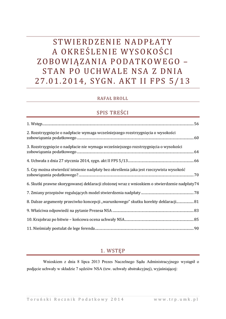 STWIERDZENIE NADPŁATY A OKREŚLENIE WYSOKOŚCI ZOBOWIĄZANIA PODATKOWEGO – STAN PO UCHWALE NSA Z DNIA 27.01.2014, SYGN. AKT II FPS 5/13 RAFAŁ BROLL SPIS TREŚCI 1. Wstęp............................................................................................................................................................................... 56 2. Rozstrzygnięcie o nadpłacie wymaga wcześniejszego rozstrzygnięcia o wysokości zobowiązania podatkowego ....................................................................................................................................... 60 3. Rozstrzygnięcie o nadpłacie nie wymaga wcześniejszego rozstrzygnięcia o wysokości zobowiązania podatkowego ....................................................................................................................................... 64 4. Uchwała z dnia 27 stycznia 2014, sygn. akt II FPS 5/13 ............................................................................ 66 5. Czy można stwierdzić istnienie nadpłaty bez określenia jaka jest rzeczywista wysokość zobowiązania podatkowego? ..................................................................................................................................... 70 6. Skutki prawne skorygowanej deklaracji złożonej wraz z wnioskiem o stwierdzenie nadpłaty74 7. Zmiany przepisów regulujących model stwierdzenia nadpłaty ............................................................. 78 8. Dalsze argumenty przeciwko koncepcji „warunkowego” skutku korekty deklaracji.................... 81 9. Właściwa odpowiedź na pytanie Prezesa NSA .............................................................................................. 83 10. Krajobraz po bitwie – końcowa ocena uchwały NSA................................................................................ 85 11. Nieśmiały postulat de lege ferenda .................................................................................................................. 90 1. WSTĘP Wnioskiem z dnia 8 lipca 2013 Prezes Naczelnego Sądu Administracyjnego wystąpił o podjęcie uchwały w składzie 7 sędziów NSA (tzw. uchwały abstrakcyjnej), wyjaśniającej: Toruński Rocznik Podatkowy 2014 www.trp.umk.pl „Czy w przypadku zakwestionowania przez organ podatkowy prawidłowości skorygowanej deklaracji podatkowej złożonej wraz z wnioskiem o stwierdzenie nadpłaty, zgodnie z art. 75 § 3 ustawy z dnia 29 sierpnia 1997 r. - Ordynacja podatkowa (Dz. U. z 2012 r. poz. 749 ze zm.), w brzmieniu obowiązującym od dnia 1 stycznia 2003 r., organ podatkowy przed rozpatrzeniem tego wniosku powinien wszcząć z urzędu postępowanie podatkowe celem określenia wysokości zobowiązania podatkowego, o którym mowa w art. 21 § 3 tej ustawy?”. Prezes NSA stwierdził, że przyczyną wystąpienia z wnioskiem jest stan prawny wywołujący w orzecznictwie sądów administracyjnych wątpliwości odnośnie dwóch zagadnień: po pierwsze, czy organ podatkowy przy rozpoznawaniu wniosku o stwierdzenie nadpłaty w przypadku zakwestionowania korekty deklaracji podatkowej złożonej wraz z tym wnioskiem zanim wypowie się co do jego zasadności, każdorazowo zobowiązany jest przeprowadzić postępowanie podatkowe w zakresie określenia prawidłowej wysokości zobowiązania podatkowego i wydać decyzję, o której mowa w art. 21 § 3 o.p., a po drugie, czy złożenie wniosku o stwierdzenie nadpłaty wywołuje skutek w postaci wszczęcia postępowania podatkowego, czy też organ podatkowy musi dokonać wszczęcia takiego postępowania z urzędu. Zdaniem Prezesa NSA rozstrzygniecie tych dwóch zagadnień wymaga dokonania oceny relacji, jakie zachodzą pomiędzy postępowaniem podatkowym w przedmiocie stwierdzenia nadpłaty w przypadkach zakwestionowania przez organ podatkowy wysokości podatku wskazanej przez podatnika w korekcie deklaracji, a postępowaniem podatkowym w sprawie określenia wysokości zobowiązania podatkowego w wyżej przedstawionym zakresie. W związku z przedstawieniem tego pytania dnia 27.01.2014 skład siedmiu sędziów NSA podjął uchwałę o sygn. akt II FPS 5/13 w brzmieniu: „W przypadku zakwestionowania prawidłowości skorygowanej deklaracji podatkowej złożonej wraz z wnioskiem o stwierdzenie nadpłaty, zgodnie z art. 75 § 3 ustawy z dnia 29 sierpnia 1997 r. – Ordynacja podatkowa (Dz. U. z 2012 r., poz. 749 ze zm.), organ podatkowy nie ma obowiązku przed rozpatrzeniem tego wniosku wszczynać w każdej sprawie postępowania celem określenia wysokości zobowiązania podatkowego, o którym mowa w art. 21 § 3 wymienionej ustawy”. Jak widać sama sentencja uchwały nie rozstrzyga żadnych wątpliwości i rozbieżności. Wynika z niej tylko, że w jednych sprawach organ podatkowy ma obowiązek wszczynać postępowanie w celu określenia wysokości zobowiązania podatkowego, a w innych nie ma. Aby jednak spróbować ustalić w jakich ma, a w jakich nie ma i dlaczego, sięgnąć trzeba do uzasadnienia uchwały. 57 Toruński Rocznik Podatkowy 2014 www.trp.umk.pl W mojej ocenie, kontrowersje i wątpliwości wywołujące rozbieżność poglądów w orzecznictwie sądów administracyjnych w powyższej kwestii sięgają znacznie głębiej, niż wynika to z przedstawionego przez Prezesa NSA pytania i bynajmniej nie ograniczają się do zagadnień proceduralnych. Zadane pytanie dotyczy sytuacji, kiedy organ podatkowy kwestionuje prawidłowość skorygowanej deklaracji podatkowej, co jest równoznaczne z kwestionowaniem istnienia lub wysokości nadpłaty wskazanej we wniosku o stwierdzenie nadpłaty. Kwestionując wysokość nadpłaty, organ podatkowy wydać może dwa rodzaje rozstrzygnięć – odmówić jej stwierdzenia, jeżeli uważa, że nadpłata w ogóle nie istnieje, lub stwierdzić nadpłatę, ale w niższej wysokości niż domagał się tego podatnik we wniosku. Kwestia obowiązku wszczęcia postępowania, której wprost dotyczy zagadnienie prawne przek