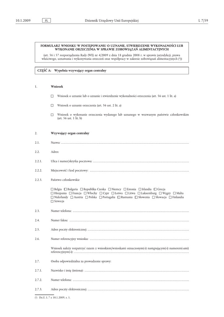 10.1.2009 Dziennik Urzędowy Unii Europejskiej PL FORMULARZ WNIOSKU W POSTĘPOWANIU O UZNANIE, STWIERDZENIE WYKONALNOŚCI LUB WYKONANIE ORZECZENIA W SPRAWIE ZOBOWIĄZAŃ ALIMENTACYJNYCH (art. 56 i 57 rozporządzenia Rady (WE) nr 4/2009 z dnia 18 grudnia 2008 r. w sprawie jurysdykcji, prawa właściwego, uznawania i wykonywania orzeczeń oraz współpracy w zakresie zobowiązań alimentacyjnych (1)) CZĘŚĆ A: 1. Wypełnia wzywający organ centralny Wniosek Wniosek o uznanie lub o uznanie i stwierdzenie wykonalności orzeczenia (art. 56 ust. 1 lit. a) Wniosek o uznanie orzeczenia (art. 56 ust. 2 lit. a) Wniosek o wykonanie orzeczenia wydanego lub uznanego w wezwanym państwie członkowskim (art. 56 ust. 1 lit. b) 2. Wzywający organ centralny 2.1. Nazwa: . . . . . . . . . . . . . . . . . . . . . . . . . . . . . . . . . . . . . . . . . . . . . . . . . . . . . . . . . . . . . . . . . . . . . . . . . . . . . . . . . . . . . . . . . . . . . . . . . . . . . . . . . . . . . . . . . . . . . . . . 2.2. Adres: 2.2.1. Ulica i numer/skrytka pocztowa: . . . . . . . . . . . . . . . . . . . . . . . . . . . . . . . . . . . . . . . . . . . . . . . . . . . . . . . . . . . . . . . . . . . . . . . . . . . . . . . . . . . . . . . . . . 2.2.2. Miejscowość i kod pocztowy: . . . . . . . . . . . . . . . . . . . . . . . . . . . . . . . . . . . . . . . . . . . . . . . . . . . . . . . . . . . . . . . . . . . . . . . . . . . . . . . . . . . . . . . . . . . . . 2.2.3. Państwo członkowskie Belgia Bułgaria Republika Czeska Niemcy Estonia Irlandia Grecja Hiszpania Francja Włochy Cypr Łotwa Litwa Luksemburg Węgry Malta Niderlandy Austria Polska Portugalia Rumunia Słowenia Słowacja Finlandia Szwecja 2.3. Numer telefonu: . . . . . . . . . . . . . . . . . . . . . . . . . . . . . . . . . . . . . . . . . . . . . . . . . . . . . . . . . . . . . . . . . . . . . . . . . . . . . . . . . . . . . . . . . . . . . . . . . . . . . . . . . . . . . 2.4. Numer faksu: . . . . . . . . . . . . . . . . . . . . . . . . . . . . . . . . . . . . . . . . . . . . . . . . . . . . . . . . . . . . . . . . . . . . . . . . . . . . . . . . . . . . . . . . . . . . . . . . . . . . . . . . . . . . . . . . 2.5. Adres poczty elektronicznej: . . . . . . . . . . . . . . . . . . . . . . . . . . . . . . . . . . . . . . . . . . . . . . . . . . . . . . . . . . . . . . . . . . . . . . . . . . . . . . . . . . . . . . . . . . . . . . . 2.6. Numer referencyjny wniosku: . . . . . . . . . . . . . . . . . . . . . . . . . . . . . . . . . . . . . . . . . . . . . . . . . . . . . . . . . . . . . . . . . . . . . . . . . . . . . . . . . . . . . . . . . . . . . Wniosek należy rozpatrzyć razem z wnioskiem/wnioskami oznaczonym(-i) następującym(-i) numerem(-ami) referencyjnym(-i): . . . . . . . . . . . . . . . . . . . . . . . . . . . . . . . . . . . . . . . . . . . . . . . . . . . . . . . . . . . . . . . . . . . . . . . . . . . . . . . . . . . . . . . . . . . . . . . . . . . . . . . . . . . . 2.7. Osoba odpowiedzialna za prowadzenie sprawy: 2.7.1. Nazwisko i imię (imiona): . . . . . . . . . . . . . . . . . . . . . . . . . . . . . . . . . . . . . . . . . . . . . . . . . . . . . . . . . . . . . . . . . . . . . . . . . . . . . . . . . . . . . . . . . . . . . . . . . . 2.7.2. Numer telefonu: . . . . . . . . . . . . . . . . . . . . . . . . . . . . . . . . . . . . . . . . . . . . . . . . . . . . . . . . . . . . . . . . . . . . . . . . . . . . . . . . . . . . . . . . . . . . . . . . . . . . . . . . . . . . . 2.7.3. Adres poczty elektronicznej: . . . . . . . . . . . . . . . . . . . . . . . . . . . . . . . . . . . . . . . . . . . . . . . . . . . . . . . . . . . . . . . . . . . . . . . . . . . . . . . . . . . . . . . . . . . . . . . (1) Dz.U. L 7 z 10.1.2009, s. 1. L 7/59 L 7/60 Dziennik Urzędowy Unii Europejskiej PL 3. Wezwany organ centralny 3.1. Nazwa: . . . . . . . . . . . . . . . . . . . . . . . . . . . . . . . . . . . . . . . . . . . . . . . . . . . . . . . . . . . . . . . . . . . . . . . . . . . . . . . . . . . . . . . . . . . . . . . . . . . . . . . . . . . . . . . . . . . . . . . . 3.2. Adres: 3.2.1. Ulica i numer/skrytka pocztowa: . . . . . . . . . . . . . . . . . . . . . . . . . . . . . . . . . . . . . . . . . . . . . . . . . . . . . . . . . . . . . . . . . . . . . . . . . . . . . . . . . . . . . . . . . . 3.2.2. Miejscowość i kod pocztowy: . . . . . . . . . . . . . . . . . . . . . . . . . . . . . . . . . . . . . . . . . . . . . . . . . . . . . . . . . . . . . . . . . . . . . . . . . . . . . . . . . . . . . . . . . . . . . 3.2.3. Państwo członkowskie Belgia Bułgaria Republika Czeska Niemcy Estonia Irlandia Grecja Hiszpania Francja Włochy Cypr Łotwa Litwa Luksemburg Węgry Malta Niderlandy Austria Polska Portugalia Rumunia Słowenia Słowacja Finlandia Szwecja 4. Dokumenty załączone (*) do wniosku w przypadku gdy orzeczenie wydano w państwie członkowskim odpis orzeczenia/ugody sądowej/dokumentu urzędowego wyciąg z orzeczenia/ugody sądowej/dokumentu urzędowego w postaci formularza określonego w załączniku I, II, III lub IV transliteracja lub tłumaczenie treści formularza określonego w załączniku I, II, III lub IV w odpowiednim przypadku — odpis decyzji stwierdzającej wykonalność dokument wskazujący kwotę zaległych płatności i datę, w której dokonano obliczenia dokument stwierdzający, że powód skorzystał z pomocy prawnej lub zwolnienia z kosztów i wydatków dokument stwierdzający, że powód uczestniczył w bezpłatnym postępowaniu przed organem administracyjnym w państwie członkowskim pochodzenia i że spełnia warunki finansowe uprawniające do skorzystania z pomocy prawnej lub zwolnienia z kosztów i wydatków dokument nadający organowi publicznemu uprawnienie do wystąpienia o zwrot należności z tytułu świadczeń wypłaconych wierzycielowi i poświadczający wypłatę takich świadczeń inne (proszę wskazać): . . . . . . . . . . . . . . . . . . . . . . . . . . . . . . . . . . . . . . . . . . . . . . . . . . . .
