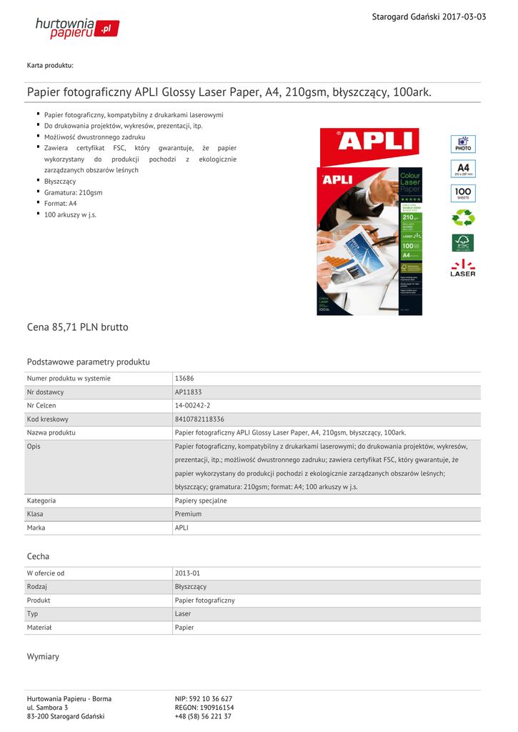 Starogard Gdański 2017-03-03 Karta produktu: Papier fotograficzny APLI Glossy Laser Paper, A4, 210gsm, błyszczący, 100ark. Papier fotograficzny, kompatybilny z drukarkami laserowymi Do drukowania projektów, wykresów, prezentacji, itp. Możliwość dwustronnego zadruku Zawiera certyfikat wykorzystany do FSC, który produkcji gwarantuje, pochodzi z że papier ekologicznie zarządzanych obszarów leśnych Błyszczący Gramatura: 210gsm Format: A4 100 arkuszy w j.s. Cena 85,71 PLN brutto Podstawowe parametry produktu Numer produktu w systemie 13686 Nr dostawcy AP11833 Nr Celcen 14-00242-2 Kod kreskowy 8410782118336 Nazwa produktu Papier fotograficzny APLI Glossy Laser Paper, A4, 210gsm, błyszczący, 100ark. Opis Papier fotograficzny, kompatybilny z drukarkami laserowymi; do drukowania projektów, wykresów, prezentacji, itp.; możliwość dwustronnego zadruku; zawiera certyfikat FSC, który gwarantuje, że papier wykorzystany do produkcji pochodzi z ekologicznie zarządzanych obszarów leśnych; błyszczący; gramatura: 210gsm; format: A4; 100 arkuszy w j.s. Kategoria Papiery specjalne Klasa Premium Marka APLI Cecha W ofercie od 2013-01 Rodzaj Błyszczący Produkt Papier fotograficzny Typ Laser Materiał Papier Wymiary Hurtowania Papieru - Borma ul. Sambora 3 83-200 Starogard Gdański NIP: 592 10 36 627 REGON: 190916154 +48 (58) 56 221 37 Starogard Gdański 2017-03-03 Karta katalogowa produktu cd. Papier fotograficzny APLI Glossy Laser Paper, A4, 210gsm, błyszczący, 100ark. Format A4 Gramatura (g/m2) 210 Wymiary (mm) 210x297 Wspólny słownik zamówień CPV 30197644-2 Papier kserograficzny Certyfikaty Nowy produkt w ofercie Standard Hit Standard Ilość Ilość arkuszy 100 Kolor Kolor Biały błyszczący Serdecznie zapraszamy do współpracy Hurtowania Papieru - Borma zespół. Hurtowania Papieru - Borma ul. Sambora 3 83-200 Starogard Gdański NIP: 592 10 36 627 REGON: 190916154 +48 (58) 56 221 37