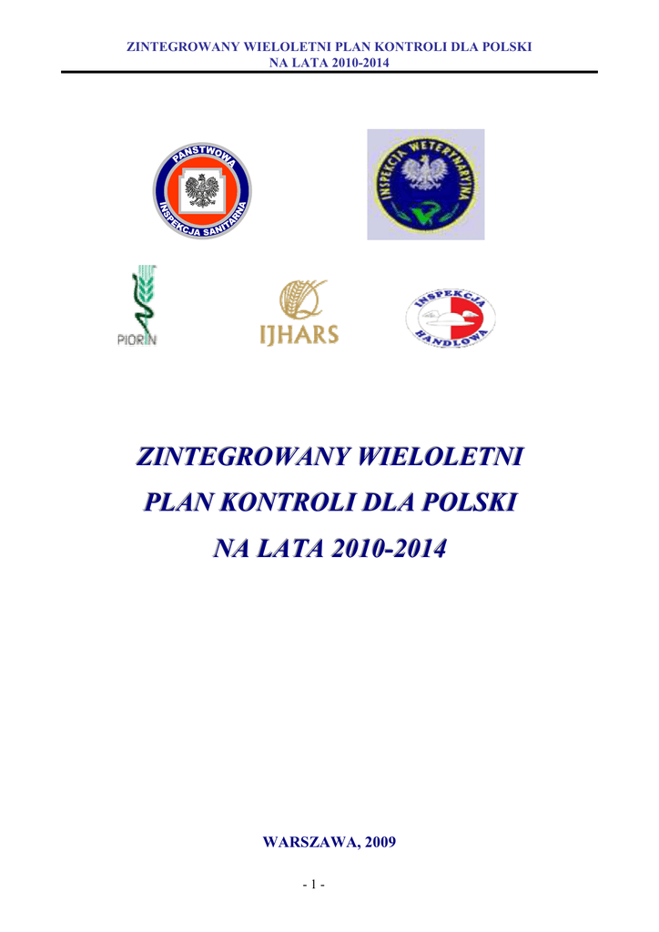 ZINTEGROWANY WIELOLETNI PLAN KONTROLI DLA POLSKI NA LATA 2010-2014 ZINTEGROWANY WIELOLETNI PLAN KONTROLI DLA POLSKI NA LATA 2010-2014 WARSZAWA, 2009 -1- ZINTEGROWANY WIELOLETNI PLAN KONTROLI DLA POLSKI NA LATA 2010-2014 PLAN AKCEPTUJĄ: Lp. Nazwisko i imię 1 Pan Janusz Związek 2 Pan Andrzej Wojtyła Funkcja Podpis Główny Lekarz Weterynarii Główny Inspektor Sanitarny Główny Inspektor 3 Pan Tadeusz Kłos Ochrony Roślin i Nasiennictwa Główny Inspektor 4 Pan Stanisław Kowalczyk Jakości Handlowej Artykułów RolnoSpożywczych Prezes Urzędu Ochrony 5 Pani Małgorzata Krasnodębska-Tomkiel Konkurencji i Konsumentów -2- ZINTEGROWANY WIELOLETNI PLAN KONTROLI DLA POLSKI NA LATA 2010-2014 WPROWADZENIE Zgodnie z przepisami rozporządzenia Parlamentu Europejskiego i Rady nr 882/2004/WE z dnia 29 kwietnia 2004 r. w sprawie kontroli urzędowych przeprowadzanych w celu sprawdzenia zgodności z prawem paszowym i żywnościowym oraz regułami dotyczącymi zdrowia zwierząt i dobrostanu zwierząt w celu zapewnienia efektywnego wykonania przepisów rozporządzenia (WE) nr 178/2002, reguł dotyczących zdrowia zwierząt i ich dobrostanu oraz art. 45 niniejszego rozporządzenia, każde Państwo Członkowskie jest zobowiązane do przygotowania jednego zintegrowanego wieloletniego krajowego planu kontroli. Plan ma za zadanie skonsolidowanie i zintegrowanie na poziomie krajowym planów kontroli właściwych władz z poziomu centralnego, regionalnego i lokalnego wszystkich sektorów objętych prawem paszowym, żywnościowym, zdrowia i dobrostanu zwierząt oraz roślin. -3- ZINTEGROWANY WIELOLETNI PLAN KONTROLI DLA POLSKI NA LATA 2010-2014 PUNKT KONTAKTOWY punkt kontaktowy: Główny Inspektorat Sanitarny adres: ul. Długa 38/40, 01-922 Warszawa e-mail [email protected] [email protected] telefon +48(22)-536-13-48 faks +48(22)-635-61-94 -4- ZINTEGROWANY WIELOLETNI PLAN KONTROLI DLA POLSKI NA LATA 2010-2014 TREŚĆ PLANU WPROWADZENIE ......................................................................................... 3 PUNKT KONTAKTOWY ................................................................................. 4 1. OGÓLNE CELE STRATEGICZNE ................................................................. 7 2. WYZNACZENIE ODPOWIEDZIALNYCH URZĘDÓW, KRAJOWYCH LABORATORIÓW REFERENCYJNYCH ORAZ INSTYTUCJI PRZEPROWADZAJĄCYCH KONTROLE ........................................................... 8 2.1 WŁAŚCIWE INSTYTUCJE......................................................................................................8 2.2 ZATRUDNIENIE W ORGANACH ZWIĄZANYCH Z URZĘDOWĄ KONTROLĄ ŻYWNOŚCI W POLSCE ..............................................................................................................21 2.3 KRAJOWE LABORATORIA REFERENCYJNE ..................................................................22 2.4 LABORATORIA URZĘDOWEJ KONTROLI ŻYWNOŚCI I PASZ....................................23 2.5 ZASOBY WSPOMAGAJĄCE DZIAŁANIA W ZAKRESIE KONTROLI URZĘDOWYCH ........................................................................................................................................................28 3. ORGANIZACJA I ZARZĄDZANIE KONTROLAMI URZĘDOWYMI PRZEZ WŁAŚCIWE INSTYTUCJE ............................................................................. 32 3.1 SYSTEMY KONTROLI I PROCEDURY DOTYCZĄCE PRAWA ŻYWNOŚCIOWEGO32 3.2 SYSTEMY KONTROLI I PROCEDURY DOTYCZĄCE PRAWA PASZOWEGO .............48 3.3 SYSTEMY KONTROLI I PROCEDURY DOTYCZĄCE PRAWA O ZDROWIU I DOBROSTANIE ZWIERZĄT ......................................................................................................51 3.3.1 ZDROWIE ZWIERZĄT...................................................................................................51 3.3.2 IDENTYFIKACJA I REJESTRACJA ZWIERZĄT ........................................................58 3.3.3 DOBROSTAN ZWIERZĄT.............................................................................................59 3.3.4 HANDEL I OBRÓT ZWIERZĘTAMI.............................................................................61 3.3.5 WYMOGI WZAJEMNEJ ZGODNOŚCI.........................................................................62 3.4 SYSTEMY KONTROLI I PROCEDURY DOTYCZĄCE ZDROWIA ROŚLIN .................63 3.5 POZOSTAŁOŚCI ŚRODKÓW OCHRONY ROŚLIN W PŁODACH ROLNYCH - PRÓBY INTERWENCYJNE ......................................................................................................................71 3.6 SYSTEMY KONTROLI I PROCEDURY DOTYCZĄCE KONTROLI GRANICZNEJ .......72 -5- ZINTEGROWANY WIELOLETNI PLAN KONTROLI DLA POLSKI NA LATA 2010-2014 3.6.1 OCENA FUNKCJONOWANIA GRANICZNYCH INSPEKTORATÓW WETERYNARII........................................................................................................................73 3.6.2 GRANICZNA KONTROLA SANITARNA ....................................................................74 3.6.3 GRANICZNA KONTROLA FITOSANITARNA ...........................................................75 3.8 SPRAWOZDAWCZOŚĆ ........................................................................................................76 3.8.1 SPRAWOZDAWCZOŚĆ DO KOMISJI EUROPEJSKIEJ .............................................76 3.8.2 SPRAWOZDAWCZOŚĆ WEWNĘTRZNA ...................................................................79 3.9 SZKOLENIA...........................................................................................................................82 4. PLANY AWARYJNE NA WYPADEK SYTUACJI WYJĄTKOWYCH I WZAJEMNE WSPARCIE .................................................................................................. 87 4.1. ORGANIZACJA WSPÓŁPRACY I POMOC WZAJEMNA.................................................89 5. USTALENIA DOTYCZĄCE AUDYTÓW WŁAŚCIWYCH ORGANÓW ................ 94 6. ŚRODKI W CELU STOSOWANIA SIĘ DO WYMOGÓW OPERACYJNYCH ROZPORZĄDZENIA (WE) NR 882/2004 ORAZ ZAPEWNIENIE SK