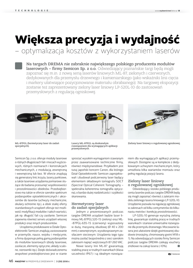 T E C H N O L O G I E www.wydawnictwofaktor.pl Większa precyzja i wydajność – optymalizacja kosztów z wykorzystaniem laserów Na targach DREMA nie zabraknie największego polskiego producenta modułów laserowych – firmy Semicon Sp. z o.o. Odwiedzający poznańskie targi będą mogli zapoznać się m.in. z nową serią laserów liniowych ML-87, zielonych i czerwonych, dedykowanych dla przemysłu drzewnego i kamieniarskiego (jako wskaźniki linii cięcia i markery ułatwiające pozycjonowanie materiału obrabianego). Na targowej ekspozycji zostanie też zaprezentowany zielony laser liniowy LP-520L-10 do zastosowań przemysłowych z regulacją ogniskowej. 46 ML-87PGL (hermetyczny laser do zadań specjalnych). Lasery ML-87PGL są doskonałym rozwiązaniem dla wymagających aplikacji przemysłowych. Zielony laser liniowy o regulowanej ogniskowej. Semicon Sp. z o.o. oferuje moduły laserowe o różnych długościach fali i mocach wyjściowych, różnych rozmiarach i konstrukcjach mechanicznych, z modulacją zewnętrzną i wewnętrzną lub bez. W ofercie znajdują się generatory linii, krzyża, lasery punktowe, a także laserowe urządzenia pomiarowe służące do badania przesunięć współosiowości i prostoliniowości obiektów. Przedsiębiorstwo ma także w ofercie szerokie spektrum podzespołów optoelektronicznych i akcesoriów do laserów (uchwyty mechaniczne, okulary ochronne itp.), a obok stałej oferty standardowych urządzeń oferuje też możliwość modyfikacji modułów i takich wartości, jak np. długość fali czy zasilanie. Semicon zapewnia również serwis urządzeń własnej produkcji oraz innych producentów. Urządzenia produkowane w Dziale Optoelektroniki Semicon znajdują zastosowanie w przemyśle, nauce, wojsku i medycynie, a firma dysponuje pełną gamą podzespołów do modułów laserowych (diody laserowe, zasilacze, elementy optyczne, układy scalone, sterowniki itp.). Dzięki doświadczonemu zespołowi przedsiębiorstwo jest w stanie sprostać wysokim wymaganiom stawianym przez zaawansowane technicznie firmy, również międzynarodowe. Przykładem jest tutaj japoński koncern Canon, dla którego Dział Optoelektroniki Semicon zaprojektował i zbudował podczerwony laser będący elementem składowym tomografu SOCT (Spectral Optical Coherent Tomography – spektralna koherentna tomografia optyczna), o bardzo dużej rozdzielczości i szybkości skanowania. niem dla wymagających aplikacji przemysłowych. Dostępne są w komplecie z dedykowanym uchwytem mechanicznym, który umożliwia kilka wariantów montażu oraz pełną regulację pozycji lasera. MASZYNY W PRZEMYŚLE DRZEWNYM | 3 (39) 2016 r. Hermetyczny laser do zadań specjalnych Jednym z prezentowanych podczas targów DREMA urządzeń będzie laser liniowy ML-87PGL520-15 (zielony) oraz ML-87PGL-635-15 (czerwony) wyposażony w dużą, masywną obudowę (Ø 40 x 200 mm) z wewnętrznym, wysokosprawnym zasilaczem sieciowym. Urządzenia tego typu można zasilać bezpośrednio z sieci szerokim zakresem napięć wejściowych 87-260 VAC. Nowe lasery linii ML-87 gwarantują stabilną pracę w trudnych warunkach (klasa szczelności IP67) i są idealnym rozwiąza- Zielony laser liniowy o regulowanej ogniskowej Odwiedzający stoisko polskiego producenta laserów podczas targów DREMA będą się mogli zapoznać również z zaletami modelu zielonego lasera liniowego LP-520L-10. Urządzenie pozwala na regulację ogniskowej w zakresach od kilku centymetrów do kilkunastu metrów i korekcję prostoliniowości. LP-520L-10 generuje wyraźną zieloną linię, gwarantuje stabilną pracę w trudnych warunkach i stanowi uniwersalne rozwiązanie dla przemysłu drzewnego. Mocowanie lasera jest ułatwione dzięki gwintowanej obudowie (mosiężny, chromowany gwint M18 x 1). Na odwiedzających stoisko firmy Semicon podczas targów DREMA czekają vouchery zniżkowe na zakup lasera (-10%). | Semicon T E C H N O L O G I E www.4woodi.pl Rozmowa z Pawłem Puchalskim, kierownikiem Działu Optoelektroniki firmy Semicon MwPD: Jakie korzyści płyną ze stosowania laserów liniowych? Paweł Puchalski: Przede wszystkim umożliwiają zwiększenie wydajności i szybkości produkcji oraz utrzymanie wysokiej jakości produktów. Pomagają wykonać precyzyjne cięcie i zaplanować obróbkę tak, by zminimalizować ilość odpadów materiałowych. MwPD: Czy stosowanie laserów jest bezpieczne? P.P.: Wszelkie kwestie związane z bezpieczeństwem pracy z laserami reguluje norma PN-EN 60825-1:2014, która dzieli urządzenia laserowe na klasy bezpieczeństwa. Klasy opisujące urządzenia, które są bezpieczne dla użytkownika i nie wymagają stosowania żadnych dodatkowych środków zabezpieczających, na przykład okularów ochronnych, to 1M oraz 2M. Należy jednak pamiętać, że są to profesjonalne urządzenia przemysłowe, a nie zabawki. Wszelkie nieodpowiedzialne zachowania, celowe wpatrywanie się w wiązkę lasera czy kierowanie jej na innych zawsze mogą być niebezpieczne. MwPD: Czy zakup lasera to duży koszt? P.P.: Koszty urządzenia zależne są od wielu czynników, takich jak moc, długość generowanej linii czy miejsce montażu, na przykład na zewnątrz, w doświetlonej hali lub w zakładzie o stałym oświetleniu. Moduły laserowe polskich firm, jak na przykład firmy Semicon, są znacząco tańsze niż podobne urządzenia zagranicznych gigantów, przy zachowaniu takiej samej jakości. Podstawowy laser czerwony z osprzętem rodzimego producenta to koszt około 1000-1100 zł, na który składa się laser dedykowany dla przemysłu drzewnego (850 zł netto), zasilacz (60-80 zł) oraz komplet uchwytów (160 zł). Na najbardziej zaawansowane urządzenie o bardzo dużej mocy optycznej trzeba przeznaczyć znacznie więcej, nawet do kilku tysięcy złotych. Ceny materiałów rosną, tak jak i konkurencja w branży. Zastosowanie laserów pozwala na zwiększenie przewagi konkurencyjnej i dlatego powoli staje się standardem. Klienci coraz