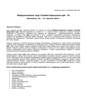 Warszawa, dnia 19. listopada 2009 roku Międzynarodowe Targi Trendów Optycznych opti ´10 Monachium, 15. – 17. stycznia 2010 r. Szanowni Państwo, mam ogromny zaszczyt zaprosić Państwa na kolejną już edycję Międzynarodowych Targów Trendów Optycznych opti ´10, która odbędzie się w dniach 15. – 17. stycznia 2010r., tradycyjne na Nowych Terenach Targowych w Monachium, należących bez wątpienia do największych i najnowocześniejszych ośrodków targowych na świecie. Targi opti są pierwszym w roku i wiodącym wydarzeniem branżowym, skierowanym wyłącznie do specjalistów z dziedziny optyki i okulistyki. Targi te to z pewnością świetna okazja by móc już na początku roku zapoznać się z kierunkiem rozwoju branży, poznać zarówno innowacyjne rozwiązania, technologie jak i nowe designy. Imprezie towarzyszy niezwykle skuteczna strategia marketingowa prowadzona na całym świecie. Konferencje prasowe, ścisła współpraca z dziennikarzami, pojawiające się w wiodących pismach branżowych reklamy targów opti ´10 to tylko niektóre sposoby skupiania uwagi całej branży optycznej na właśnie tych targach. Są one bowiem miejscem spotkań zarówno wiodących producentów z branży jak i firm dopiero zdobywających rynek. Podczas nadchodzącej edycji targów najnowsze rozwiązania i trendy zaprezentowane zostaną w czterech ogromnych halach o łącznej powierzchni 35.000m. Ostatnia edycja targów opti, która odbyła się na początku 2009 roku, zgromadziła 430 wystawców i 19.700 odwiedzających z różnych stron świata. Udział odwiedzających przybyłych na targi z zagranicy wyniósł wówczas 16,2%, natomiast 53,9% wszystkich odwiedzających musiało pokonać odległość do 300 km, by móc wziąć udział w tej monachijskiej imprezie. Warto wiedzieć, że 59,0% wszystkich odwiedzających rezygnuje z udziału w innych międzynarodowych targach o podobnej tematyce na rzecz uczestnictwa w targach opti. Przekonuje również niezwykle pozytywna ocena targów: aż 93,3% wszystkich odwiedzających jest w pełni zadowolonych z oferty prezentowanej na targach opti. Oferta nadchodzącej edycji targów obejmowała będzie m.in. następujące zagadnienia: • • • • • • • • • • • • etui i inne akcesoria laser w okulistyce literatura branżowa mikroskopy, lornetki, teleskopy i szkła powiększające narzędzia optometryczne i okulistyczne noktowizory okulary dla dzieci okulary przeciwsłoneczne okulary ochronne okulary sportowe opaski i łańcuszki do okularów reklama i marketing • • • • • • soczewki okularowe i kontaktowe sprzęt okulistyczny statywy środki pielęgnacyjne technika szlifierska wyposażenie zakładów optycznych Organizatorzy targów opti ´10 przeznaczyli całą halę wyłącznie dla producentów tzw. „private labels”. Miejscem dla wyjątkowych designerów i ich odważnych, zupełnie nowych pomysłów będzie hala Yes! Young Eye Styles. Zupełną nowością na nadchodzących targach opti będzie strefa „Walk of Frame” w hali C1. To tutaj zaprezentują się wystawcy, których modele wyróżniają się szeroko rozumianą innowacyjnością. Tradycyjnie targom opti ´10 towarzyszył będzie niezwykle atrakcyjny program ramowy. Gorąco zachęcam Państwa do uczestnictwa w ciekawych forach dyskusyjnych, wykładach i prezentacjach na żywo. Ich szczegółowy program znajdziecie Państwo w późniejszym terminie na stronie www.opti-munich.com w zakładce About the trade show pod Fringe programme. Warto skorzystać z wiedzy znanych na całym świecie specjalistów z branży optycznej. Podsumujmy. Targi opti ’10 to: • • • • • • • • • • pierwsze tak ważne wydarzenie branżowe w roku 2010 forum dla całej branży optycznej: szkła, oprawki, soczewki, przyrządy optyczne, wzory i wyposażenie sklepów Walk of Frame: parada nowości „YES! Young Eye Styles”: piekielnie dobre pomysły w zakresie „private labels” forum opti kampus opti spotkanie absolwentów kierunków optycznych OPTIMIERT – wzorcowy sklep optyczny wybór „trendu” roku 2010 najgorętsze miejsce spotkań branży Targi opti ´10 są wydarzeniem na którym po prostu nie może Państwa zabraknąć! Proszę skorzystać z zaproszenia Biura Targów Monachijskich w Polsce i dołączyć do grona zadowolonych odwiedzających. Więcej informacji na temat targów opti´10 znajdą Państwo na stronie: www.opti-munich.com. Proszę również pamiętać, że targi opti odbywają się w Monachium, przepięknej stolicy Bawarii, w „metropolii z sercem.” To miasto ma wszystko, co jest potrzebne do zaspokojenia nawet najbardziej wybrednych turystów. Warto zobaczyć piękną starówkę, liczne muzea, parki i ogrody, zamki i pałace. Monachium to miasto kontrastów. Z jednej strony żyje ono bawarską tradycją, zaś z drugiej jest niezwykle nowoczesną metropolią, ośrodkiem niemieckiej high tech, z siedzibami wielu międzynarodowych koncernów. Na naszej stronie internetowej www.targiwmonachium.pl w zakładce Planowanie podróży a następnie Biura podróży znajdą Państwo adresy współpracujących z nami biur, które kompleksowo zajmą się organizacją Państwa pobytu na targach. DO ZOBACZENIA W MONACHIUM! Z poważaniem Magdalena Mencel Biuro Targów Monachijskich w Polsce Międzynarodowe Targi Trendów Optycznych opti ´10 Bilety wstępu na targi opti ´10 można zakupić na miejscu w Monachium lub w przedsprzedaży poprzez zarejestrowanie się i złożenie zamówienia na stronie www.opti-munich.com. Warto wiedzieć, że rejestrując się wcześniej on-line zaoszczędzą Państwo czas i pieniądze oraz unikną kolejek do rejestracji w czasie trwania targów. Ceny biletów wstępu na targi opti ´10 Rodzaj biletu Cena w przedsprzedaży Cena w kasie Bilet 1-dniowy 14,00 € 17,00 € Bilet na całe targi 25,00 € 28,00 € 6,00 € 9,00 € Studenci Katalog Katalog w cenie biletu Tak wygląda procedura zamawiania i odbioru biletów: 
