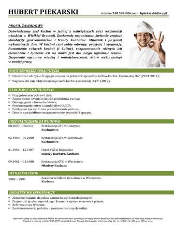HUBERT PIEKARSKI telefon: 510 504 006, mail: [email protected] PROFIL ZAWODOWY Doświadczony szef kuchni w jednej z największych sieci restauracji włoskich w Wielkiej Brytanii. Doskonały organizator świetnie znający standardy gastronomiczne i trendy kulinarne. Miłośnik i pasjonat wykwintnych dań. W kuchni ceni sobie odwagę, prostotę i elegancję. Rozumienie różnych kuchni (i kultur), rozpoznawanie różnych ich elementów i łączenie ich na nowo jest dla niego ogromnie ważne. Dysponuje ogromną wiedzą i umiejętnościami, które wykorzystuje w swojej pracy. NAJWAŻNIEJSZE OSIĄGNIĘCIA Dwukrotne zdobycie drugiego miejsca na pokazach specjałów szefów kuchni „Cucina Angelo” (2013, 2014); Nagroda dla najefektywniejszego szefa kuchni restauracji „XYZ” (2012). KLUCZOWE KOMPETENCJE Przygotowanie potraw i dań; Zapewnienie wysokiej jakości produktów i usług; Obsługa gości – forma bufetowa; Przestrzeganie norm i standardów HACCP; Estetyczne i prawidłowe prezentowanie potraw; Dbanie o prawidłowe magazynowanie żywności i sprzętu. DOŚWIADCZENIE ZAWODOWE 08.2000 – obecnie Restauracja ZYF w Londynie Kuchmistrz 02.1988 – 08.2000 Restauracja XYZ w Warszawie Kuchmistrz 01.1986 – 12.1987 Hotel XYZ w Szczecinie Starszy Kucharz, Kucharz 09.1981 – 01.1988 Restauracja GYC w Warszawie Młodszy Kucharz WYKSZTAŁCENIE 1980 – 1984 Zasadnicza Szkoła Zawodowa w Warszawie Kucharz DODATKOWE INFORMACJE Aktualne badania do celów sanitarno-epidemiologicznych; Znajomość języka angielskiego: komunikatywna w mowie i piśmie; Referencje: na życzenie; Zainteresowania: podróże – poznawanie innych kultur. Wyrażam zgodę na przetwarzanie moich danych osobowych zawartych w mojej ofercie pracy dla potrzeb niezbędnych do realizacji procesu rekrutacji (zgodnie z Ustawą z dnia 29.08.1997 roku o Ochronie Danych Osobowych; tekst jednolity: Dz. U. z 2002r. Nr 101, poz. 926 ze zm.).