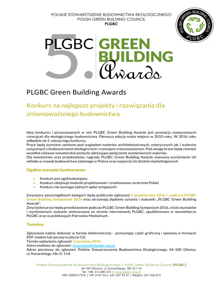 POLSKIE STOWARZYSZENIE BUDOWNICTWA EKOLOGICZNEGO POLISH GREEN BUILDING COUNCIL PLGBC PLGBC Green Building Awards Konkurs na najlepsze projekty i rozwiązania dla zrównoważonego budownictwa Ideą konkursu i przyznawanych w nim PLGBC Green Building Awards jest promocja nowoczesnych rozwiązań dla ekologicznego budownictwa. Pierwsza edycja miała miejsce w 2010 roku. W 2016 roku odbędzie się 5. edycja tego konkursu. Prace będą oceniane zarówno pod względem walorów architektonicznych, estetycznych jak i walorów związanych z budownictwem ekologicznym i rozwojem zrównoważonym. Pod uwagę brane będą również wszelkie ciekawe nowatorskie pomysły adresujące połączenie wymienionych walorów. Dla inwestorów oraz projektantów, nagrody PLGBC Green Building Awards stanowią wyróżnienie ich wkładu w rozwój budownictwa zielonego w Polsce oraz wsparcie ich działań marketingowych. Ogólne warunki konkursowe Konkurs jest ogólnodostępny Konkurs obejmuje budynki projektowane i zrealizowane na terenie Polski Konkurs nie wymaga żadnych opłat wstępnych! Zwycięzcy poszczególnych kategorii będą publicznie ogłoszeni 5 października 2016 r. podczas PLGBC Green Building Symposium 2016 oraz otrzymają dyplomy uznania i statuetki „PLGBC Green Building Awards”. Zwycięskie prace będą przedstawione podczas PLGBC Green Building Symposium 2016, a lista laureatów i wyróżnionych zostanie umieszczona na stronie internetowej PLGBC, opublikowana w newsletterze PLGBC oraz w publikacjach Patronów Medialnych. Terminy Zgłoszenia należy dokonać w formie elektronicznej – przesyłając część graficzną i opisową w formacie PDF mailem lub pocztą na płycie CD. Termin nadsyłania zgłoszeń: 2 września 2016. Adres mailowy do zgłoszeń: [email protected] Adres pocztowy do zgłoszeń: Polskie Stowarzyszenie Budownictwa Ekologicznego, 44-100 Gliwice, ul. Konarskiego 18c/2-11A. Polskie Stowarzyszenie Budownictwa Ekologicznego | Polish Green Building Council (PLGBC) 44-100 Gliwice, ul. Konarskiego 18C/2-11A Tel. +48. 515.280.575 | www.plgbc.org.pl KRS: 0000317576 | NIP (VAT No.): 631 257 96 51 | Regon: 241 056 815 POLSKIE STOWARZYSZENIE BUDOWNICTWA EKOLOGICZNEGO POLISH GREEN BUILDING COUNCIL PLGBC Na podstawie nadesłanych prac Jury wyłoni nagrodzone zgłoszenia, które należy uzupełnić o plansze na sztywnym podkładzie piankowym, format 70×100 cm (układ dowolny), w celu wystawienia ich podczas Sympozjum 2016. Wymagania konkursowe Kategoria 1: Najlepszy zrealizowany budynek certyfikowany W tej kategorii mogą startować zrealizowane w ostatnich 2 latach obiekty, które posiadają certyfikat BREEAM bądź LEED. Wymagania: minimalnie jeden rzut założenia oraz wizualizacja lub zdjęcie ilustrujące koncept – forma graficzna dowolna przedstawienie tzw. Green Checklist lub Scorecard opis projektu wg formularza dostępnego TUTAJ (ze szczególnym podkreśleniem aspektów związanych z rozwojem zrównoważonym – dotyczących usytuowania, zagospodarowania terenu, oszczędności wody oraz energii, jakości powietrza wewnątrz obiektu, zdrowych materiałów, niskiego nakładu energii pierwotnej, minimalizacji użycia surowców pierwotnych, LCA, projektowania zintegrowanego, etc.) Kategoria 2: Najlepszy zrealizowany budynek ekologiczny bez certyfikatu (bądź precertyfikowany) W tej kategorii mogą startować obiekty ubiegające się dopiero o certyfikat, precertyfikowane (BREEAM, DGNB, HQE i LEED) bądź też budynki, które nie będą certyfikowane, lecz posiadają szczególne wartości wyróżniające je pod względem zarówno architektonicznym, jak i zrównoważonego rozwoju. Wymagania: minimalnie jeden rzut oraz wizualizacja lub zdjęcie ilustrujące koncept – forma graficzna dowolna opis projektu wg formularza dostępnego TUTAJ (ze szczególnym podkreśleniem aspektów związanych z rozwojem zrównoważonym – dotyczących usytuowania, zagospodarowania terenu, oszczędności wody oraz energii, jakości powietrza wewnątrz obiektu, zdrowych materiałów, niskiego nakładu energii pierwotnej, minimalizacji użycia surowców pierwotnych, LCA, projektowania zintegrowanego, etc.) przedstawienie tzw. Green Checklist lub Scorecard będzie dodatkowym atutem Kategoria 3: Najlepszy projekt ekologiczny Do tej kategorii mogą być zgłaszane niezrealizowane jeszcze projekty obiektów ekologicznych (lub projekty ideowe, nieprzewidziane do realizacji), wykonane na przestrzeni ostatnich 2 lat. W tej kategorii mogą startować profesjonaliści oraz studenci (oceniani osobno). Wymagania: minimalnie jeden rzut oraz wizualizacja lub zdjęcie ilustrujące koncept – forma graficzna dowolna opis projektu wg formularza dostępnego TUTAJ (należy załączyć również krótką informację o zastosowanych rozwiązaniach proekologicznych oraz ewentualnie inne informacje, które pomogą ocenić wartość proekologiczną obiektu) Polskie Stowarzyszenie Budownictwa Ekologicznego | Polish Green Building Council (PLGBC) 44-100 Gliwice, ul. Konarskiego 18C/2-11A Tel. +48. 515.280.575 | www.plgbc.org.pl KRS: 0000317576 | NIP (VAT No.): 631 257 96 51 | Regon: 241 056 815 POLSKIE STOWARZYSZENIE BUDOWNICTWA EKOLOGICZNEGO POLISH GREEN BUILDING COUNCIL PLGBC Kategoria 4: Najlepszy ekologiczny budynek użyteczności publicznej W tej kategorii mogą startować obiekty użyteczności publicznej certyfikowane, ubiegające się o certyfikat, precertyfikowane, bądź też budynki, które nie będą certyfikowane, lecz posiadają szczególne wartości wyróżniające je pod względem zarówno architektonicznym, jak i zrównoważonego rozwoju. Wymagania: minimalnie jeden rzut oraz wizualizacja lub zdjęcie ilustrujące koncept – forma graficzna dowolna opis projektu wg formularza dostępnego TUTAJ (ze szczególnym podkreśleniem aspektów związanych z rozwojem zrównoważonym – dotyczących usytuowania, zagospodarowania terenu, oszczędności wody oraz energii, jakości powietrza wewnątrz obiektu, zdrowych ma