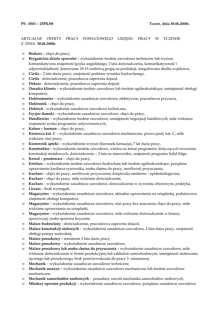 25PK/08 Tczew, dnia 30.06.2008r. AKTUALNE OFERTY PRACY