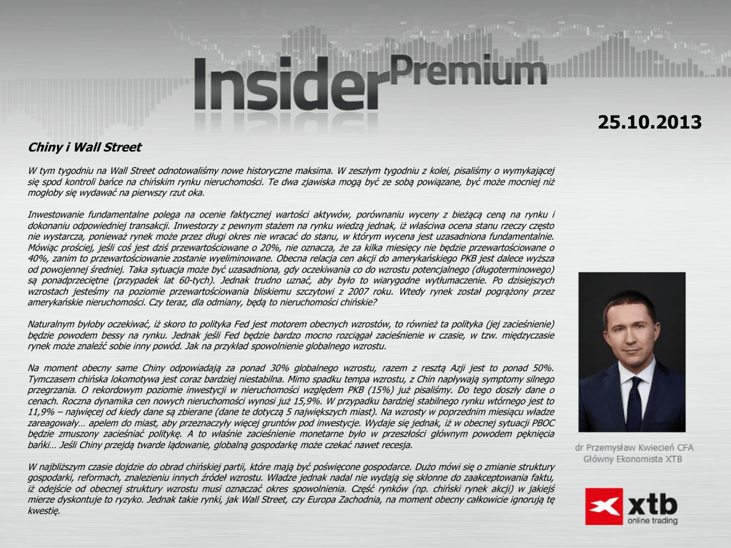 25.10.2013 Chiny i Wall Street W tym tygodniu na Wall Street odnotowaliśmy nowe historyczne maksima. W zeszłym tygodniu z kolei, pisaliśmy o wymykającej się spod kontroli bańce na chińskim rynku nieruchomości. Te dwa zjawiska mogą być ze sobą powiązane, być może mocniej niż mogłoby się wydawać na pierwszy rzut oka. Inwestowanie fundamentalne polega na ocenie faktycznej wartości aktywów, porównaniu wyceny z bieżącą ceną na rynku i dokonaniu odpowiedniej transakcji. Inwestorzy z pewnym stażem na rynku wiedzą jednak, iż właściwa ocena stanu rzeczy często nie wystarcza, ponieważ rynek może przez długi okres nie wracać do stanu, w którym wycena jest uzasadniona fundamentalnie. Mówiąc prościej, jeśli coś jest dziś przewartościowane o 20%, nie oznacza, że za kilka miesięcy nie będzie przewartościowane o 40%, zanim to przewartościowanie zostanie wyeliminowane. Obecna relacja cen akcji do amerykańskiego PKB jest dalece wyższa od powojennej średniej. Taka sytuacja może być uzasadniona, gdy oczekiwania co do wzrostu potencjalnego (długoterminowego) są ponadprzeciętne (przypadek lat 60-tych). Jednak trudno uznać, aby było to wiarygodne wytłumaczenie. Po dzisiejszych wzrostach jesteśmy na poziomie przewartościowania bliskiemu szczytowi z 2007 roku. Wtedy rynek został pogrążony przez amerykańskie nieruchomości. Czy teraz, dla odmiany, będą to nieruchomości chińskie? Naturalnym byłoby oczekiwać, iż skoro to polityka Fed jest motorem obecnych wzrostów, to również ta polityka (jej zacieśnienie) będzie powodem bessy na rynku. Jednak jeśli Fed będzie bardzo mocno rozciągał zacieśnienie w czasie, w tzw. międzyczasie rynek może znaleźć sobie inny powód. Jak na przykład spowolnienie globalnego wzrostu. Na moment obecny same Chiny odpowiadają za ponad 30% globalnego wzrostu, razem z resztą Azji jest to ponad 50%. Tymczasem chińska lokomotywa jest coraz bardziej niestabilna. Mimo spadku tempa wzrostu, z Chin napływają symptomy silnego przegrzania. O rekordowym poziomie inwestycji w nieruchomości względem PKB (15%) już pisaliśmy. Do tego doszły dane o cenach. Roczna dynamika cen nowych nieruchomości wynosi już 15,9%. W przypadku bardziej stabilnego rynku wtórnego jest to 11,9% – najwięcej od kiedy dane są zbierane (dane te dotyczą 5 największych miast). Na wzrosty w poprzednim miesiącu władze zareagowały… apelem do miast, aby przeznaczyły więcej gruntów pod inwestycje. Wydaje się jednak, iż w obecnej sytuacji PBOC będzie zmuszony zacieśniać politykę. A to właśnie zacieśnienie monetarne było w przeszłości głównym powodem pęknięcia bańki… Jeśli Chiny przejdą twarde lądowanie, globalną gospodarkę może czekać nawet recesja. W najbliższym czasie dojdzie do obrad chińskiej partii, które mają być poświęcone gospodarce. Dużo mówi się o zmianie struktury gospodarki, reformach, znalezieniu innych źródeł wzrostu. Władze jednak nadal nie wydają się skłonne do zaakceptowania faktu, iż odejście od obecnej struktury wzrostu musi oznaczać okres spowolnienia. Część rynków (np. chiński rynek akcji) w jakiejś mierze dyskontuje to ryzyko. Jednak takie rynki, jak Wall Street, czy Europa Zachodnia, na moment obecny całkowicie ignorują tę kwestię. Wydarzenia tygodnia minionego: Plan raportu • Słabe dane z amerykańskiego rynku pracy, ale nie do końca – zatrudnienie we wrześniu wzrosło tylko o 148 tys., lecz stopa bezrobocia spadła do 7,2% a sierpniowy odczyt zatrudnienia zrewidowano do góry o 24 tys. 1) Temat tygodnia: • Payrolls nie pomogły dolarowi str.3 • Słabe indeksy PMI z Europy, lepsze z Chin – dane ze strefy euro pokazały, że ożywienie pozostaje powolne; indeks PMI z Chin zaskoczył „in-plus”, lecz rynki przeszły obok niego obojętnie str.4 (S&P500 str.5 • Obawa o Chiny – ponownie rosnące stopy na rynku międzybankowym w Państwie Środka oraz plotki o kolejnych restrykcjach wobec rynku nieruchomości spychają mocno chińskie indeksy w dół 2) Rynek akcji: • • Czy Nikkei powróci do wzrostów? W.20 (WIG20 Futures), US.500 Futures) 3) Rynek walutowy: • EURUSD • EURPLN, USDPLN • EURGBP, USDCAD str.6 str.7 str. 8 • Dane z Wysp – minutes BoE i dane o PKB w III kwartale nie przyniosły żadnych zaskoczeń, funt pozostaje cały czas dość mocny • Wyniki spółek – słabe raporty McDonald’s i Caterpillar, niezłe wyniki Boeinga, Microsoftu i DuPont nadchodzącego: 4) Rynek surowców: • • Kukurydza – atrakcyjne ceny dla kupujących str.9 Kukurydza, pszenica str. 10 • Posiedzenie FED – w środę o godz. 19:00 poznamy komunikat po posiedzeniu członków FOMC; tym razem bez konferencji prezesa; za to dwa dni po posiedzeniu głos zabierze opiniotwórczy James Bullard • Dane z USA – z ważniejszych danych poznamy m.in. Raport ADP, dane o produkcji przemysłowej, sprzedaży detalicznej i inflacji oraz indeksy Chicago PMI i ISM dla przemysłu • Indeksy PMI – w piątek poznamy finalne odczyty indeksów PMI dla Chin, Wielkiej Brytanii i USA • Wyniki spółek – raporty opublikować mają m.in. Apple, BP, Pfizer, GE, Kraft Foods, Exxon Mobil, Shell oraz Chevron Temat tygodnia: payrolls nie pomogły dolarowi Tydzień temu, analizując trendy na rynku EURUSD, wskazywaliśmy na wyprzedanego dolara, podkreślając, że jakkolwiek okoliczności dla zmiany trendu są sprzyjające, to potrzebny jest impuls do kupowania dolara, najlepiej w postaci dobrych danych z USA. W ostatnim czasie takiego impulsu brakowało i niejednoznaczne dane z rynku pracy go nie zapewniły. Jak pokazują przedstawione porównania z rynkiem stopy procentowej hossa na EURUSD jest ewidentnie pozbawiona fundamentów. Na rocznym porównaniu widzimy zerwanie zależności już w czerwcu, kiedy dolar nie umocnił się dostatecznie po konferencji szefa Fed. Różnica pomiędzy rynkami zaczęła rosnąć w ostatnim czasie. Szczególnie dając