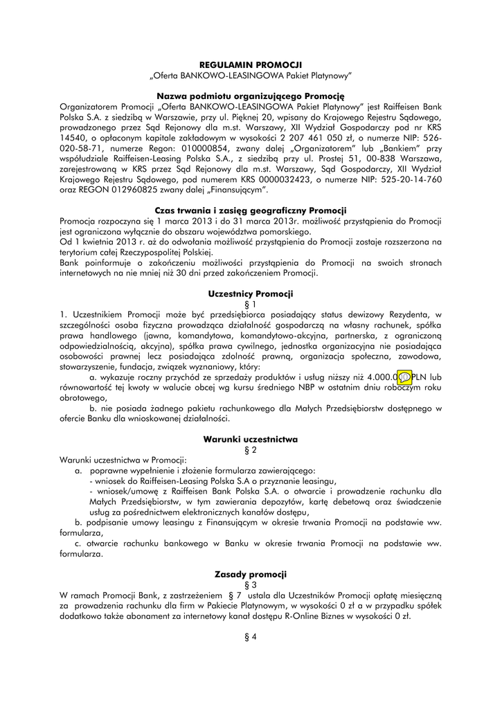 REGULAMIN PROMOCJI „Oferta BANKOWO-LEASINGOWA Pakiet Platynowy” Nazwa podmiotu organizującego Promocję Organizatorem Promocji „Oferta BANKOWO-LEASINGOWA Pakiet Platynowy” jest Raiffeisen Bank Polska S.A. z siedzibą w Warszawie, przy ul. Pięknej 20, wpisany do Krajowego Rejestru Sądowego, prowadzonego przez Sąd Rejonowy dla m.st. Warszawy, XII Wydział Gospodarczy pod nr KRS 14540, o opłaconym kapitale zakładowym w wysokości 2 207 461 050 zł, o numerze NIP: 526020-58-71, numerze Regon: 010000854, zwany dalej „Organizatorem” lub „Bankiem” przy współudziale Raiffeisen-Leasing Polska S.A., z siedzibą przy ul. Prostej 51, 00-838 Warszawa, zarejestrowaną w KRS przez Sąd Rejonowy dla m.st. Warszawy, Sąd Gospodarczy, XII Wydział Krajowego Rejestru Sądowego, pod numerem KRS 0000032423, o numerze NIP: 525-20-14-760 oraz REGON 012960825 zwany dalej „Finansującym”. Czas trwania i zasięg geograficzny Promocji Promocja rozpoczyna się 1 marca 2013 i do 31 marca 2013r. możliwość przystąpienia do Promocji jest ograniczona wyłącznie do obszaru województwa pomorskiego. Od 1 kwietnia 2013 r. aż do odwołania możliwość przystąpienia do Promocji zostaje rozszerzona na terytorium całej Rzeczypospolitej Polskiej. Bank poinformuje o zakończeniu możliwości przystąpienia do Promocji na swoich stronach internetowych na nie mniej niż 30 dni przed zakończeniem Promocji. Uczestnicy Promocji §1 1. Uczestnikiem Promocji może być przedsiębiorca posiadający status dewizowy Rezydenta, w szczególności osoba fizyczna prowadząca działalność gospodarczą na własny rachunek, spółka prawa handlowego (jawna, komandytowa, komandytowo-akcyjna, partnerska, z ograniczoną odpowiedzialnością, akcyjna), spółka prawa cywilnego, jednostka organizacyjna nie posiadająca osobowości prawnej lecz posiadająca zdolność prawną, organizacja społeczna, zawodowa, stowarzyszenie, fundacja, związek wyznaniowy, który: a. wykazuje roczny przychód ze sprzedaży produktów i usług niższy niż 4.000.000 PLN lub równowartość tej kwoty w walucie obcej wg kursu średniego NBP w ostatnim dniu roboczym roku obrotowego, b. nie posiada żadnego pakietu rachunkowego dla Małych Przedsiębiorstw dostępnego w ofercie Banku dla wnioskowanej działalności. Warunki uczestnictwa §2 Warunki uczestnictwa w Promocji: a. poprawne wypełnienie i złożenie formularza zawierającego: - wniosek do Raiffeisen-Leasing Polska S.A o przyznanie leasingu, - wniosek/umowę z Raiffeisen Bank Polska S.A. o otwarcie i prowadzenie rachunku dla Małych Przedsiębiorstw, w tym zawierania depozytów, kartę debetową oraz świadczenie usług za pośrednictwem elektronicznych kanałów dostępu, b. podpisanie umowy leasingu z Finansującym w okresie trwania Promocji na podstawie ww. formularza, c. otwarcie rachunku bankowego w Banku w okresie trwania Promocji na podstawie ww. formularza. Zasady promocji §3 W ramach Promocji Bank, z zastrzeżeniem § 7 ustala dla Uczestników Promocji opłatę miesięczną za prowadzenia rachunku dla firm w Pakiecie Platynowym, w wysokości 0 zł a w przypadku spółek dodatkowo także abonament za internetowy kanał dostępu R-Online Biznes w wysokości 0 zł. §4 W ramach Promocji Finansujący zobowiązuje się do utrzymania oprocentowania raty leasingowej określonej w umowie leasingowej. promocyjnej wysokości §5 Uczestnik Promocji zobowiązuje się w trakcie trwania umowy leasingu do posiadania w Banku rachunku bankowego dla Małych Przedsiębiorstw w Pakiecie Platynowym. §6 W przypadku nie spełnienia przez Uczestnika Promocji warunków wymienionych w § 5 Promocja wygasa, a Finansujący ma prawo do podwyższenia oprocentowania umowy leasingu do wartości nominalnej wymienionej w umowie leasingu. §7 Warunki promocyjne obowiązują przez okres trwania wnioskowanej umowy leasingu. Po zakończeniu trwania umowy leasingu Uczestnik Promocji zachowuje prawo do utrzymania promocyjnych warunków dotyczących oferowanych produktów bankowych w przypadku posiadania innej umowy leasingu z Finansującym. W przypadku braku innej umowy leasingu lub nie zawarcia innej umowy leasingu w okrsie 30 dni kalendarzowych od wygaśnięcia umowy zawartej na zasadach promocyjnych (z Finansującym) Promocja wygasa, a Bank ma prawo do naliczenia opłat zgodnych z Tabelą Opłat Oprocentowania i Prowizji w miesiącu następującym po miesiącu, w którym nie spełniono warunków Promocji. Reklamacje §8 Wszelkie reklamacje dotyczące produktów bankowych związanych z niniejszą Promocją mogą być składane przez Uczestników Promocji w formie pisemnej na adres: Raiffeisen Bank Polska S.A., Zespół Obsługi Reklamacji, Al. Jerozolimskie 179, 02-222 Warszawa. Wszelkie reklamacje dotyczące produktów leasingowych związanych z niniejszą Promocją mogą być składane przez Uczestników Promocji w formie pisemnej na adres: Raiffeisen-Leasing Polska S.A., ul. Prosta 51, 00-838 Warszawa §9 Reklamacja powinna zawierać pełną nazwę firmy Uczestnika Promocji, imię i nazwisko osoby zgłaszającej reklamację/reprezentującej Uczestnika Promocji, ID Klienta, numer rachunku, którego dotyczy reklamacja oraz adres do korespondencji. § 10 Bank w formie pisemnej odpowie na reklamację nie później niż w ciągu 14 dni roboczych od daty wpływu reklamacji do Banku. § 11 Roszczenia z tytułu udziału w promocji mogą być zgłaszane w ciągu 30 dni od dnia zakończenia promocji. Postanowienia końcowe § 12 Treść niniejszego Regulaminu znajduje się w: 1. siedzibie Organizatora - Raiffeisen Bank Polska S.A., Warszawa, ul. Piękna 20 2. siedzibie Finansującego – Raiffeisen-Leasing Polska S.A., Warszawa, ul. Prosta 51 3. siedzibach jednostek współpracujących z Organizatorem i Finansującym. § 13 Niniejszy Regulamin jest jedynym dokumentem określającym szczegółowe zasady Promocji. W sprawach nieuregulowanych niniejszym Regulaminem mają zastosowanie: Regulamin Rachunków Bie