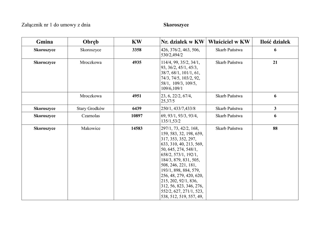 Załącznik nr 1 do umowy z dnia Skoroszyce Gmina Obręb KW Nr. działek w KW Właściciel w KW Ilość działek Skoroszyce Skoroszyce 3358 426, 376/2, 463, 506, 530/2,494/2 Skarb Państwa 6 Skoroczyce Mroczkowa 4935 114/4, 99, 35/2, 34/1, 93, 36/2, 45/1, 45/3, 38/7, 68/1, 101/1, 61, 74/3, 74/5, 103/2, 92, 58/1, 109/3, 109/5, 109/6,109/1 Skarb Państwa 21 Mroczkowa 4951 23, 6, 22/2, 67/4, 25,37/5 Skarb Państwa 6 Skoroszyce Stary Grodków 6439 250/1, 433/7,433/8 Skarb Państwa 3 Skoroszyce Czarnolas 10897 69, 93/1, 93/3, 93/4, 135/1,53/2 Skarb Państwa 6 Skoroszyce Makowice 14583 297/1, 73, 42/2, 168, 159, 583, 32, 198, 659, 317, 353, 352, 297, 633, 310, 40, 213, 569, 50, 645, 274, 548/1, 658/2, 573/1, 192/1, 184/3, 879, 831, 505, 508, 246, 221, 181, 193/1, 898, 884, 579, 256, 48, 279, 420, 620, 215, 202, 92/1, 836, 312, 56, 823, 346, 276, 552/2, 627, 271/1, 523, 538, 512, 519, 557, 49, Skarb Państwa 88 153, 353, 525, 662, 28, 75, 183, 349, 524, 68, 67, 124, 142, 637, 201, 620, 184/1, 190, 654, 147, 221, 222/1, 288/2, 224/1, 403/3 396/3 420/1,305/1 Skoroszyce Chróścina 16973 554/2, 625, 177/5,611/2 Skarb Państwa 4 Chróścina 16983 108/1, 108/2, 601/2, 608/1, 103/3, 103/5, 257, 264, 265, 524/1, 524/2, 470/2, 470/4,612/2 Skarb Państwa 15 Skoroszyce Sidzina 21121 451, 632, 640, 667, 649, 338/5,338/6 Skarb Państwa 7 Skoroszyce Mroczkowa 33392 37/1,32/5 Skarb Państwa 2 Skoroszyce Mroczkowa 35110 84/3, 84/4,84/7 Józef Winnik w 1/3 części, Waleria Winnik w 1/3 części, Antoni Sobel, syn Franciszka i Julii oraz żona Maria Sobel córka Antoniego i Katarzyny w majątkowej wspólności ustawowej w 1/3 części 3 SUMA 161 Nysa,2010-07-06 Maria Sobczyk