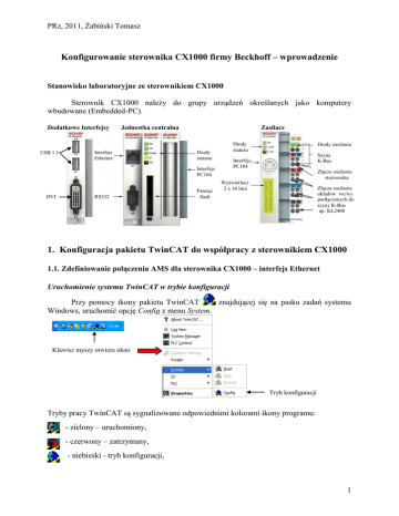 PRz, 2011, Żabiński Tomasz Konfigurowanie sterownika CX1000 firmy Beckhoff – wprowadzenie Stanowisko laboratoryjne ze sterownikiem CX1000 Sterownik CX1000 należy do grupy urządzeń określanych jako komputery wbudowane (Embedded-PC). Dodatkowe Interfejsy USB 1.1 Jednostka centralna Interfejs Ethernet Zasilacz Diody statusu Diody statusu DVI RS232 Szyna K-Bus Interfejs PC104 Interfejs PC104 Pamięć flash Diody zasilania Złącze zasilania sterownika Wyświetlacz 2 x 16 linii Złącza zasilania układów we/wy podłączonych do szyny K-Bus np. KL2408 1. Konfiguracja pakietu TwinCAT do współpracy z sterownikiem CX1000 1.1. Zdefiniowanie połączenia AMS dla sterownika CX1000 – interfejs Ethernet Uruchomienie systemu TwinCAT w trybie konfiguracji Przy pomocy ikony pakietu TwinCAT znajdującej się na pasku zadań systemu Windows, uruchomić opcję Config z menu System. Klawisz myszy otwiera okno Tryb konfiguracji Tryby pracy TwinCAT są sygnalizowane odpowiednimi kolorami ikony programu: - zielony – uruchomiony, - czerwony – zatrzymany, - niebieski - tryb konfiguracji, 1 PRz, 2011, Żabiński Tomasz - żółty - w trakcie uruchamiania. Konfiguracja połączenia sieciowego Komunikacja ze sterownikiem za pośrednictwem interfejsu Ethernet wymaga odpowiedniej konfiguracji sieci. Protokoły sieciowe sterownika oraz komputera PC z pakietem TwinCAT muszą być tak skonfigurowane, aby urządzenia znajdowały się w tej samej sieci (odpowiedni adres IP i maska podsieci – aby zweryfikować poprawność konfiguracji można wykorzystać instrukcję ping). Jeżeli sterownik odpowiada na rozkaz ping, należy przejść do punktu Konfiguracja połączenia w pakiecie TwinCAT chyba, że prowadzący zadecyduje inaczej. Domyślna nazwa sterownika, odczytywana po ustanowieniu połączenia, składa się z napisu CX_ oraz ostatnich trzech bajtów MAC-ID umieszczonego na sterowniku (np. CX_013DC8). Konfiguracja połączenia w pakiecie TwinCAT Przy pomocy ikony znajdującej się na pasku zadań Windows, uruchomić pakiet System Manager a następnie należy wybrać opcję New z menu File. Klawisz myszy otwiera okno W celu zdefiniowania połączenia, w oknie General dla SYSTEM-Configuration wybrać opcję Choose Target.... Następnie uruchomić procedurę automatycznego wyszukiwania sterowników znajdujących się w sieci Ethernet – przycisk Search (Ethernet).... W oknie Add Route Dialog określić typ warstwy transportowej (Transport Type) jako TCP/IP a następnie uruchomić opcję wyszukiwania rozgłoszeniowego – przycisk Broadcast Search. Jeżeli sterownik zostanie odnaleziony, w oknie Add Route Dialog pojawi się odpowiedni wpis zawierający nazwę urządzenia (Host Name) oraz informacje o adresach IP, AMS oraz wersji urządzenia. 2 PRz, 2011, Żabiński Tomasz Brak symbolu X w polu Connected oznacza, że nie odbyło się logowanie do sterownika. W polu Router Name (Target) można dokonać zmiany nazwy sterownika (np. CX_SalaD9), która będzie w przyszłości identyfikowała skonfigurowane połączenie. W kolejnym kroku należy określić Address Info jako IP Address oraz nacisnąć przycisk Add Route. W efekcie pojawi się okno logowania, w którym należy nacisnąć przycisk OK dla użytkownika Administrator bez hasła. Gdy logowanie się powiedzie, w polu Connected pojawi się symbol X. W kolejnym kroku należy zamknąć okno Add Route Dialog przy pomocy przycisku Close oraz wybrać zdefiniowane połączenie dla aktualnego projektu. W tym celu należy zaznaczyć, przy pomocy myszki, nazwę zdefiniowanego połączenia i wybór zatwierdzić przyciskiem OK. 3 PRz, 2011, Żabiński Tomasz Jeżeli odpowiednie urządzenie nie zostanie wykryte, należy sprawdzić czy sterownik jest dostępny w sieci np. instrukcją ping i odpowiednio skonfigurować komputer PC (adresy IP, maska sieci). W przypadku, gdy komunikacja ze sterownikiem powiodła się, w systemie TwinCAT dodany zostanie obiekt AMS Router identyfikujący zdefiniowane połączenie. Informacje o aktualnie istniejących AMS Router, można uzyskać wykorzystując ikonę TwinCAT znajdującą się na pasku zadań Windows i uruchamiając okno TwinCAT System Properties. Klawisz myszy otwiera okno Wybór opcji Properties Dodany AMS Router W oknie Remote Computers powinien znajdować się opis wpisany uprzednio jako nazwa sterownika. Tak skonfigurowane połączenie może być wykorzystywane w przyszłości bez konieczności ponownego definiowania struktury komunikacyjnej. Po wykonaniu powyższych operacji system TwinCAT jest gotowy do współpracy ze sterownikiem CX1000. Aktualny tryb pracy systemu jest sygnalizowany w pasku statusu okna TwinCAT System Manager, jak pokazano na poniższych rysunkach. W celu wyszukania urządzeń we/wy podłączonych do szyby K-bus system powinien znajdować się w trybie konfiguracji. 4 PRz, 2011, Żabiński Tomasz Nazwa połączenia Stan połączenia (Timeout – kolor żółty – przerwa w komunikacji) Stan połączenia (RTime – kolor zielony – połączenie aktywne) Stan połączenia (Config Mode – kolor niebieski – tryb konfiguracji) Wykrywanie urządzeń połączonych z sterownikiem (tutaj dotyczy szyny K-Bus) Automatyczne wykrywanie urządzeń możliwe jest w trybie konfiguracji, jeżeli System Manager jest w innym trybie należy dokonać przełączenia. Przełączenie w tryb konfiguracji W celu wykrycia urządzeń wejścia/wyjścia, należy uruchomić (prawy klawisz myszy) funkcję Scan Devices... dla I/O-Devices znajdującego się w gałęzi I/O-Configuration. 5 PRz, 2011, Żabiński Tomasz Podstawowe urządzenia, które powinny zostać wykryte, dla badanego stanowiska laboratoryjnego, pokazano na poniższym rysunku. Aby wprowadzić wykryte urządzenia do projektu, należy zatwierdzić wynik wyszukania przyciskiem OK. Wykryte urządzenia umieszczone zostaną w projekcie (jak pokazano na poniższym rysunku – Device 1 do 3), dodatkowo wyświetlone zostanie okno umożliwiające wyszukanie modułów 