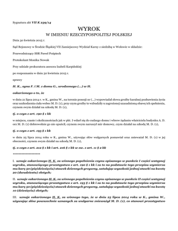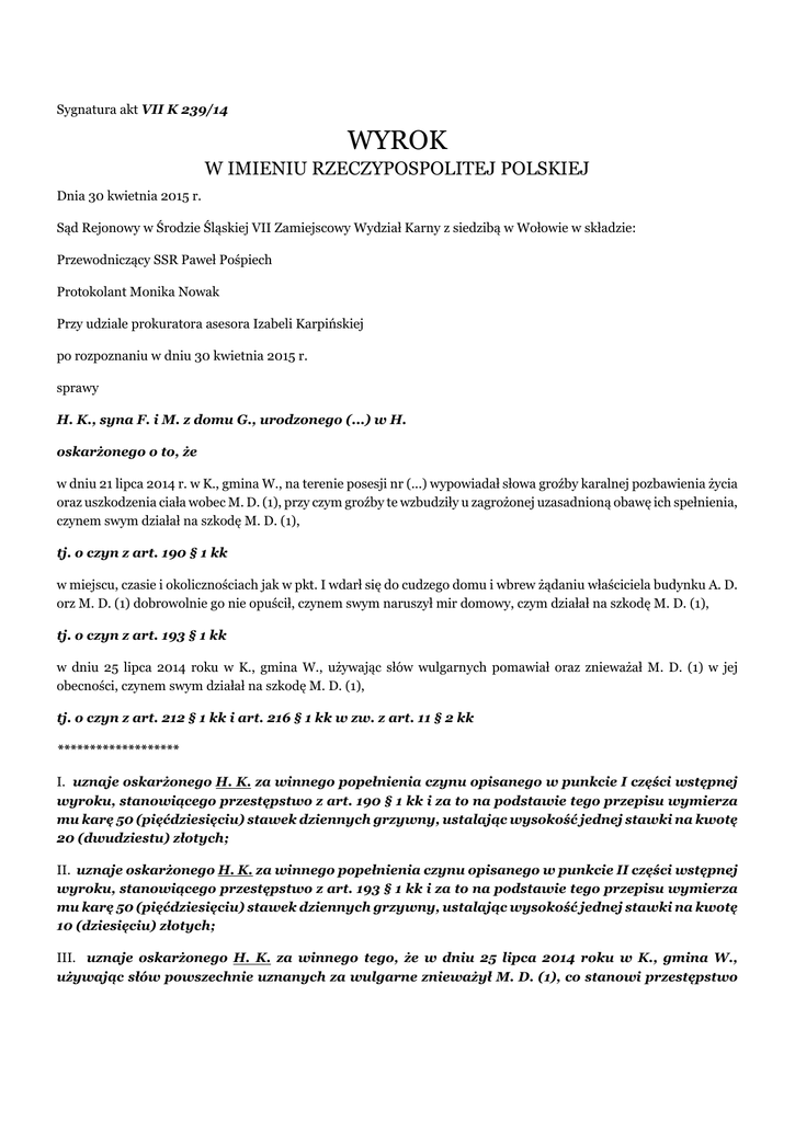 Sygnatura akt VII K 239/14 WYROK W IMIENIU RZECZYPOSPOLITEJ POLSKIEJ Dnia 30 kwietnia 2015 r. Sąd Rejonowy w Środzie Śląskiej VII Zamiejscowy Wydział Karny z siedzibą w Wołowie w składzie: Przewodniczący SSR Paweł Pośpiech Protokolant Monika Nowak Przy udziale prokuratora asesora Izabeli Karpińskiej po rozpoznaniu w dniu 30 kwietnia 2015 r. sprawy H. K., syna F. i M. z domu G., urodzonego (...) w H. oskarżonego o to, że w dniu 21 lipca 2014 r. w K., gmina W., na terenie posesji nr (...) wypowiadał słowa groźby karalnej pozbawienia życia oraz uszkodzenia ciała wobec M. D. (1), przy czym groźby te wzbudziły u zagrożonej uzasadnioną obawę ich spełnienia, czynem swym działał na szkodę M. D. (1), tj. o czyn z art. 190 § 1 kk w miejscu, czasie i okolicznościach jak w pkt. I wdarł się do cudzego domu i wbrew żądaniu właściciela budynku A. D. orz M. D. (1) dobrowolnie go nie opuścił, czynem swym naruszył mir domowy, czym działał na szkodę M. D. (1), tj. o czyn z art. 193 § 1 kk w dniu 25 lipca 2014 roku w K., gmina W., używając słów wulgarnych pomawiał oraz znieważał M. D. (1) w jej obecności, czynem swym działał na szkodę M. D. (1), tj. o czyn z art. 212 § 1 kk i art. 216 § 1 kk w zw. z art. 11 § 2 kk ******************* I. uznaje oskarżonego H. K. za winnego popełnienia czynu opisanego w punkcie I części wstępnej wyroku, stanowiącego przestępstwo z art. 190 § 1 kk i za to na podstawie tego przepisu wymierza mu karę 50 (pięćdziesięciu) stawek dziennych grzywny, ustalając wysokość jednej stawki na kwotę 20 (dwudziestu) złotych; II. uznaje oskarżonego H. K. za winnego popełnienia czynu opisanego w punkcie II części wstępnej wyroku, stanowiącego przestępstwo z art. 193 § 1 kk i za to na podstawie tego przepisu wymierza mu karę 50 (pięćdziesięciu) stawek dziennych grzywny, ustalając wysokość jednej stawki na kwotę 10 (dziesięciu) złotych; III. uznaje oskarżonego H. K. za winnego tego, że w dniu 25 lipca 2014 roku w K., gmina W., używając słów powszechnie uznanych za wulgarne znieważył M. D. (1), co stanowi przestępstwo z art. 216 § 1 kk i za to na podstawie tego przepisu wymierza my karę 50 (pięćdziesięciu) stawek dziennych grzywny, ustalając wysokość jednej stawki na kwotę 10 (dziesięć) złotych; IV. na podstawie art. 85 kk i art. 86 § 1 kk łączy wyżej orzeczone kary grzywny i wymierza oskarżonemu karę łączną 50 (pięćdziesięciu) stawek dziennych grzywny, ustalając wysokość jednej stawki na kwotę 30 (trzydziestu) złotych; V. na podstawie art. 627 kpk i art. 3 ust. 1 ustawy z dnia 23 czerwca 1973 roku o opłatach w sprawach karnych zasądza od oskarżonego na rzecz Skarbu Państwa koszty sądowe, w tym opłatę w kwocie 150 (stu pięćdziesięciu) złotych. Sygn. akt VII K 239/14 UZASADNIENIE Sąd ustalił następujący stan faktyczny. M. D. (1) pozostawała w związku partnerskim z A. K.. Mieszkali razem w domu A. D. i M. D. (1) w miejscowości K.. W dniu 21 lipca 2014 roku do miejsca zamieszkania A. D. przyjechał przerażony H. K.. Przerażał go fakt, że jego dorosły syn A. K. pozostaje w związku z kobietą, która miała bardzo złą opinię społeczną. Chciał zabrać go do domu. H. K. wszedł na posesję. Wyszła do niego A. D.. H. K. powiedział do niej „ja przyszedłem po syna”. A. D. zapytała, po jakiego syna. H. K. odpowiedział wówczas „Po mojego syna, który jest z tą dziwką, morderczynią”. A. D. kazała wtedy H. K. opuścić dom. Te słowa słyszała M. D. (1), która stała w korytarzu. H. K. odepchnął A. D. i wszedł na piętro domu, gdzie odepchnął również stojącą na schodach M. D. (1), która zaczęła krzyczeć do A. K.. A. K. pojawił się i powiedział do swojego ojca by wyszedł z domu. A. D. wielokrotnie mówiła do H. K., żeby opuścił dom. On na to nie reagował i w dalszym ciągu krzyczał „nie będziesz z tą kurwą i w tej chwili do domu”. A. K. poczuł się w tej chwili jakby ojciec mówił do 15 – latka. Przez chwilę kłócili się. H. K. używał wulgarnych słów pod adresem M. D. (1), lecz i ona także wypowiadała wulgarne słowa pod adresem H. K.. H. K. powiedział też do M. D. (1) „połamię Ci nogi, zabiję Cię jak będzie trzeba”, dalej mówił do niej, że „jest dziwką” i że zepsuje jej reputacje. W pewnym momencie H. K. opuścił posesję A. D. i M. D. (1). Dowody: zeznania świadka M. D. (1) – k. 2 – 2 odwrót, 78, zeznania świadka A. D. – k. 11 – 12, 62, zeznania świadka A. K. – k. 13 odwrót, 77 – 78, zeznania świadka M. D. (2) – k. 14 – 15, 78 – 79, zeznania świadka K. W. – k. 62 – 63. W dniu 25 lipca 2014 roku H. K. ponownie przyjechał do miejsca zamieszkania A. D. i M. D. (1). Tam wyzywał M. D. (1) słowami powszechnie uznanymi za wulgarne mówiąc do niej „kurwa, szmata, żebyś zdechła”. Dowody: zeznania świadka M. D. (1) – k. 18 odwrót, 78, zeznania świadka A. D. – k. 12, 61 – 62. Sąd zważył, co następuje. Analizując zebrany w sprawie materiał dowodowy sąd doszedł do przekonania, że wyjaśnienia oskarżonego przyznającego się znieważania M. D. (1) zasługują za wiarygodność, nie zasługują natomiast na wiarygodność te wyjaśnienia oskarżonego, w których zaprzecza on jakoby groził M. D. (1) pozbawieniem życia i uszkodzeniem ciała oraz że nie żądano od niego by opuścił posesję M. i A. D.. Są one bowiem sprzeczne z zeznaniami świadków M. D. (1), A. D., A. K., K. W.. W ocenie sądu, brak było powodów, dla których zeznania wymienionych świadków należałoby uznać za pozbawione waloru wiarygodności. Zeznania A. D. i M. D. (1) są ze sobą całkowicie spójne. Wynika z nich przede wszystkim, że w dniu 21 lipca 2014 roku oskarżony H. K. wszedł na posesję należącą do A. D. i M. D. (1) i pomimo żądania aby ją opuścił nie uczynił tego i na niej pozostawał po to znieważyć słowami powszechnie uzn