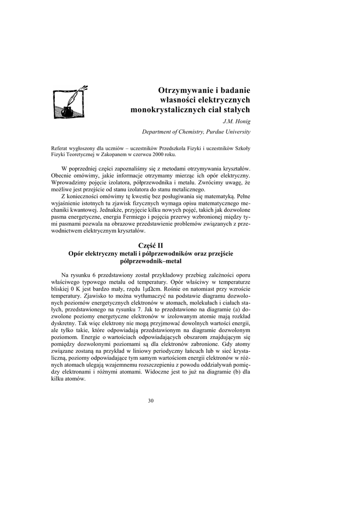 Otrzymywanie i badanie własności elektrycznych monokrystalicznych ciał stałych J.M. Honig Department of Chemistry, Purdue University Referat wygłoszony dla uczniów – uczestników Przedszkola Fizyki i uczestników Szkoły Fizyki Teoretycznej w Zakopanem w czerwcu 2000 roku. W poprzedniej części zapoznaliśmy się z metodami otrzymywania kryształów. Obecnie omówimy, jakie informacje otrzymamy mierząc ich opór elektryczny. Wprowadzimy pojęcie izolatora, półprzewodnika i metalu. Zwrócimy uwagę, że możliwe jest przejście od stanu izolatora do stanu metalicznego. Z konieczności omówimy tę kwestię bez posługiwania się matematyką. Pełne wyjaśnienie istotnych tu zjawisk fizycznych wymaga opisu matematycznego mechaniki kwantowej. Jednakże, przyjęcie kilku nowych pojęć, takich jak dozwolone pasma energetyczne, energia Fermiego i pojęcia przerwy wzbronionej między tymi pasmami pozwala na obrazowe przedstawienie problemów związanych z przewodnictwem elektrycznym kryształów. Część II Opór elektryczny metali i półprzewodników oraz przejście półprzewodnik–metal Na rysunku 6 przedstawiony został przykładowy przebieg zależności oporu właściwego typowego metalu od temperatury. Opór właściwy w temperaturze bliskiej 0 K jest bardzo mały, rzędu 1μΩcm. Rośnie on natomiast przy wzroście temperatury. Zjawisko to można wytłumaczyć na podstawie diagramu dozwolonych poziomów energetycznych elektronów w atomach, molekułach i ciałach stałych, przedstawionego na rysunku 7. Jak to przedstawiono na diagramie (a) dozwolone poziomy energetyczne elektronów w izolowanym atomie mają rozkład dyskretny. Tak więc elektrony nie mogą przyjmować dowolnych wartości energii, ale tylko takie, które odpowiadają przedstawionym na diagramie dozwolonym poziomom. Energie o wartościach odpowiadających obszarom znajdującym się pomiędzy dozwolonymi poziomami są dla elektronów zabronione. Gdy atomy związane zostaną na przykład w liniowy periodyczny łańcuch lub w sieć krystaliczną, poziomy odpowiadające tym samym wartościom energii elektronów w różnych atomach ulegają wzajemnemu rozszczepieniu z powodu oddziaływań pomiędzy elektronami i różnymi atomami. Widoczne jest to już na diagramie (b) dla kilku atomów. 30 Rys. 6 Typowa zależność oporu elektrycznego metalu od temperatury Gdy liczba atomów łączących się w kryształ jest bardzo duża poziomy o tych samych wartościach energii elektronów w różnych atomach również ulegają rozszczepieniu, ale ze względu na dużą liczbę atomów przerwy pomiędzy rozszczepionymi poziomami są bardzo małe. Innymi słowy, poziomy te tworzą gęsty zbiór, zawarty w określonym przedziale energii, który nazywamy pasmem energetycznym (ze względu na niewielkie różnice energii pomiędzy dwoma najbliższymi, poziomami – porównaj diagram (c) na rysunku 7). Różnice energii pomiędzy dwoma stanami w paśmie są dla ciał makroskopowych (N1023 atomów) niemierzalnie małe i dla celów praktycznych można je przybliżyć przez rozkład ciągły. Jak widać na rysunku, pasma odpowiadające różnym poziomom energetycznym elektronów w atomach są oddzielone od siebie obszarem energii, które są dla elektronów zabronione. W rzeczywistości pasma dozwolonych energii mają zwykle bardziej skomplikowaną strukturę i mogą na przykład na siebie zachodzić, ale takie sytuacje nie będą tu omawiane. Obszary energii zabronionych nazywane są przerwami energetycznymi (patrz diagram (7c)). Strukturę pasm energetycznych można otrzymać w wyniku sprowadzenia problemu wieloelektronowego do zagadnienia rozwiązania równania Schrödingera, podstawowego równania mechaniki kwantowej dla pojedynczego elektronu poruszającego się w krysztale. Rozmieszczeniem elektronów na poszczególnych poziomach w pasmach energetycznych rządzi pewna ogólna kwantowa zasada zwana zakazem Pauliego (lub zakazem Pauliego). Otóż, każdy pojedynczy poziom energetyczny, niezależnie od tego, czy rozważamy poziomy w izolowanym atomie, czy też w paśmie, może być zajęty przez co najwyżej dwa elektrony, przy czym muszą mieć one różne wartości kwantowej, magnetycznej liczby spinowej (umownie mówimy, iż muszą one mieć przeciwnie zwrócone spiny, czyli iż jeden z nich musi mieć spin zwrócony „w górę”, a drugi musi mieć spin zwrócony ,,w dół”, jak na diagramie (a)). Z tego też powodu, dla sieci krystalicznej utworzonej z N atomów, z których każdy ma tylko po jednym elektronie, tylko połowa pasma (począwszy od najniższego poziomu) jest wypełniona elektronami (N/2 z N wszystkich poziomów), zaś pozostałe poziomy pasma są wolne. Po przyłożeniu pola elektrycznego, elektrony z najwyższych zajętych poziomów (z poziomów znajdujących się blisko tak zwanego poziomu Fermiego) mogą zaabsorbować energię od pola i przejść do wyższego, 31 niezapełnionego poziomu energetycznego – elektrony te mogą się w ten sposób poruszać poprzez materiał, z którego zbudowany jest kryształ. Jednakże w takim przypadku muszą być niezapełnione stany dowolne tuż powyżej zapełnionych stanów (a nie przerwa!). Materiał staje się wtedy przewodnikiem prądu elektrycznego (metalem). Metal jest zatem z punktu widzenia elektronowego układem o częściowo wypełnionym paśmie i jest scharakteryzowany m.in. przez energię najwyżej obsadzonego poziomu w tym paśmie, zwanej energią (lub poziomem) Fermiego (por. Rys. 8a). Ruch elektronów jest jednak zaburzany przez ich zderzenia z drgającymi termicznie jonami tworzącymi sieć krystaliczną. Proces ten powoduje zmniejszenie średniej prędkości poruszających się po sieci krystalicznej elektronów, skąd wynika, iż metale mają pewną, określoną oporność właściwą w zadanej temperaturze. W miarę wzrostu temperatury drgania atomów wokół ich położeń równowagi w węzłach sieci krystalicznej stają się coraz bardziej intensy