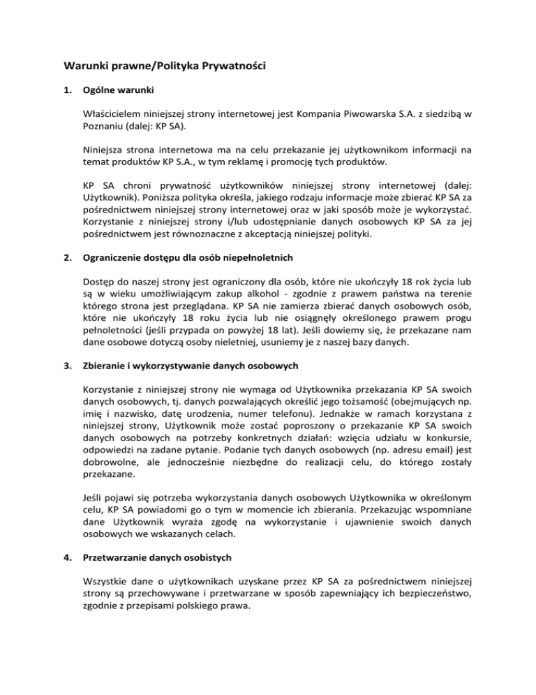 Warunki prawne/Polityka Prywatności 1. Ogólne warunki Właścicielem niniejszej strony internetowej jest Kompania Piwowarska S.A. z siedzibą w Poznaniu (dalej: KP SA). Niniejsza strona internetowa ma na celu przekazanie jej użytkownikom informacji na temat produktów KP S.A., w tym reklamę i promocję tych produktów. KP SA chroni prywatność użytkowników niniejszej strony internetowej (dalej: Użytkownik). Poniższa polityka określa, jakiego rodzaju informacje może zbierać KP SA za pośrednictwem niniejszej strony internetowej oraz w jaki sposób może je wykorzystać. Korzystanie z niniejszej strony i/lub udostępnianie danych osobowych KP SA za jej pośrednictwem jest równoznaczne z akceptacją niniejszej polityki. 2. Ograniczenie dostępu dla osób niepełnoletnich Dostęp do naszej strony jest ograniczony dla osób, które nie ukończyły 18 rok życia lub są w wieku umożliwiającym zakup alkohol - zgodnie z prawem państwa na terenie którego strona jest przeglądana. KP SA nie zamierza zbierać danych osobowych osób, które nie ukończyły 18 roku życia lub nie osiągnęły określonego prawem progu pełnoletności (jeśli przypada on powyżej 18 lat). Jeśli dowiemy się, że przekazane nam dane osobowe dotyczą osoby nieletniej, usuniemy je z naszej bazy danych. 3. Zbieranie i wykorzystywanie danych osobowych Korzystanie z niniejszej strony nie wymaga od Użytkownika przekazania KP SA swoich danych osobowych, tj. danych pozwalających określić jego tożsamość (obejmujących np. imię i nazwisko, datę urodzenia, numer telefonu). Jednakże w ramach korzystana z niniejszej strony, Użytkownik może zostać poproszony o przekazanie KP SA swoich danych osobowych na potrzeby konkretnych działań: wzięcia udziału w konkursie, odpowiedzi na zadane pytanie. Podanie tych danych osobowych (np. adresu email) jest dobrowolne, ale jednocześnie niezbędne do realizacji celu, do którego zostały przekazane. Jeśli pojawi się potrzeba wykorzystania danych osobowych Użytkownika w określonym celu, KP SA powiadomi go o tym w momencie ich zbierania. Przekazując wspomniane dane Użytkownik wyraża zgodę na wykorzystanie i ujawnienie swoich danych osobowych we wskazanych celach. 4. Przetwarzanie danych osobistych Wszystkie dane o użytkownikach uzyskane przez KP SA za pośrednictwem niniejszej strony są przechowywane i przetwarzane w sposób zapewniający ich bezpieczeństwo, zgodnie z przepisami polskiego prawa. 5. Ujawnienie/przekazanie danych osobowych Dane osobowe przekazane KP SA w ramach niniejszej strony nie są przekazywane, ani ujawniane podmiotom trzecim, chyba, że Użytkownik wyraził na to zgodę. Powyższe nie dotyczy przekazania danych osobowych na uprawnione żądanie upoważnionych do tego organów administracji lub sądów. 6. Pliki cookie Pliki cookie to pliki lub części informacji, które mogą być przechowywane na komputerze Użytkownika podczas odwiedzania niniejszej strony. Pliki cookie pomagają analizować odwiedzających strony internetowe i powiadamiają ich administratorów, gdy są one odwiedzane. Pliki cookie umożliwiają witrynom internetowym automatyczne rozpoznanie użytkownika. Aplikacja strony internetowej może dzięki nim dostosować swoje reakcje do potrzeb i preferencji użytkownika, zbierając i zapamiętując informacje o dokonywanych przez niego wyborach. KP SA nie korzysta z plików cookie, aby zbierać informacje, które pozwalają określić tożsamość Użytkownika. KP SA może używać cookies do rozpoznania Użytkowników (w szczególności ich wieku) oraz do zbierania ogólnych statystycznych informacji o sposobie korzystania przez nich z niniejszej strony. KP SA nie używa cookies do gromadzenia danych osobowych, takich jak: imię, nazwisko lub adres e-mail. W jaki sposób kontrolować i usuwać plikami cookie Użytkownik może usuwać pliki cookie – pliki te przechowywane są na twardym dysku lub w wyszukiwarce internetowej. Aby ograniczyć lub zablokować pliki cookies umieszczane przez KP SA czy też jakąkolwiek inną stronę internetową lub aby otrzymywać powiadomienia o umieszczanych plikach cookie lub całkowicie zrezygnować z ich przyjmowania, należy dokonać odpowiednich ustawień wyszukiwarki. Aby dowiedzieć się, jak to zrobić, należy skorzystać z funkcji „Pomocy” w wyszukiwarce. Należy również pamiętać, że odmowa przyjęcia plików cookie może uniemożliwić korzystanie z pewnych możliwości, jakie oferuje niniejsza strona internetowa. 7. Bezpieczeństwo i prawdziwość Prawdziwość i bezpieczeństwo danych osobowych Użytkowników jest dla nas ważne. Utworzyliśmy w związku z tym fizyczne i elektroniczne procedury pozwalające zapewnić bezpieczeństwo danych osobowych Użytkowników. Dostęp do nich zastrzeżony jest wyłącznie dla upoważnionych pracowników administracyjnych. Każdy Uczestnik ma prawo wglądu w swoje dane i ich poprawiania oraz żądania ich usunięcia. Jeśli przekazywałeś/przekazywałaś nam swoje dane osobowe i chcesz, by zostały usunięte z naszych zasobów lub uaktualnione, prosimy o kontakt pod adresem: [email protected]. Jednocześnie zastrzegamy, iż potrzebujemy czasu, by dokonać aktualizacji danych Użytkownika. 8. Treści zamieszczane na stronie przez Użytkowników W przypadku umożliwienia Użytkownikom zamieszczania na niniejszej stronie treści - w szczególności komentarzy - KP S.A. zastrzega sobie prawo do usunięcia treści zamieszczonych przez Użytkownika, które w jej uznaniu mogą naruszać prawo, dobre obyczaje, uczucia religijne, prawa lub dobra osobiste osób trzecich, dobre imię KP S.A. lub prezentowanej na stronie marki, bądź zawiera słowa wulgarne lub powszechnie uważane za obraźliwe. 9. Kontakt Jeżeli masz więcej pytań. skontaktuj się z nami pod adresem [email protected]. Adres siedziby spółki w Poznaniu: ul. Szwajcarska 11 61-285 Poznań tel. +48 (061) 667-77-94 tel. +48 (061) 667-70-00 faks: +48 (061) 667-78-50