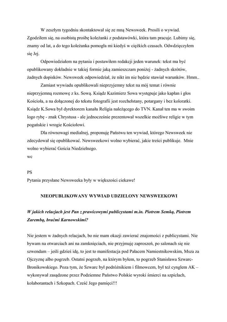 W zeszłym tygodniu skontaktował się ze mną Newsweek. Prosili o wywiad. Zgodziłem się, na osobistą prośbę koleżanki z podstawówki, która tam pracuje. Lubimy się, znamy od lat, a do tego koleżanka pomogła mi kiedyś w ciężkich czasach. Odwdzięczyłem się Jej. Odpowiedziałem na pytania i postawiłem redakcji jeden warunek: tekst ma być opublikowany dokładnie w takiej formie jaką zamieszczam poniżej - żadnych skrótów, żadnych dopisków. Newsweek odpowiedział, że nikt im nie będzie stawiał warunków. Hmm.. Zamiast wywiadu opublikowali nieprzyjemny tekst na mój temat i równie nieprzyjemną rozmowę z ks. Sową. Ksiądz Kazimierz Sowa występuje jako kapłan i głos Kościoła, a na dołączonej do tekstu fotografii jest rozchełstany, potargany i bez koloratki. Ksiądz K.Sowa był dyrektorem kanału Religia należącego do TVN. Kanał ten ma w swoim logo rybę - znak Chrystusa - ale jednocześnie prezentował wszelkie możliwe religie w tym pogańskie i wrogie Kościołowi. Dla równowagi medialnej, proponuję Państwu ten wywiad, którego Newsweek nie zdecydował się opublikować. Newsweekowi wolno wybierać, jakie treści publikuje. Mnie wolno wybierać Gościa Niedzielnego. wc PS Pytania przysłane Newsweeka były w większości ciekawe! NIEOPUBLIKOWANY WYWIAD UDZIELONY NEWSWEEKOWI W jakich relacjach jest Pan z prawicowymi publicystami m.in. Piotrem Semką, Piotrem Zarembą, braćmi Karnowskimi? Nie jestem w żadnych relacjach, bo nie mam okazji zawierać znajomości z publicystami. Nie bywam na otwarciach ani na zamknięciach, nie przyjmuję zaproszeń, po salonach się nie szwendam – jeśli gdzieś idę, to jest to manifestacja pod Pałacem Namiestnikowskim, Msza za Ojczyznę albo pogrzeb. Ostatni pogrzeb, na którym byłem, to pogrzeb Stanisława SzwarcBronikowskiego. Poza tym, że Szwarc był podróżnikiem i filmowcem, był też cynglem AK – wykonywał zasądzone przez Podziemne Państwo Polskie wyroki śmierci na szpiclach, kolaborantach i Szkopach. Cześć Jego pamięci!!! W koligacjach ani koteriach nie uczestniczę. Pracuję zawsze u siebie, we własnej firmie, nigdy w czyjejś redakcji. A zatem nie mam okazji poznawać dziennikarzy. Żadnego z wymienionych Panów nie znam osobiście, choć o każdym słyszałem. Jeden z braci Karnowskich jest kłamczuchem – tyle wiem na pewno. Nie może się skutecznie wyspowiadać, a w konsekwencji nie powinien przyjmować Komunii Świętej. Opublikował kiedyś ogromny wywiad ze mną, którego mu nigdy nie udzieliłem. Ogłaszał publicznie, że ma taśmy z nagraniami i mi je wyśle. Jakoś nie wysłał. Ten „wywiad” był nieprzyjemny i szkodliwy dla mnie. Fałszerstwo. Do czasu naprawienia szkody, każda spowiedź Pana Karnowskiego jest nieważna – takie mamy reguły w Kościele Katolickim. Trwa Wielki Post, może się chłop nawróci. Z takich mniej więcej powodów trzymam się w ostrożnej odległości od publicystów, nawet prawicowych. Klucze od domu powierzyłbym Rafałowi Ziemkiewiczowi, którego szanuję i czytam z uwagą, oraz Krzysztofowi Skowrońskiemu, którego lubię i się z nim koleguję. Resztę znam raczej z daleka. A czy oni prawicowi? To niedobre słowo, bo nic nie definiuje. Dużo bardziej adekwatne jest określenie „opozycja niepodległościowa” zdefiniowana jako przeciwieństwo antypolskiej, poddańczej polityki Donalda, Zdradka, Komoruska i reszty Padalców. Przy czym słowo Padalec oznacza kogoś, kto pada na twarz przed obcymi w celu wylizania butów. Wróg – proszę o zdefiniowanie, kim są Pana wrogowie. Wrogami mojej Ojczyzny, czyli moimi osobistymi również, są Niemcy, Rosja i Unia Europejska. Dużo łatwiej byłoby nam współpracować z Unią lub Niemcami, zawierać z nimi roztropne sojusze, gdybyśmy stawiali tę sprawę jasno. Z wrogiem można się dogadywać, niekoniecznie trzeba strzelać. Dużo łatwiej byłoby nam handlować z Rosją, gdybyśmy handlowali z pozycji: jesteś naszym wrogiem, starasz się nas pożreć od stuleci, dzisiaj ci się to nie uda, dzisiaj chcesz nam sprzedać gaz, za ile? Z wrogiem można rozmawiać bez potrzeby rzucania się mu w ramiona lub do nóg. A Tuski, Zdradki i Padalce mają wobec Rosji syndrom sztokholmski. Co do wrogów osobistych, to nie zajmuję się nimi, czyli nie ma między nami relacji – oni czują do mnie wrogość, a ja do nich nie czuję nic. Niekiedy docierają do mnie sygnały o wrogości poprzez mojego Facebooka lub stronę internetową. Bluzgów i anonimów nie czytam (trzeba się podpisać), na listy interesujące odpowiadam, i to częściej na te od wrogów niż te od przyjaciół. Są też zawzięte środowiska, które zwalczają mnie od lat – Gazeta Wyborcza i pederaści (termin medyczny, stosuję go zawsze świadomie w kontraście do nowomowy wypranej z osobistego stosunku do zjawiska). Co to znaczy być „radykalnym katolem”? Jezus był radykałem, nie ściemniał, nazywał rzeczy po imieniu, mowa jego była prosta: taktak, nie-nie. Doktryna Jezusa była bardzo radykalna wtedy i jest radykalna dzisiaj. Dlatego Kościół Katolicki ma co roku tysiące męczenników za wiarę. Katolików zabija się za przekonania religijne! Moje poglądy w sprawach doktrynalnych się nie zmieniają, bo doktryna Kościoła jest niezmienna. Z tymi samymi poglądami co dziś, trzydzieści lat temu nie byłem radykałem, a teraz jestem. Dlaczego? Świat zdziczał. Coraz więcej dzikusów dookoła. Kiedyś byli na marginesie, dziś siedzą w Sejmie - facet z torebką, facet ze gumowym siurkiem - jako elita narodu. Fuj! Wolę być radykałem Zresztą radykalizm to nic złego, to raczej cecha, a nie wada. Idzie Pani do lekarza, a on mówi: poprzednia kuracja nie przyniosła efektów, zastosujemy radykalne metody. Czy ma mu Pani za złe? Narzędzia dobiera się stosownie do okoliczności. Kiedy dobre słowo nie skutkowało, moja babcia sięgała po pasek. Mądra babcia. Cześć Jej pamięci! Świat zrobił się rozmemł