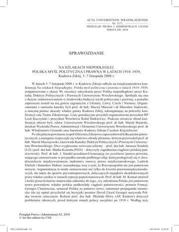ACTA UNIVERSITATIS WRATISLAVIENSIS ———————— No 3171 ———————— PRZEGLĄD PRAWA I ADMINISTRACJI LXXXII WROCŁAW 2010 SPRAWOZDANIE NA SZLAKACH NIEPODLEGŁEJ. POLSKA MYŚL POLITYCZNA I PRAWNA W LATACH 1918–1939, Kudowa Zdrój, 5–7 listopada 2008 r. W dniach 5–7 listopada 2008 r. w Kudowie Zdroju odbyła się międzynarodowa konferencja Na szlakach Niepodległej. Polska myśl polityczna i prawna w latach 1918–1939, zorganizowana z okazji 90. rocznicy odzyskania przez Polskę niepodległości przez Katedrę Doktryn Politycznych i Prawnych Uniwersytetu Wrocławskiego. Spotkała się ona z dużym zainteresowaniem w środowisku badaczy myśli politycznej i prawnej, a ponadto zaproszeni zostali na nią goście zagraniczni z Ukrainy, Litwy, Czech i Niemiec. Organizatorami z ramienia katedry byli prof. dr hab. Maciej Marszał i dr Mirosław Sadowski, a znaczną pomoc okazały władze gminy Kudowa Zdrój, udostępniając na potrzeby konferencji salę Teatru Zdrojowego. Listy gratulacyjne przysłali organizatorom prezydent RP Lech Kaczyński i prezydent Wrocławia Rafał Dutkiewicz. Podczas otwarcia obrad konferencji obecni byli: rektor Uniwersytetu Wrocławskiego prof. dr hab. Marek Bojarski, dziekan Wydziału Prawa, Administracji i Ekonomii Uniwersytetu Wrocławskiego prof. dr hab. Włodzimierz Gromski oraz burmistrz Kudowy Zdroju Czesław Kręcichwost. Po oficjalnym powitaniu zespół Orkiestra Zdrojowa zaprezentował kilka pieśni patriotycznych, a następnie rozpoczęły się właściwe obrady plenarne, którym przewodził prof. dr hab. Marek Maciejewski, kierownik Katedry Doktryn Politycznych i Prawnych Uniwersytetu Wrocławskiego. Dwa wygłoszone wówczas referaty – prof. dra hab. Janusza Sondela (UJ) i prof. dra hab. Marka Kornata (PAN) – dotyczyły zagadnienia ciągłości polskiej państwowości. Prof. dr hab. J. Sondel przedstawił koncepcję ius postlimini (prawa powrotu, mającego zastosowanie w przypadku narodu podbitego siłą), którą posługiwali się w dwudziestoleciu międzywojennym znakomici znawcy prawa międzynarodowego, Ludwik Ehrlich i Stanisław Hubert, uzasadniając tezę o tym, że Rzeczpospolita nie jest państwem nowym. Argumentacja ta miała zastosowanie nie tylko do kwestii prawnomiędzynarodowych, ale także do sporów prywatnoprawnych, dotyczących majątków skonfiskowanych przez władze carskie w ramach represji popowstaniowych. Prof. dr hab. M. Kornat omówił z kolei przeciwstawne stanowiska odnośnie do tego, czy odrodzona Polska jest państwem nowo powstałym: władze polskie podkreślały ciągłość państwowości, premier Francji, Georges Clemenceau, uznawał Polskę za państwo nowe, natomiast propaganda niemiecka (do jej opinii przychylał się brytyjski premier David Lloyd George) nazywała Polskę tworem sztucznym. Referat prof. dra hab. Michała Śliwy (AP, Kraków) dotyczył problemów ideowych, przed którymi stanęli polscy socjaliści po 1918 r. Według tezy Przegląd Prawa i Administracji 82, 2010 © for this edition by CNS PPiA_LXXXII.indb 331 2011-09-26 12:29:32 332 SPRAWOZDANIE wystąpienia myśl socjalistyczna w okresie międzywojennym cechowała się mniejszym wyrafinowaniem teoretycznym niż w czasach zaborów. Prof. dr hab. Krzysztof Kawalec (UWr) w referacie zatytułowanym Mit Polski jako wielkiego państwa w poczynaniach elit w pierwszych latach II RP stwierdził, że w zasadzie cała elita polityczna w 1918 r. dążyła do odbudowy Polski jako państwa silnego. Na zadawane w literaturze pytanie, czy wówczas nie można było prowadzić innej, bardziej „racjonalnej” polityki, prof. dr hab. K. Kawalec odpowiedział, że nie istniała wtedy sensowna koncepcja alternatywna dla idei budowy Polski wielkiej. Sesję plenarną zamykał referat dra Arkadego Rzegockiego (UJ), który dotyczył racji stanu w polskiej myśli politycznej. Referent stwierdził, że pojęcie racji stanu do lat 30. XX wieku było łączone z absolutyzmem, a przez to mało popularne. Drugiego dnia konferencji obrady toczyły się w dwóch sekcjach. Obradom w Teatrze Zdrojowym przewodzili prof. dr hab. Zbigniew Rau i prof. dr hab. Włodzimierz Bernacki. Drugą sekcję, która odbywała się w Scaliano Villa, prowadzili prof. dr hab. K. Kawalec i prof. dr hab. Jacek Bartyzel (UMK). Zgromadzeni w Teatrze Zdrojowym uczestnicy konferencji mogli najpierw usłyszeć wystąpienie prof. dra hab. Marka Maciejewskiego (UWr), dotyczące federacyjnych koncepcji piłsudczyków u zarania II RP i możliwości ich realizacji. Prof. dr hab. Maciej Marszał przedstawił natomiast rozwijaną zwłaszcza w latach 1934–1939 ideę polskiego nacjonalizmu integralnego. Z tym referatem korespondowała w pewnym stopniu wypowiedź dr Iwony Barwickiej-Tylek (UJ), zatytułowana Cnotliwy obywatel – skuteczna władza – dobre państwo. Myśl polityczna XX-lecia międzywojennego w poszukiwaniu fundamentów silnego państwa, w której autorka zaznaczyła, że ogromne oczekiwania w stosunku do nowo powstałego państwa powodowały narastanie po 1918 r. frustracji, lecz później, w latach 30., powstrzymywały narastanie totalitaryzmu. W referacie dotyczącym stosunku polskiej międzywojennej myśli politycznej i społecznej do hitlerowskiego rasizmu prof. dr hab. Michał Musielak (Uniwersytet Medyczny, Poznań) postawił tezę, że najbardziej krytycznie o nazistowskiej teorii ras wypowiadali się przedstawiciele katolickiej myśli społecznej. Dr Grzegorz Ławnikowicz (UMCS) przedstawił ideę uspołecznienia państwa, którą głosili przedstawiciele obozu sanacyjnego – Walery Sławek i Adam Skwarczyński, a która opierała się na założeniu, że zadań rządu jest coraz więcej i ulegają one komplikacji. Nie należy jednak dopuścić, by państwo stało się omnipotentne, wobec czego to społeczeństwo ma być wartością nadrzędną. Jak głosi teza zwolenników tej idei – należy to społeczeństwo wychować do tego, aby jego członkowie mogli w
