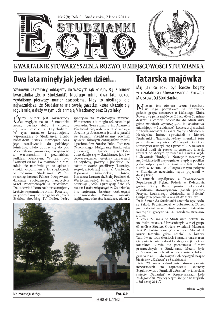 Echo Nr 2(8) Rok 3 Studzianka, 7 lipca 2011 r. STUDZIANKI KWARTALNIK STOWARZYSZENIA ROZWOJU MIEJSCOWOŚCI STUDZIANKA Dwa lata minęły jak jeden dzień... Szanowni Czytelnicy, oddajemy do Waszych rąk kolejny 8 już numer kwartalnika „Echo Studzianki”. Niedługo minie dwa lata odkąd wydaliśmy pierwszy numer czasopisma. Niby to niedługo, ale najważniejsze, że Studzianka ma swoją gazetkę, która ukazuje się regularnie, a duży w tym udział mają Mieszkancy oraz Czytelnicy. Ó smy numer jest rozszerzony ze względu na to, iż materiału mamy bardzo dużo i chcemy się nim dzielić z Czytelnikami. W tym numerze kontynuujemy wspomnienia o Studziance. Dzięki kontaktom Sławka Hordejuka oraz jego zamiłowaniu do polskiego lotnictwa, udało dotrzeć się do płk. Mieczysława Janowicza, związanego z warszawskim i poznańskim pułkiem lotniczym. W tym roku skończył 80 lat. Po rozmowie z nim, udało się namówić go na spisanie swoich wspomnień z lat spędzonych w rodzinnej Studziance. W 50. rocznicę śmierci Feliksa Pirogowicza, działacza społecznego, nauczyciela Szkół Powszechnych w Studziance, Dokudowie i Łomazach prezentujemy krótkie wspomnienie o nim. Poza tym, przypominamy postać generała Józefa Bielaka, dowódcę IV Pułku, który spoczywa na miejscowym mizarze. W numerze nie mogło też zabraknąć wywiadu. Tym razem z ks. Adamem Józefaciukiem, rodem ze Studzianki, a obecnie proboszczem jednej z parafii we Francji. Przedstawiamy również sylwetki młodych entuzjastów sportu i pasjonatów: Sandrę Fuks, Tomasza Ossowskiego, Małgorzatę Bańkowską (Tokarską). Oprócz przeszłości dużo dzieje się w Studziance, jak i w Stowarzyszeniu. Jesteśmy zapraszani na występy, pokazy i prelekcje. W ostatnim czasie gościliśmy (łucznicy, zespół, młodzież) m.in. w Coniewie, Dąbrowie Białostockiej, Tłuścu, Piszczacu, Łomazach, Białej Podlaskiej. Warto zauważyć, że sami Czytelnicy powielają „Echo” i przesyłają dalej do rodzin i osób związanych ze Studzianką i z regionem. Jesteśmy dostrzegani i zauważalni. Piszemy wnioski i aplikujemy o kolejne fundusze. cd. str 2 Tatarska majówka Maj jak co roku był bardzo bogaty w działalności Stowarzyszenia Rozwoju Miejscowości Studzianka. M iesiąc ten otwiera sezon łuczniczy. W jego początkach w Studziance gościła grupa rowerowa z Bialskiego Klubu Rowerowego na majówce. Blisko 60 osób mimo deszczu i chłodu dojechało do Studzianki, gdzie zwiedzali wystawę „330 lat osadnictwa tatarskiego w Studziance”. Rowerzyści słuchali z zaciekawieniem Łukasza Wędy i Sławomira Hordejuka, którzy opowiadali o historii Studzianki i Tatarach, którzy mieszkali tutaj przez blisko trzy wieki. W budynku świetlicy rowerzyści osuszyli się i przebrali. Z muzeum cykliści udali się prosto na cmentarz tatarski (mizar) po którym oprowadzali Łukasz Węda i Sławomir Hordejuk. Następnie uczestnicy majówki zasiedli przy ognisku i ciepłym posiłku. Jedni odpoczywali, a inni strzelali z łuku i grali w KUBB. Po kilkugodzinnym pobycie w Studziance uczestnicy rajdu pojechali w dalszą trasę. W ramach współpracy z Towarzystwem Popularyzacji Piękna Polesia w Kołaczach, gmina Stary Brus, powiat włodawski, członkowie stowarzyszenia gościli podczas Festynu Rodzinnego „Majówka na Polesiu”. Grupa przeprowadziła warsztaty łucznicze. Dnia 3 maja do Studzianki zawitała wycieczka ze Szkoły Podstawowej w Lubartowie. Dzieci po odwiedzeniu studziańskiej tatarskiej nekropolii grały w KUBB i uczyli się strzelania z łuku. Z kolei 22 maja w Studziance odbyła się majówka tatarska. Uczestniczyła w niej grupa 61 osób z Siedlce. Goście zwiedzali Muzeum Wsi Podlaskiej Pana Józefaciuka. Odwiedzili mizar tatarski, gdzie słuchali o historii Tatarów na tych ziemiach i samym cmentarzu. Oczywiście nie zabrakło degustacji potraw tatarskich. Obyła się prezentacja filmów promocyjnych o Studziance. Można było spróbować swoich sił w strzelaniu z łuku i grze w KUBB. Dla wszystkich wystąpił zespół biesiadny „Zielawa” ze Studzianki. Dnia 29 maja członkowie stowarzyszenia uczestniczyli na zaproszenie Dżenetty Bogdanowicz z Fundacji „Asman” w tatarskim święcie „Sabantuj” w Kruszynianach koło Białegostoku. Więcej o tym święcie w artykule „ Sabantuj 2011”. Na rozstaju dróg... Fot. S.H. ECHO STUDZIANKI Łukasz Węda WYDARZENIA Dwa lata minęły, jak jeden dzień… Planów jest bardzo dużo. Wszystko w swoim czasie. Czekamy też na uwagi i sugestie dotyczące samego kwartalnika, jak i naszej działalności. Nasz kwartalnik, według potwierdzonych informacji czytają regularnie w Studziance, Łomazach, Białej Podlaskiej, Lublinie, Warszawie, Szczecinie, Berlinie, Australii, Ameryce Północnej i na Wyspach Brytyjskich. Korespondencja w sprawie umieszczanych artykułów jest ożywiona. Kolejne materiały docierają do nas i czekają na publikacje. Zarówno w wersji internetowej, jak i papierowej, „Echo Studzianki” przemierza świat. Wszystko to, co się wokół nas dzieje, to zasługa Was, drodzy Mieszkańcy, bez których tego wszystkiego by nie było. Zarówno dzieci, młodzież, rodzice i dziadkowie wnoszą wiele do naszych działań. Przygotowania do festynu i prace w świetlicy zasługują na szczególne wyróżnienie. Mieszkańcy w pocie czoła poświęcając swój czas, zdrowie i pieniądze, zawsze wspomagając prace. Chwała Wam za to. Dziękujemy też wszystkim Darczyńcom bez których spotkanie z kulturą tatarską i regionalną nie miałoby możliwości się odbyć. III Dni Kultury Tatarskiej w dniach 30-31 lipca są bardzo dobrą okazją do spotkań dla tych wszystkich, dla których zarówno Studzianka, jak i kultura tatarska są bliskie sercu. Łukasz Węda Nie umiera ten, kto żyje w pamięci i sercach innych P ierwsza połowa tego roku przyniosła stratę kilku ważnych postaci dla polskiej nauki i kultury. W lutym zmarł prof. Arkadiusz Kołodziejczyk, a już w 