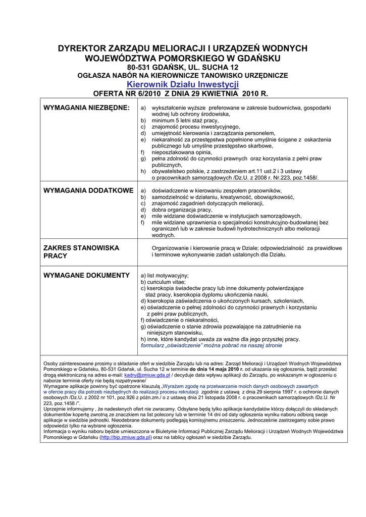 DYREKTOR ZARZĄDU MELIORACJI I URZĄDZEŃ WODNYCH WOJEWÓDZTWA POMORSKIEGO W GDAŃSKU 80-531 GDAŃSK, UL. SUCHA 12 OGŁASZA NABÓR NA KIEROWNICZE TANOWISKO URZĘDNICZE Kierownik Działu Inwestycji OFERTA NR 6/2010 Z DNIA 29 KWIETNIA 2010 R. WYMAGANIA NIEZBĘDNE: a) b) c) d) e) f) g) h) WYMAGANIA DODATKOWE ZAKRES STANOWISKA PRACY WYMAGANE DOKUMENTY a) b) c) d) e) f) wykształcenie wyższe preferowane w zakresie budownictwa, gospodarki wodnej lub ochrony środowiska, minimum 5 letni staż pracy, znajomość procesu inwestycyjnego, umiejętność kierowania i zarządzania personelem, niekaralność za przestępstwa popełnione umyślnie ścigane z oskarżenia publicznego lub umyślne przestępstwo skarbowe, nieposzlakowana opinia, pełna zdolność do czynności prawnych oraz korzystania z pełni praw publicznych, obywatelstwo polskie, z zastrzeżeniem art.11 ust.2 i 3 ustawy o pracownikach samorządowych /Dz.U. z 2008 r. Nr.223, poz.1458/. doświadczenie w kierowaniu zespołem pracowników, samodzielność w działaniu, kreatywność, obowiązkowość, znajomość zagadnień dotyczących melioracji, dobra organizacja pracy, mile widziane doświadczenie w instytucjach samorządowych, mile widziane uprawnienia o specjalności konstrukcyjno-budowlanej bez ograniczeń lub w zakresie budowli hydrotechnicznych albo melioracji wodnych. Organizowanie i kierowanie pracą w Dziale; odpowiedzialność za prawidłowe i terminowe wykonywanie zadań ustalonych dla Działu. a) list motywacyjny; b) curiculum vitae; c) kserokopia świadectw pracy lub inne dokumenty potwierdzające staż pracy, kserokopia dyplomu ukończenia nauki, d) kserokopia zaświadczenia o ukończonych kursach, szkoleniach, e) oświadczenie o pełnej zdolności do czynności prawnych i korzystaniu z pełni praw publicznych, f) oświadczenie o niekaralności, g) oświadczenie o stanie zdrowia pozwalające na zatrudnienie na niniejszym stanowisku, h) inne, które kandydat uważa za ważne dla jego przyszłej pracy. formularz „oświadczenie” można pobrać na naszej stronie Osoby zainteresowane prosimy o składanie ofert w siedzibie Zarządu lub na adres: Zarząd Melioracji i Urządzeń Wodnych Województwa Pomorskiego w Gdańsku, 80-531 Gdańsk, ul. Sucha 12 w terminie do dnia 14 maja 2010 r. od ukazania się ogłoszenia, bądź przesłać drogą elektroniczną na adres e-mail: [email protected] / decyduje data wpływu aplikacji do Zarządu, po wskazanym w ogłoszeniu o naborze terminie oferty nie będą rozpatrywane/ Wymagane aplikacje powinny być opatrzone klauzulą „Wyrażam zgodę na przetwarzanie moich danych osobowych zawartych w ofercie pracy dla potrzeb niezbędnych do realizacji procesu rekrutacji zgodnie z ustawą z dnia 29 sierpnia 1997 r. o ochronie danych osobowych /Dz.U. z 2002 nr 101, poz.926 z późn.zm./ o z ustawą dnia 21 listopada 2008 r. o pracownikach samorządowych /Dz.U. Nr 223, poz.1458 /”. Uprzejmie informujemy , że nadesłanych ofert nie zwracamy. Odsyłane będą tylko aplikacje kandydatów którzy dołączyli do składanych dokumentów kopertę zwrotną ze znaczkiem na list polecony lub w terminie 14 dni od daty ogłoszenia wyniku naboru odbiorą swoje aplikacje w siedzibie jednostki. Nieodebrane dokumenty podlegają komisyjnemu zniszczeniu. Jednocześnie zastrzegamy sobie prawo odpowiedzi tylko na wybrane ogłoszenia. Informacja o wyniku naboru będzie umieszczona w Biuletynie Informacji Publicznej Zarządu Melioracji i Urządzeń Wodnych Województwa Pomorskiego w Gdańsku (http://bip.zmiuw.gda.pl) oraz na tablicy ogłoszeń w siedzibie Zarządu.