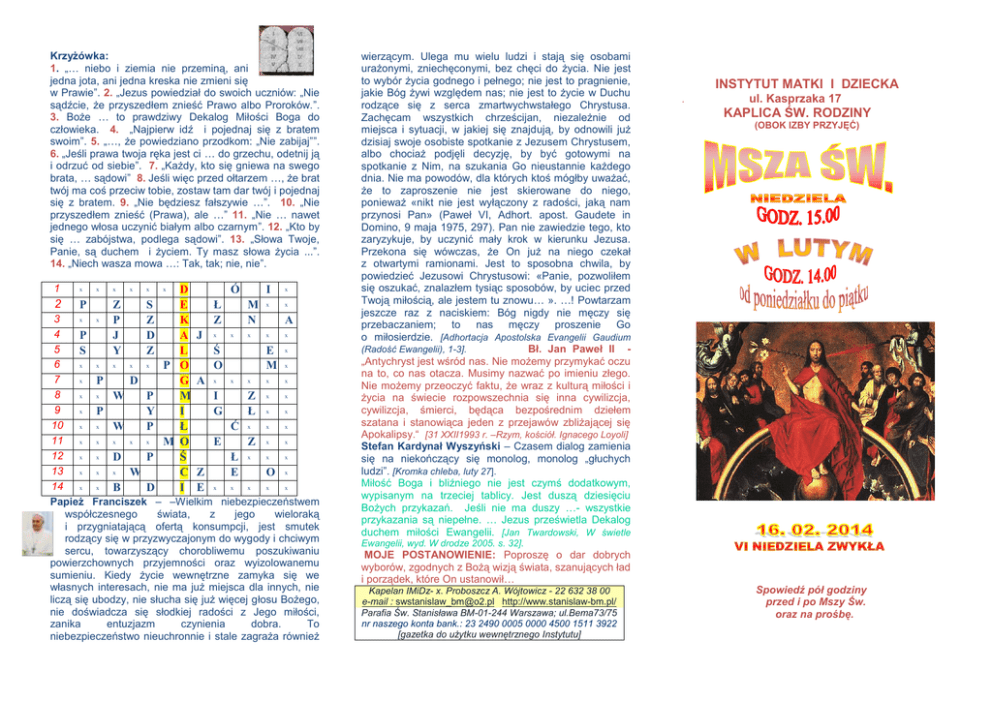 Krzyżówka: 1. „… niebo i ziemia nie przeminą, ani jedna jota, ani jedna kreska nie zmieni się w Prawie”. 2. „Jezus powiedział do swoich uczniów: „Nie sądźcie, że przyszedłem znieść Prawo albo Proroków.”. 3. Boże … to prawdziwy Dekalog Miłości Boga do człowieka. 4. „Najpierw idź i pojednaj się z bratem swoim”. 5. „…, że powiedziano przodkom: „Nie zabijaj””. 6. „Jeśli prawa twoja ręka jest ci … do grzechu, odetnij ją i odrzuć od siebie”. 7. „Każdy, kto się gniewa na swego brata, … sądowi” 8. Jeśli więc przed ołtarzem …, że brat twój ma coś przeciw tobie, zostaw tam dar twój i pojednaj się z bratem. 9. „Nie będziesz fałszywie …”. 10. „Nie przyszedłem znieść (Prawa), ale …” 11. „Nie … nawet jednego włosa uczynić białym albo czarnym”. 12. „Kto by się … zabójstwa, podlega sądowi”. 13. „Słowa Twoje, Panie, są duchem i życiem. Ty masz słowa życia ...”. 14. „Niech wasza mowa …: Tak, tak; nie, nie”. 1 2 D P Z S E x x P Z K P J D A S Y Z L x x x x x P O x P D G x x W P M x P Y I x x W P Ł x x x x x M O x x D P Ś x x x W C x x B D I x x x x x Ó x Ł M I x x x 3 Z N A 4 J x x x x x 5 Ś E x 6 O M x 7 A x x x x x 8 I Z x x 9 G Ł x x 10 Ć x x x 11 E Z x x 12 Ł x x x 13 Z E O x x x x x x 14 E Papież Franciszek – –Wielkim niebezpieczeństwem współczesnego świata, z jego wieloraką i przygniatającą ofertą konsumpcji, jest smutek rodzący się w przyzwyczajonym do wygody i chciwym sercu, towarzyszący chorobliwemu poszukiwaniu powierzchownych przyjemności oraz wyizolowanemu sumieniu. Kiedy życie wewnętrzne zamyka się we własnych interesach, nie ma już miejsca dla innych, nie liczą się ubodzy, nie słucha się już więcej głosu Bożego, nie doświadcza się słodkiej radości z Jego miłości, zanika entuzjazm czynienia dobra. To niebezpieczeństwo nieuchronnie i stale zagraża również wierzącym. Ulega mu wielu ludzi i stają się osobami urażonymi, zniechęconymi, bez chęci do życia. Nie jest to wybór życia godnego i pełnego; nie jest to pragnienie, jakie Bóg żywi względem nas; nie jest to życie w Duchu rodzące się z serca zmartwychwstałego Chrystusa. Zachęcam wszystkich chrześcijan, niezależnie od miejsca i sytuacji, w jakiej się znajdują, by odnowili już dzisiaj swoje osobiste spotkanie z Jezusem Chrystusem, albo chociaż podjęli decyzję, by być gotowymi na spotkanie z Nim, na szukania Go nieustannie każdego dnia. Nie ma powodów, dla których ktoś mógłby uważać, że to zaproszenie nie jest skierowane do niego, ponieważ «nikt nie jest wyłączony z radości, jaką nam przynosi Pan» (Paweł VI, Adhort. apost. Gaudete in Domino, 9 maja 1975, 297). Pan nie zawiedzie tego, kto zaryzykuje, by uczynić mały krok w kierunku Jezusa. Przekona się wówczas, że On już na niego czekał z otwartymi ramionami. Jest to sposobna chwila, by powiedzieć Jezusowi Chrystusowi: «Panie, pozwoliłem się oszukać, znalazłem tysiąc sposobów, by uciec przed Twoją miłością, ale jestem tu znowu… ». …! Powtarzam jeszcze raz z naciskiem: Bóg nigdy nie męczy się przebaczaniem; to nas męczy proszenie Go o miłosierdzie. [Adhortacja Apostolska Evangelii Gaudium (Radość Ewangelii), 1-3]. Bł. Jan Paweł II „Antychryst jest wśród nas. Nie możemy przymykać oczu na to, co nas otacza. Musimy nazwać po imieniu złego. Nie możemy przeoczyć faktu, że wraz z kulturą miłości i życia na świecie rozpowszechnia się inna cywilizcja, cywilizcja, śmierci, będąca bezpośrednim dziełem szatana i stanowiąca jeden z przejawów zbliżającej się Apokalipsy.“ [31 XXII1993 r. –Rzym, kościół. Ignacego Loyoli] Stefan Kardynał Wyszyński – Czasem dialog zamienia się na niekończący się monolog, monolog „głuchych ludzi”. [Kromka chleba, luty 27]. Miłość Boga i bliźniego nie jest czymś dodatkowym, wypisanym na trzeciej tablicy. Jest duszą dziesięciu Bożych przykazań. Jeśli nie ma duszy …- wszystkie przykazania są niepełne. … Jezus prześwietla Dekalog duchem miłości Ewangelii. [Jan Twardowski, W świetle INSTYTUT MATKI I DZIECKA . ul. Kasprzaka 17 KAPLICA ŚW. RODZINY (OBOK IZBY PRZYJĘĆ) Ewangelii, wyd. W drodze 2005. s. 32]. MOJE POSTANOWIENIE: Poproszę o dar dobrych wyborów, zgodnych z Bożą wizją świata, szanujących ład i porządek, które On ustanowił… Kapelan IMiDz- x. Proboszcz A. Wójtowicz - 22 632 38 00 e-mail : [email protected] http://www.stanislaw-bm.pl/ Parafia Św. Stanisława BM-01-244 Warszawa; ul.Bema73/75 nr naszego konta bank.: 23 2490 0005 0000 4500 1511 3922 [gazetka do użytku wewnętrznego Instytutu] Spowiedź pół godziny przed i po Mszy Św. oraz na prośbę. Słowa Twoje, Panie, są duchem i życiem. Ty masz słowa życia wiecznego. Mt 5,17-37 Jezus powiedział do swoich uczniów: „Nie sądźcie, że przyszedłem znieść Prawo albo Proroków. Nie przyszedłem znieść, ale wypełnić. Zaprawdę bowiem powiadam wam: Dopóki niebo i ziemia nie przeminą, ani jedna jota, ani jedna kreska nie zmieni się w Prawie, aż się wszystko spełni. Ktokolwiek więc zniósłby jedno z tych przykazań, choćby najmniejszych, i uczyłby tak ludzi, ten będzie najmniejszy w królestwie niebieskim. A kto je wypełnia i uczy wypełniać, ten będzie wielki w królestwie niebieskim. Bo powiadam wam: Jeśli wasza sprawiedliwość nie będzie większa niż uczonych w Piśmie i faryzeuszów, nie wejdziecie do królestwa niebieskiego. Słyszeliście, że powiedziano przodkom: „Nie zabijaj”; a kto by się dopuścił zabójstwa, podlega sądowi. A Ja wam powiadam: Każdy, kto się gniewa na swego brata, podlega sądowi. A kto by rzekł swemu bratu «Raka», podlega Wysokiej Radzie. A kto by mu rzekł «Bezbożniku», podlega karze piekła ognistego. Jeśli więc przyniesiesz dar swój przed ołtarz i tam wspomnisz, że brat twój ma coś przeciw tobie, zostaw tam dar twój przed