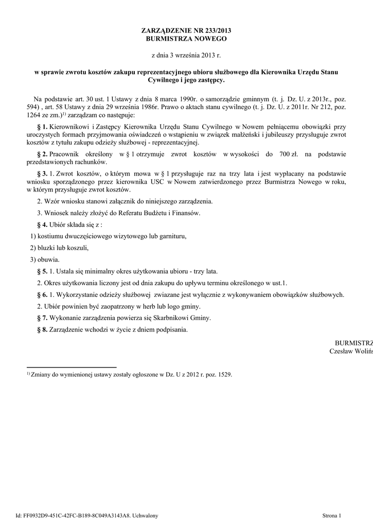 ZARZĄDZENIE NR 233/2013 BURMISTRZA NOWEGO z dnia 3 września 2013 r. w sprawie zwrotu kosztów zakupu reprezentacyjnego ubioru służbowego dla Kierownika Urzędu Stanu Cywilnego i jego zastępcy. Na podstawie art. 30 ust. 1 Ustawy z dnia 8 marca 1990r. o samorządzie gminnym (t. j. Dz. U. z 2013r., poz. 594) , art. 58 Ustawy z dnia 29 września 1986r. Prawo o aktach stanu cywilnego (t. j. Dz. U. z 2011r. Nr 212, poz. 1264 ze zm.)1) zarządzam co następuje: § 1. Kierownikowi i Zastępcy Kierownika Urzędu Stanu Cywilnego w Nowem pełniącemu obowiązki przy uroczystych formach przyjmowania oświadczeń o wstąpieniu w związek małżeński i jubileuszy przysługuje zwrot kosztów z tytułu zakupu odzieży służbowej - reprezentacyjnej. § 2. Pracownik określony w § 1 otrzymuje zwrot kosztów w wysokości do 700 zł. na podstawie przedstawionych rachunków. § 3. 1. Zwrot kosztów, o którym mowa w § 1 przysługuje raz na trzy lata i jest wypłacany na podstawie wniosku sporządzonego przez kierownika USC w Nowem zatwierdzonego przez Burmistrza Nowego w roku, w którym przysługuje zwrot kosztów. 2. Wzór wniosku stanowi załącznik do niniejszego zarządzenia. 3. Wniosek należy złożyć do Referatu Budżetu i Finansów. § 4. Ubiór składa się z : 1) kostiumu dwuczęściowego wizytowego lub garnituru, 2) bluzki lub koszuli, 3) obuwia. § 5. 1. Ustala się minimalny okres użytkowania ubioru - trzy lata. 2. Okres użytkowania liczony jest od dnia zakupu do upływu terminu określonego w ust.1. § 6. 1. Wykorzystanie odzieży służbowej zwiazane jest wyłącznie z wykonywaniem obowiązków służbowych. 2. Ubiór powinien być zaopatrzony w herb lub logo gminy. § 7. Wykonanie zarządzenia powierza się Skarbnikowi Gminy. § 8. Zarządzenie wchodzi w życie z dniem podpisania. BURMISTRZ Czesław Wolińs 1) Zmiany do wymienionej ustawy zostały ogłoszone w Dz. U z 2012 r. poz. 1529. Id: FF0932D9-451C-42FC-B189-8C049A3143A8. Uchwalony Strona 1 Załącznik Nr 1 do Zarządzenia Nr 233/2013 Burmistrza Nowego z dnia 3 września 2013 r. Wniosek o zwrot kosztów poniesionych na sfinansowanie zakupu ubioru służbowego reprezentacyjnego dla Kierownika USC i jego zastępcy. Dane pracownika: Imię i nazwisko: ………………………………………………………………………… Stanowisko ……………………………………………………………………………… Data ostatniej wypłaty /wypłata po raz pierwszy*: …………………….. Wysokość wypłaconego zwrotu kosztów (jeżeli dotyczy): ……………………....…… zł. Główny Księgowy: Wyżej wymieniona osoba spełnia warunki do zwrotu kosztów w wysokości ..………….. zł (słownie złotych …………………………………………………………………………….), który stanowi kwotę określoną zgodnie z § 2 Zarządzenia Nr 233/2013 Burmistrza Nowego z dnia 3 września 2013 r. …………………………… (data, pieczątka i podpis Głównego Księgowego) Id: FF0932D9-451C-42FC-B189-8C049A3143A8. Uchwalony ………………………… (data, pieczątka i podpis Burmistrza Nowego) Strona 2