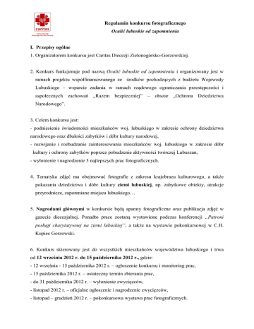 Regulamin konkursu fotograficznego Ocalić lubuskie od zapomnienia I. Przepisy ogólne 1. Organizatorem konkursu jest Caritas Diecezji Zielonogórsko-Gorzowskiej. 2. Konkurs funkcjonuje pod nazwą Ocalić lubuskie od zapomnienia i organizowany jest w ramach projektu współfinansowanego ze środków pochodzących z budżetu Wojewody Lubuskiego – wsparcie zadania w ramach rządowego ograniczania przestępczości i aspołecznych zachowań „Razem bezpieczniej” – obszar „Ochrona Dziedzictwa Narodowego”. 3. Celem konkursu jest: - podniesienie świadomości mieszkańców woj. lubuskiego w zakresie ochrony dziedzictwa narodowego oraz dbałości zabytków i dóbr kultury narodowej, - rozwijanie i rozbudzanie zainteresowania mieszkańców woj. lubuskiego w zakresie dóbr kultury i ochrony zabytków poprzez pobudzenie aktywności twórczej Lubuszan, - wyłonienie i nagrodzenie 3 najlepszych prac fotograficznych. 4. Tematyka zdjęć ma obejmować fotografie z zakresu krajobrazu kulturowego, a także pokazania dziedzictwa i dóbr kultury ziemi lubuskiej, np. zabytkowe obiekty, atrakcje przyrodnicze, zapomniane miejsca lubuskiego… 5. Nagrodami głównymi w konkursie będą aparaty fotograficzne oraz publikacja zdjęć w gazecie diecezjalnej. Ponadto prace zostaną wystawione podczas konferencji „Patroni posługi charytatywnej na ziemi lubuskiej”, a także na wystawie pokonkursowej w C.H. Kupiec Gorzowski. 6. Konkurs skierowany jest do wszystkich mieszkańców województwa lubuskiego i trwa od 12 września 2012 r. do 15 października 2012 r., gdzie: - 12 września - 15 października 2012 r. – ogłoszenie konkursu i monitoring prac, - 15 października 2012 r. – ostateczny termin zbierania prac, - do 31 października 2012 r. – wyłonienie zwycięzców, - listopad 2012 r. – oficjalne ogłoszenie i nagrodzenie zwycięzców, - listopad – grudzień 2012 r. – pokonkursowa wystawa prac fotograficznych. 7. W konkursie może brać udział każdy mieszkaniec województwa lubuskiego, za wyjątkiem organizatorów. Nadesłanie prac na konkurs oznacza akceptację jego warunków, wyrażonych w niniejszym regulaminie. II. Przepisy dotyczące prac 1. Każdy uczestnik może nadesłać maksymalnie 2 fotografie w kolorze lub czarno-białe na nośniku CD lub DVD w maksymalnej wielkości w jakiej zostały zapisane w aparacie lub przynajmniej w formacie 20 x 30 cm i 300 dpi. Organizator zastrzega sobie prawo do wyłączenia z konkursu prac o niskiej jakości technicznej. 2. Fotografie należy nadsyłać na konkurs jako przesyłkę pocztową lub dostarczać osobiście do siedziby Organizatora do dnia 15 października 2012 r. w zamkniętej kopercie – nie zginać!- na adres: Caritas Diecezji Zielonogórsko-Gorzowskiej ul. Czereśniowa 15 66-400 Gorzów Wlkp. Ocalić lubuskie od zapomnienia 3. Każda praca powinna zostać oznaczona na dołączonej kartce: imieniem i nazwiskiem autora, datą urodzenia, adresem zamieszkania i telefonem oraz opisem zdjęcia - gdzie zostało wykonane i co przedstawia. Na pracach nie należy umieszczać żadnych danych. W konkursie mogą brać udział wyłącznie prace autorskie. Fotografie nadesłane po terminie nie będą brane pod uwagę w konkursie. 4. Do koperty zaadresowanej na adres Organizatora z dopiskiem „Konkurs fotograficzny” należy włożyć pracę (prace) oraz kartkę z w/w danymi, a także kartkę z podpisaną z klauzulą: „Wyrażam zgodę na przetwarzanie moich danych osobowych przez Organizatora Konkursu Fotograficznego „Moje życie jest wolne” w celach wynikających z regulaminu tego Konkursu, zgodnie z ustawą z dnia 29 sierpnia 1997 roku o ochronie danych osobowych (Dz. U. z 1997 r., nr 133, poz. 883 z późniejszymi zmianami). Poprzez wysłanie zdjęć na Konkurs nieodpłatnie przenoszę na Organizatora prawo do wykorzystania fotografii w publikacjach oraz stronach internetowych Organizatora”. 5. Osoby niepełnoletnie dołączają dodatkowo pisemną zgodę rodziców lub opiekunów prawnych na udział w konkursie. Jednocześnie rodzice lub opiekunowie podpisują, wraz z biorącym udział w konkursie, oświadczenie, o którym mowa w pkt. II. 6. 6. Organizator zastrzega sobie prawo do dyskwalifikowania prac nie spełniających wymienionych wyżej wymogów. 7. Organizator nie zwraca prac biorących udział w konkursie, prac zdyskwalifikowanych jak również z niego wyłączonych. 8. Organizator powołuje komisję konkursową, która zbierze się do dnia 31 października 2012 r. i wyłoni zwycięzców. 9. Zwycięzcy konkursu zostaną powiadomieni o wynikach przez Organizatora listownie lub telefonicznie. 10. Wyniki konkursu zostaną podane na stronie internetowej Organizatora www.caritas.zgora.pl 11. Ogłoszenie wyników i wręczenie nagród rzeczowych nastąpi w listopadzie 2012 r. III. Wykorzystanie prac nadesłanych na konkurs 1. Organizator uzyskuje prawo do umieszczania nadesłanych na konkurs prac (oznaczonych imieniem i nazwiskiem autora) w lokalnych mediach, a także do wielokrotnej ekspozycji prac nadesłanych na konkurs w różnych miejscach, czy wydawanych przez siebie materiałach. 2. Uprawnienia, o których mowa powyżej przysługują Organizatorowi nieodpłatnie, na podstawie oświadczeń złożonych przez autorów zdjęć, a wymaganych w pkt. II. 6 niniejszego regulaminu. Patronat Więcej informacji udziela: Anita Łukowiak Caritas Diecezji Zielonogórsko-Gorzowskiej ul. Czereśniowa 15 66-400 Gorzów Wlkp. tel. 600 988 632 lub 95 722 91 92 w godz. 7.00 – 15.00