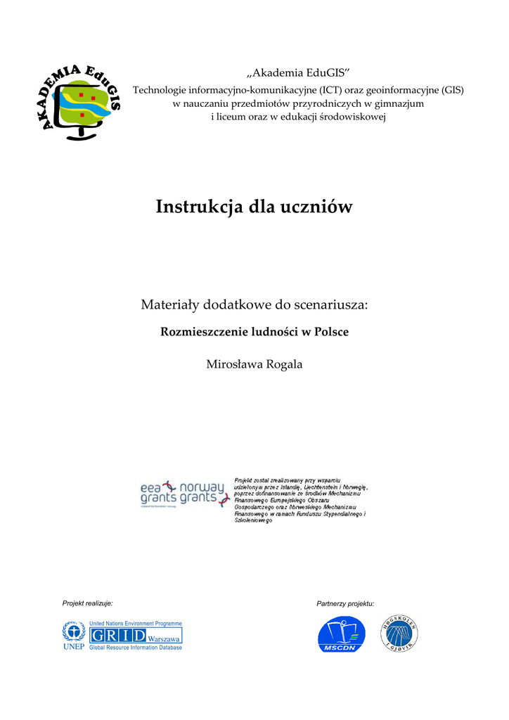 „Akademia EduGIS” Technologie informacyjno-komunikacyjne (ICT) oraz geoinformacyjne (GIS) w nauczaniu przedmiotów przyrodniczych w gimnazjum i liceum oraz w edukacji środowiskowej Instrukcja dla uczniów Materiały dodatkowe do scenariusza: Rozmieszczenie ludności w Polsce Mirosława Rogala Projekt realizuje: Partnerzy projektu: Przygotowanie danych statystycznych Zespół 1 W KRAINIE STATYSTYKI Zadanie : Wyszukiwanie danych w różnych źródłach GĘSTOŚCI ZALUDNIENIA W WYBRANYCH KRAJACH ŚWIATA I EUROPY 1. Wyszukaj dane. Zapisz w tabelce. Odnotuj rok, którego dotyczą dane i źródło. Wyszczególnienie Gęstość Dane za zaludnienia rok źródło Świat Państwo świata o największej gęstości zaludnienia …………………………. Państwo świata o najmniejszej gęstości zaludnienia ……………………………… Europa Państwo Europy o największej gęstości zaludnienia ……………………………….. Państwo Europy o najmniejszej gęstości zaludnienia ……………………………… Tu możesz szukać: Rocznik Statystyczny, Świat w liczbach, www.viking.edu.pl 2. Zestawienie wydrukuj/ zapisz jako slajd ppt. 2 Zespół 2 W KRAINIE STATYSTYKI Zadanie : Wyszukiwanie danych w Banku Danych Lokalnych GĘSTOŚĆ ZALUDNIENIA WEDŁUG WOJEWÓDZTW Bank Danych Lokalnych znajduje się na stronie http://www.stat.gov.pl/bdl 1. Na stronie głównej wybierz: Tablice Wg podgrup cech Dla jednostki podziału terytorialnego Wybrane cechy w latach Ranking jednostek terytorialnych 2. W oknie: Dane według podgrup cech wybierz kolejno: ⇒ LUDNOŚĆ ⇒ STAN LUDNOŚCI I RUCH NATURALNY (NTS-5) ⇒ Wskaźniki modułu gminnego (NTS-5) ⇒ Dalej 3. W kolejnym oknie zaznacz: ⇒ Wybór jednostek terytorialnych z drzewa ⇒ Województwa 4. Następnie zakres przedmiotowy ⇒ Gęstość zaludnienia ⇒ Lata 2002-2009 ⇒ Dalej 5. Wygenerowaną tabelę zapisz jako arkusz Excel. 6. Wykorzystując narzędzia Excela uporządkuj dane. 7. Zestawienie wydrukuj/ zapisz jako slajd ppt 3 Zespół 3 W KRAINIE STATYSTYKI Zadanie : Wyszukiwanie danych w Banku Danych Lokalnych GĘSTOŚĆ ZALUDNIENIA W WOJEWÓDZTWIE MAZOWIECKIM WEDŁUG POWIATÓW Bank Danych Lokalnych znajduje się na stronie http://www.stat.gov.pl/bdl 1. Na stronie głównej wybierz: Tablice Wg podgrup cech Dla jednostki podziału terytorialnego Wybrane cechy w latach Ranking jednostek terytorialnych 2. W oknie : Dane według podgrup cech wybierz kolejno: ⇒ LUDNOŚĆ ⇒ STAN LUDNOŚCI I RUCH NATURALNY (NTS-5) ⇒ Wskaźniki modułu gminnego (NTS-5) ⇒ Dalej 3. W kolejnym oknie zaznacz: ⇒ Wybór jednostek terytorialnych wg nZS ⇒ Region centralny -rozwiń menu, wybierz ⇒ Województwo mazowieckie ⇒ Podregiony – rozwijaj kolejno menu wybierając tylko ⇒ powiaty 4. Następnie zakres przedmiotowy ⇒ ludność na 1km 2 (gęstość zaludnienia) ⇒ Rok 2009 ⇒ Dalej 4 5. Wygenerowaną tabelę zapisz jako arkusz Excel 6. Wykorzystując narzędzia Excela uporządkuj dane 7. Zestawienie wydrukuj/ zapisz jako slajd ppt Czy wiesz, że… Największym skupiskiem ludności w kraju jest Warszawa. W granicach administracyjnych miasta, na powierzchni 495 km2, mieszka 1 mln 630 tys. osób, a w całej aglomeracji Warszawskiej, blisko 2,5 mln. Najgęściej zaludnione jest śródmieście Warszawy, gdzie na 1 km2 przypada 10 tys. mieszkańców, czyli tyle, ile w największych aglomeracjach świata 5 Zespół 4 W KRAINIE STATYSTYKI Zadanie : Wyszukiwanie danych w Banku Danych Lokalnych GĘSTOŚĆ ZALUDNIENIA W POWIECIE SOCHACZEWSKIM WEDŁUG GMIN Bank Danych Lokalnych znajduje się na stronie http://www.stat.gov.pl/bdl 1. Na stronie głównej wybierz: Tablice Wg podgrup cech Dla jednostki podziału terytorialnego Wybrane cechy w latach Ranking jednostek terytorialnych 2. W oknie: Dane według podgrup cech wybierz kolejno: ⇒ LUDNOŚĆ ⇒ STAN LUDNOŚCI I RUCH NATURALNY (NTS-5) ⇒ Wskaźniki modułu gminnego (NTS-5) ⇒ Dalej 3. W kolejnym oknie zaznacz: ⇒ Wybór jednostek terytorialnych wg nZS ⇒ Region centralny -rozwiń menu, wybierz ⇒ Województwo mazowieckie ⇒ Podregion– warszawski zachodni ⇒ Powiat sochaczewski -rozwijaj kolejno menu wybierając tylko ⇒ Gminy 4. Następnie zakres przedmiotowy ⇒ ludność na 1km 2 (gęstość zaludnienia) ⇒ Rok 2009 ⇒ Dalej 6 5. Wygenerowaną tabelę zapisz jako arkusz Excel 6. Wykorzystując narzędzia Excela uporządkuj dane 7. Zestawienie wydrukuj/ zapisz jako slajd ppt Zespół 5 W KRAINIE INTERNETU Zadanie : Wyszukiwanie map Na kolejnej lekcji geografii poznasz rozmieszczenie ludności Polski. Przejrzyj wskazane adresy internetowe. Wyszukaj mapy ludności. Zapisz je w folderze MAPY. Pamiętaj o podaniu źródła: Interaktywny Atlas Polski http://maps.igipz.pan.pl/aims/home_pl.htm Opracowania tematyczne dla woj. mazowieckiego http://www.wrotamazowsza.pl/msip_main/showGroup?groupId=5 7