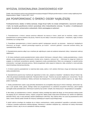 WYDZIAŁ DOSKONALENIA ZAWODOWEGO KSP Źródło: http://szkolenia.policja.waw.pl/wdz/informacje/psychologia/27359,Jak-poinformowac-o-smierci-osoby-najblizszej.html Wygenerowano: Piątek, 3 marca 2017, 14:47 JAK POINFORMOWAĆ O ŚMIERCI OSOBY NAJBLIŻSZEJ Funkcjonariusze, będąc w takiej sytuacji, mogą liczyć tylko na swoje umiejętności, wyczucie sytuacji i takt, bo każda gwałtowna śmierć powoduje silne indywidualne emocje. To jedno z trudniejszych zadań. Są jednak uniwersalne wskazówki, które pomagają je wykonać: 1. Powiadamianie o śmierci zawsze powinno odbywać się twarzą w twarz. Jeżeli jest to możliwe, należy unikać powiadamiania za pomocą telefonu lub poczty. Powinno się ono odbyć w otoczeniu przyjaznym – mieszkaniu, nigdy na klatce schodowej czy w progu drzwi. 2. Prawidłowe powiadamianie o śmierci powinno spełnić następujące warunki: po pierwsze – dostarczyć niezbędnych informacji, po drugie – udzielić pierwszego wsparcia, po trzecie – ochronić godność i szacunek zarówno ofiary, jak i powiadamianej rodziny. 3. Powiadomienie powinno odbyć się w możliwie jak najkrótszym czasie od ustalenia tożsamości ofiary i tożsamości osób jej najbliższych. 4. W miarę możliwości przed powiadomieniem należy zebrać informacje o relacjach ofiary z osobą powiadamianą, o stanie zdrowia osoby powiadamianej (ewentualne choroby serca, krążenia, cukrzyca itp.) – informacje te mogą być istotne ze względu na możliwość przewidzenia sposobu reagowania osoby powiadamianej. Może ona zareagować w sposób bardzo emocjonalny i wymagać pierwszej pomocy. Warto przygotować sobie wsparcie medyczne, żeby umożliwić w razie potrzeby natychmiastową interwencję lekarską. 5. O śmierci powinny powiadamiać co najmniej dwie osoby. Jedna z nich udziela informacji, druga zaś obserwuje reakcje osoby powiadamianej. 6. Zawiadomienie powinno być możliwie jak najprostsze w treści, bez „owijania w bawełnę” i dorabiania różnych historii. Np. „Mam dla pani/pana bardzo/złą wiadomość. Pani/pana bliski nie żyje”. Powinno się wyrazić współczucie i zrozumienie. Tak jak w przypadku składania kondolencji. Należy zachować się empatycznie, w razie potrzeby udzielić wsparcia, np. objąć ofiarę, podać chusteczkę. 7. Osoby powiadamiane często czują potrzebę dowiedzenia się szczegółów dotyczących śmierci bliskiego, okoliczności itp. (jak, w jaki sposób, kiedy, gdzie), dlatego należy być przygotowanym na udzielenie wszystkich informacji, jakich będzie wymagała osoba powiadamiana. Informacje te powinny być proste i zwięzłe, bez drastycznych i drugorzędnych szczegółów. 8. Nie należy, po zawiadomieniu o śmierci, zostawiać rodziny zmarłego bez opieki tak długo, aż minie pierwsza reakcja (szok) lub pojawią się inni członkowie rodziny, znajomi, przyjaciele. Należy podać swoje dane kontaktowe (np. telefon do najbliższej jednostki Policji), aby w razie potrzeby udzielić dodatkowych informacji. Aby rodzina ofiary nie czuła się pozostawiona sama sobie, można również podać kontakt do instytucji udzielających wsparcia psychologicznego. 9. Jeżeli rodzina zmarłego nie znajduje się w miejscu zamieszkania, należy powiadomić sąsiadów o potrzebie kontaktu z rodziną (z powodu wydarzenia nadzwyczajnego, interwencji z udziałem medyków itp.), natomiast nie należy informować sąsiadów o śmierci, aby to nie oni zawiadomili rodzinę zmarłego. na podstawie materiałów wykładowych „Interwencja kryzysowa i negocjacje” Dariusz Piotrowicz, KWP w Bydgoszczy oprac. Małgorzata Osowska Sekcja Psychologów KWP w Bydgoszczy Materiał stanowi przedruk z miesięcznika POLICJA 997 Ocena: 0/5 (0) Tweetnij