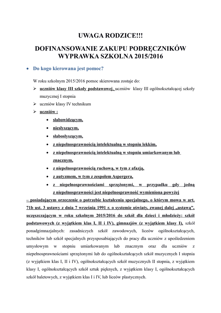 UWAGA RODZICE!!! DOFINANSOWANIE ZAKUPU PODRĘCZNIKÓW WYPRAWKA SZKOLNA 2015/2016 Do kogo kierowana jest pomoc? W roku szkolnym 2015/2016 pomoc skierowana zostaje do: uczniów klasy III szkoły podstawowej, uczniów klasy III ogólnokształcącej szkoły muzycznej I stopnia uczniów klasy IV technikum uczniów : słabowidzącym, niesłyszącym, słabosłyszącym, z niepełnosprawnością intelektualną w stopniu lekkim, z niepełnosprawnością intelektualną w stopniu umiarkowanym lub znacznym, z niepełnosprawnością ruchową, w tym z afazją, z autyzmem, w tym z zespołem Aspergera, z niepełnosprawnościami sprzężonymi, w przypadku gdy jedną z niepełnosprawności jest niepełnosprawność wymieniona powyżej – posiadającym orzeczenie o potrzebie kształcenia specjalnego, o którym mowa w art. 71b ust. 3 ustawy z dnia 7 września 1991 r. o systemie oświaty, zwanej dalej „ustawą”, uczęszczającym w roku szkolnym 2015/2016 do szkół dla dzieci i młodzieży: szkół podstawowych (z wyjątkiem klas I, II i IV), gimnazjów (z wyjątkiem klasy I), szkół ponadgimnazjalnych: zasadniczych szkół zawodowych, liceów ogólnokształcących, techników lub szkół specjalnych przysposabiających do pracy dla uczniów z upośledzeniem umysłowym w stopniu umiarkowanym lub znacznym oraz dla uczniów z niepełnosprawnościami sprzężonymi lub do ogólnokształcących szkół muzycznych I stopnia (z wyjątkiem klas I, II i IV), ogólnokształcących szkół muzycznych II stopnia, z wyjątkiem klasy I, ogólnokształcących szkół sztuk pięknych, z wyjątkiem klasy I, ogólnokształcących szkół baletowych, z wyjątkiem klas I i IV, lub liceów plastycznych. Jakie warunki należy spełnić aby otrzymać „Wyprawkę szkolną”? Zgodnie z założeniami programu w roku 2015 pomoc w formie dofinansowania zakupu podręczników a w przypadku uczniów z niepełnosprawnością intelektualną w stopniu umiarkowanym lub znacznym oraz uczniów z niepełnosprawnościami sprzężonymi, w przypadku gdy jedną z niepełnosprawności jest niepełnosprawność intelektualna w stopniu umiarkowanym lub znacznym – także zakupu materiałów edukacyjnych, uczeń może otrzymać tylko ze względu na jedno z trzech wyszczególnionych poniżej kryteriów: 1. uczniom pochodzącym z rodzin, , w których dochód na osobę w rodzinie nie przekracza kryterium dochodowego na osobę w rodzinie, o którym mowa w art. 5 ust. 1 ustawy z dnia 28 listopada 2003 r. o świadczeniach rodzinnych (Dz. U. z 2015 r. poz. 114 i 693), w wysokości obowiązującej w dniu wejścia w życie rozporządzenia. 2. uczniom pochodzącym z rodzin niespełniających kryterium dochodowego na osobę w rodzinie, o którym mowa w art. 7 ustawy z dnia 12 marca 2004 r. o pomocy społecznej (Dz. U. z 2015 r.poz. 163 i 693) na podstawie decyzji dyrektora szkoły, do której uczęszcza uczeń, uwzględniającej warunki lokalne, ekonomiczne i społeczne. Zgodnie z art. 7 tejże ustawy pomoc może być udzielona osobom i rodzinom w szczególności z powodu: ubóstwa, niepełnosprawności, długotrwałej sieroctwa, lub bezdomności, ciężkiej bezrobocia, choroby, przemocy w rodzinie, potrzeby ochrony ofiar handlu ludźmi, potrzeby ochrony macierzyństwa lub wielodzietności, bezradności w sprawach opiekuńczo-wychowawczych i prowadzenia gospodarstwa domowego, wielodzietnych, braku zwłaszcza umiejętności w w rodzinach przystosowaniu niepełnych do życia lub młodzieży opuszczającej całodobowe placówki opiekuńczo-wychowawcze, trudności w integracji cudzoziemców, którzy uzyskali w Rzeczypospolitej Polskiej status uchodźcy lub ochronę uzupełniającą, trudności w przystosowaniu do życia po zwolnieniu z zakładu karnego, alkoholizmu lub narkomanii, zdarzenia losowego i sytuacji kryzysowej, klęski żywiołowej lub ekologicznej. Liczba uczniów, którym zostanie udzielona pomoc w tym trybie nie może przekroczyć w danej gminie 5% ogólnej liczby uczniów klas III szkoły podstawowej, klas III ogólnokształcącej szkoły muzycznej I stopnia i klas IV technikum, z wyjątkiem szkół prowadzonych przez ministra właściwego do spraw kultury i ochrony dziedzictwa narodowego oraz ministra właściwego do spraw rolnictwa. Ww. liczba uczniów obejmuje również uczniów szkół prowadzonych przez ministra właściwego do spraw środowiska oraz Ministra Obrony Narodowej. 3. niezależnie od dochodu uczniom niepełnosprawnym: a. słabowidzącym, b. niesłyszącym, c. słabosłyszącym, d. z niepełnosprawnością intelektualną w stopniu lekkim, e. z niepełnosprawnością intelektualną w stopniu umiarkowanym lub znacznym, f. z niepełnosprawnością ruchową, w tym z afazją, g. z autyzmem, w tym z zespołem Aspergera, h. z niepełnosprawnościami sprzężonymi, w przypadku gdy jedną z niepełnosprawności jest niepełnosprawność wymieniona powyżej – posiadającym orzeczenie o potrzebie kształcenia specjalnego, o którym mowa w art. 71b ust. 3 ustawy z dnia 7 września 1991 r. o systemie oświaty, uczęszczającym w roku szkolnym 2015/2016 do szkół dla dzieci i młodzieży: szkół podstawowych, z wyjątkiem klas I, II i IV, gimnazjów, z wyjątkiem klasy I, szkół ponadgimnazjalnych: zasadniczych szkół zawodowych, liceów ogólnokształcących, techników lub szkół specjalnych przysposabiających do pracy dla uczniów z upośledzeniem umysłowym w stopniu umiarkowanym lub znacznym oraz dla uczniów z niepełnosprawnościami sprzężonymi lub do ogólnokształcących szkół muzycznych I stopnia, z wyjątkiem klas I, II i IV, ogólnokształcących szkół muzycznych II stopnia, z wyjątkiem klasy I, ogólnokształcących szkół sztuk pięknych, z wyjątkiem klasy I, ogólnokształcących szkół baletowych, z wyjątkiem klas I i IV, lub liceów plastycznych. W przypadku uczniów z niepełnosprawnością intelektualną w stopniu umiarkowanym lub znacznym oraz uczniów z niepełnosprawnościami sprzężonymi, w przypadku 